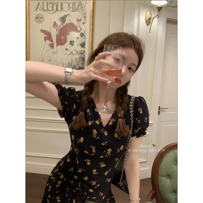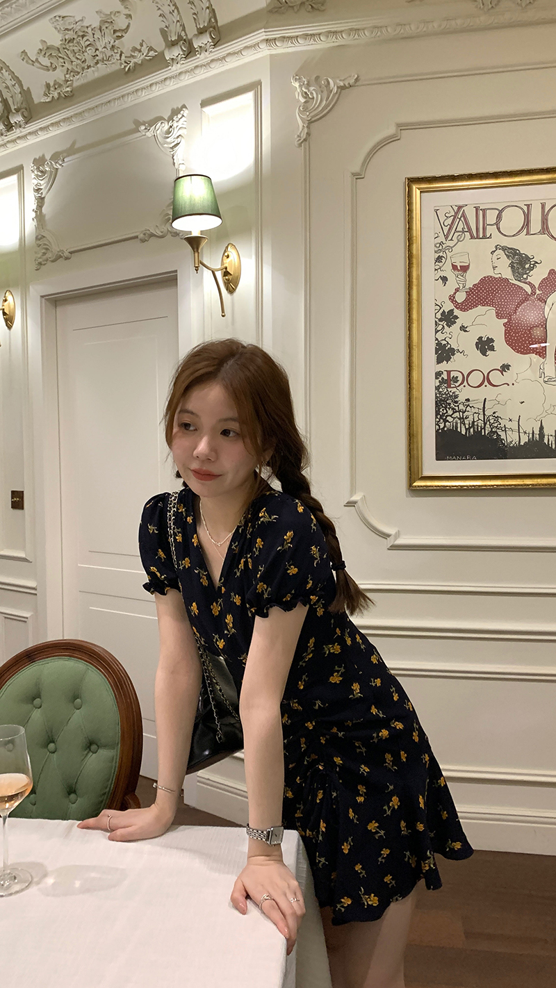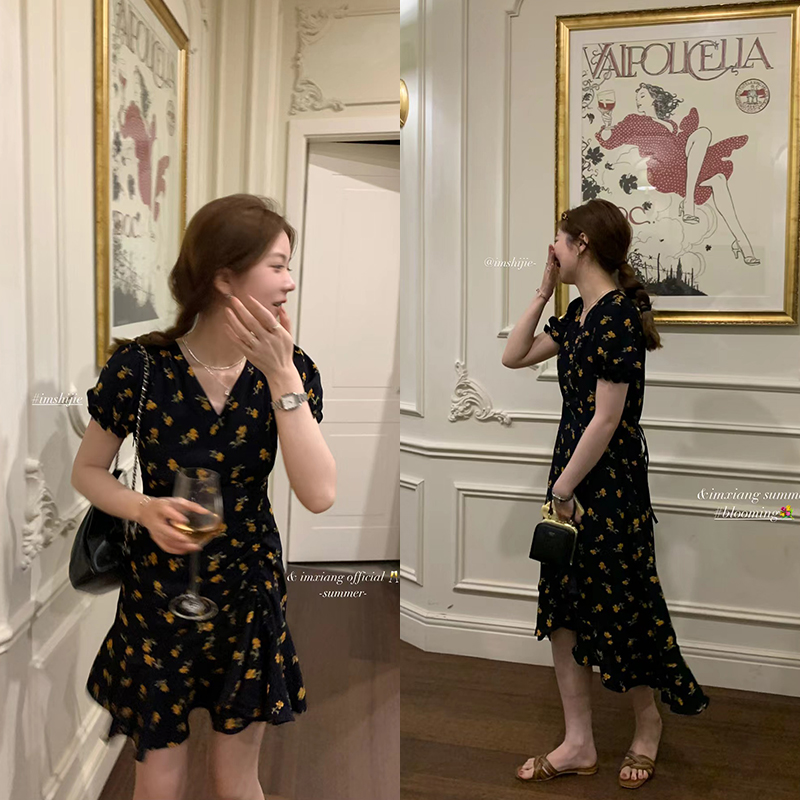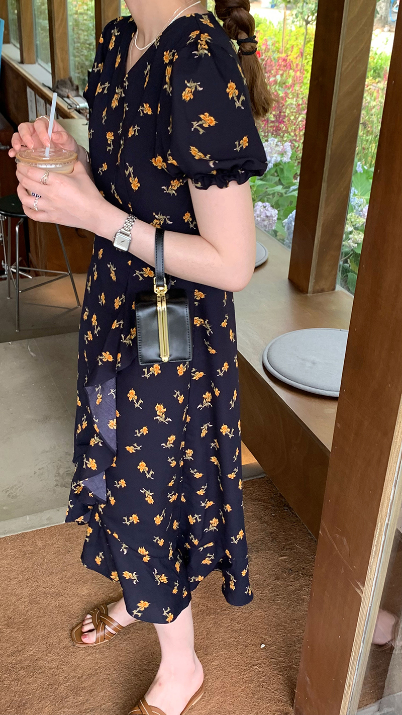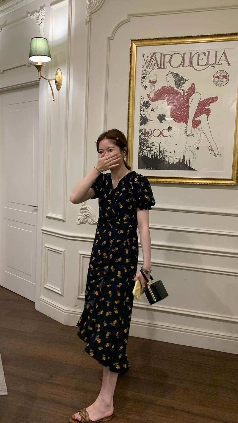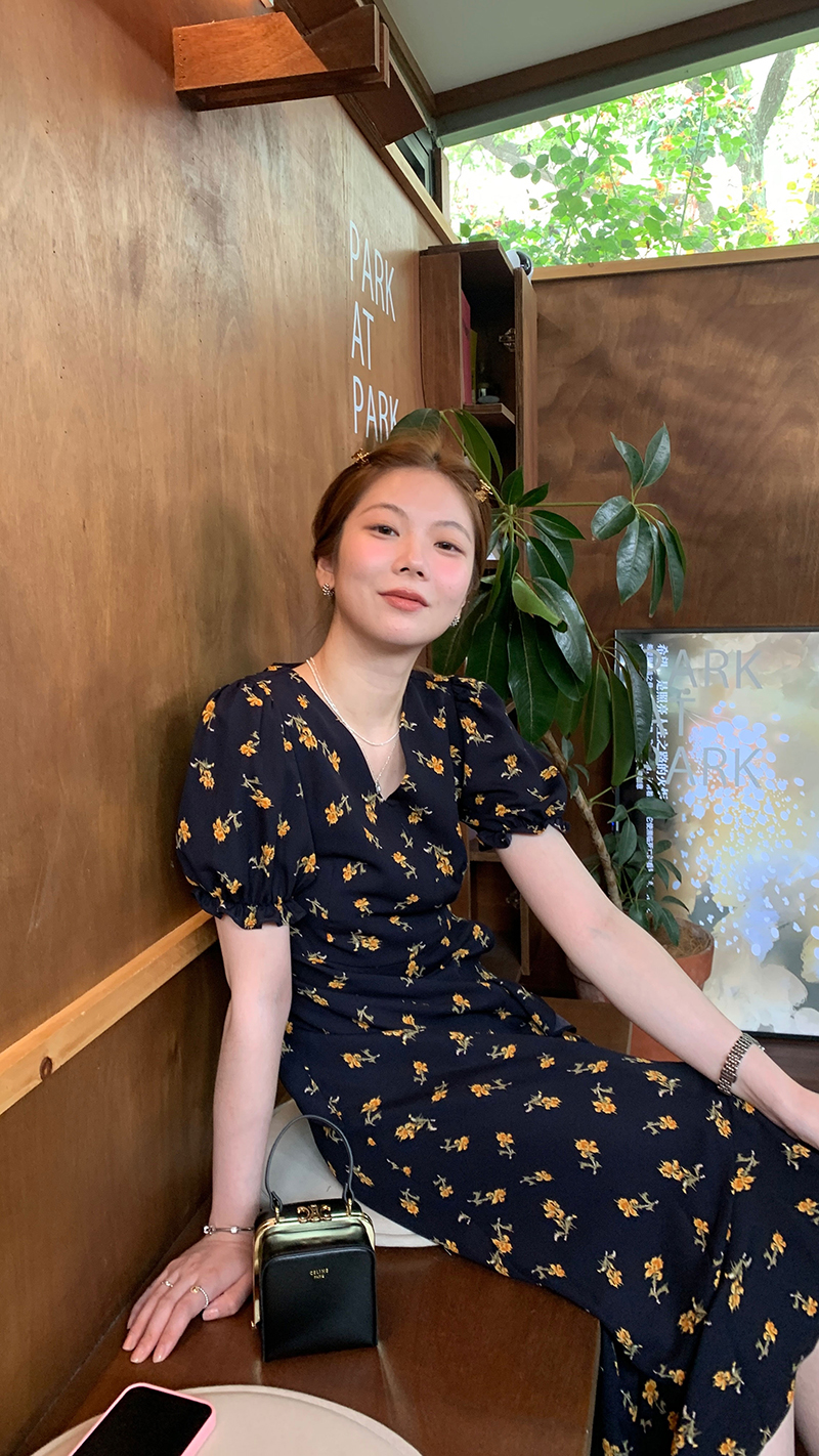 【現貨】im向油畫小黃花V領泡泡袖洋裝不規則荷葉邊甜美碎花裙