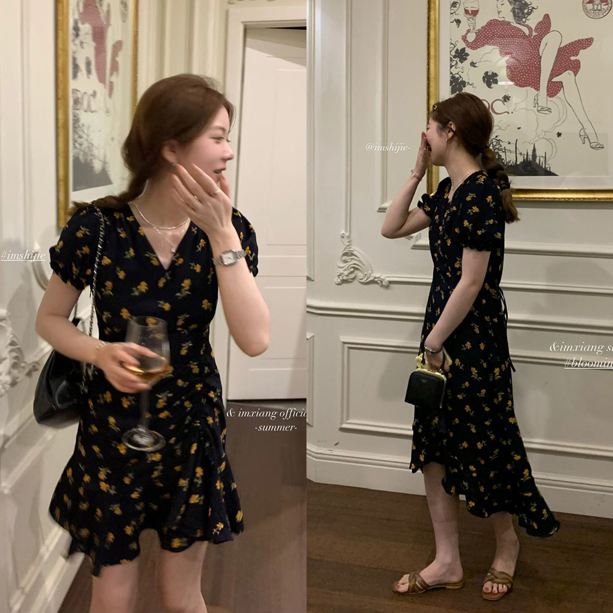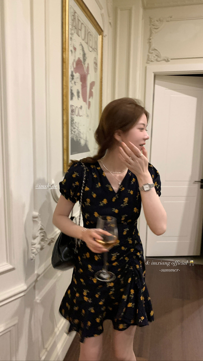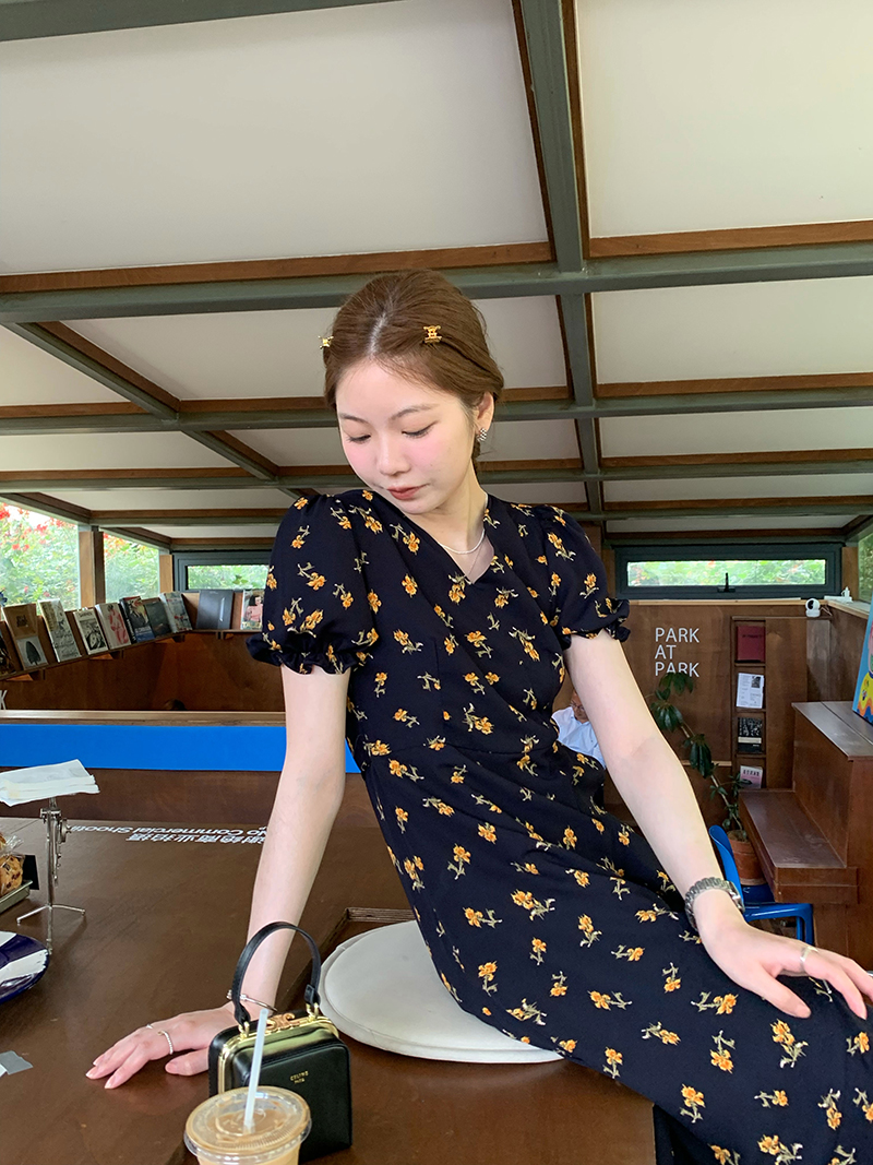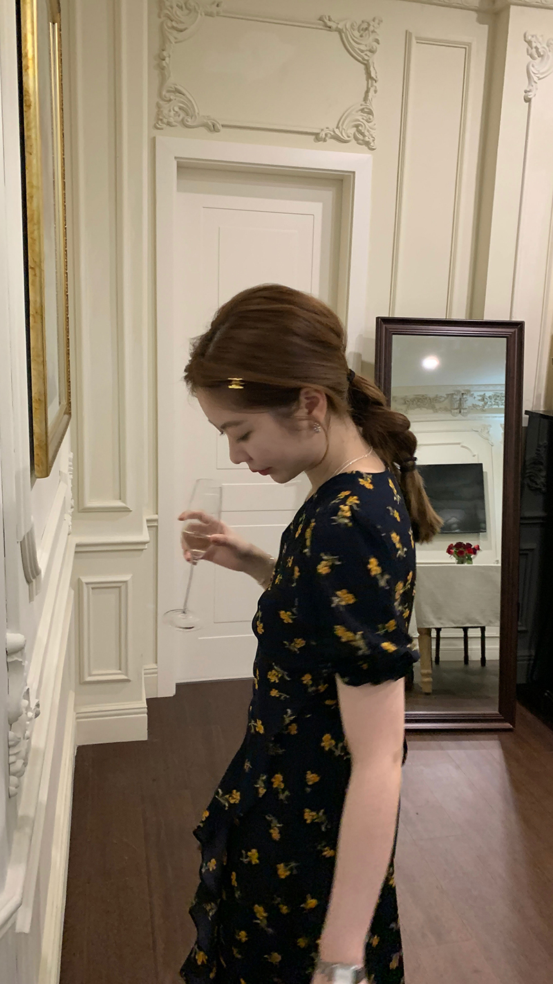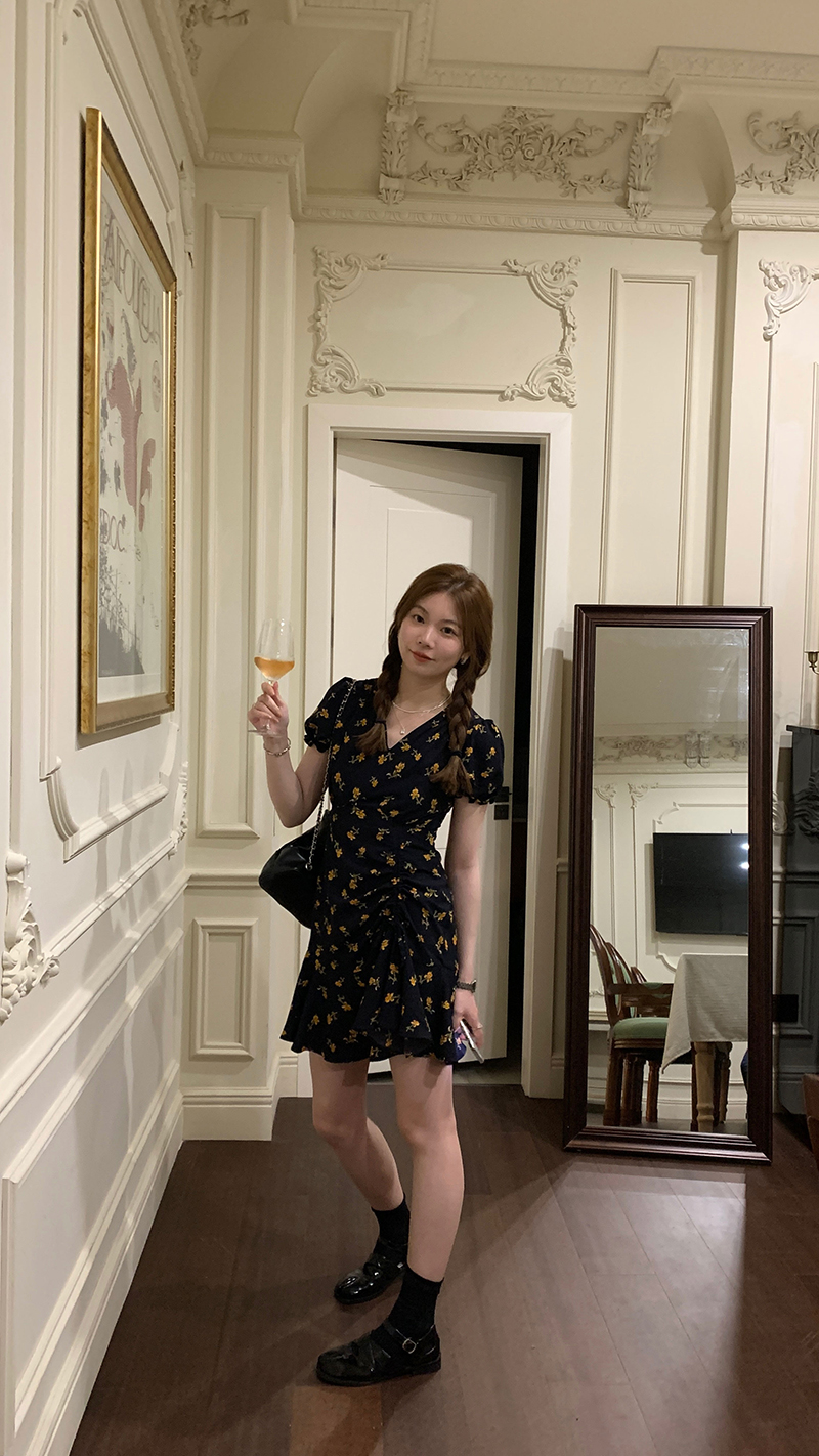 【現貨】im向油畫小黃花V領泡泡袖洋裝不規則荷葉邊甜美碎花裙