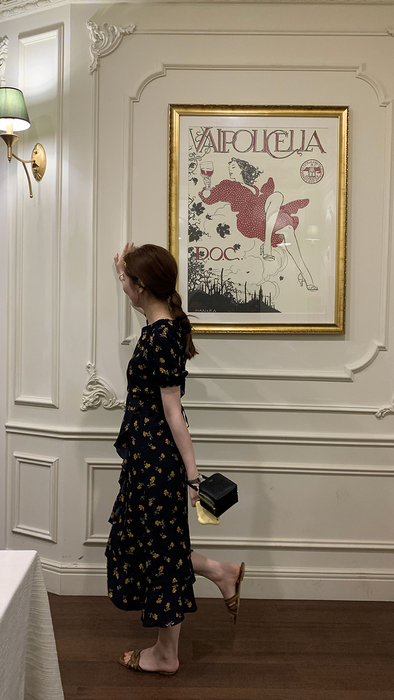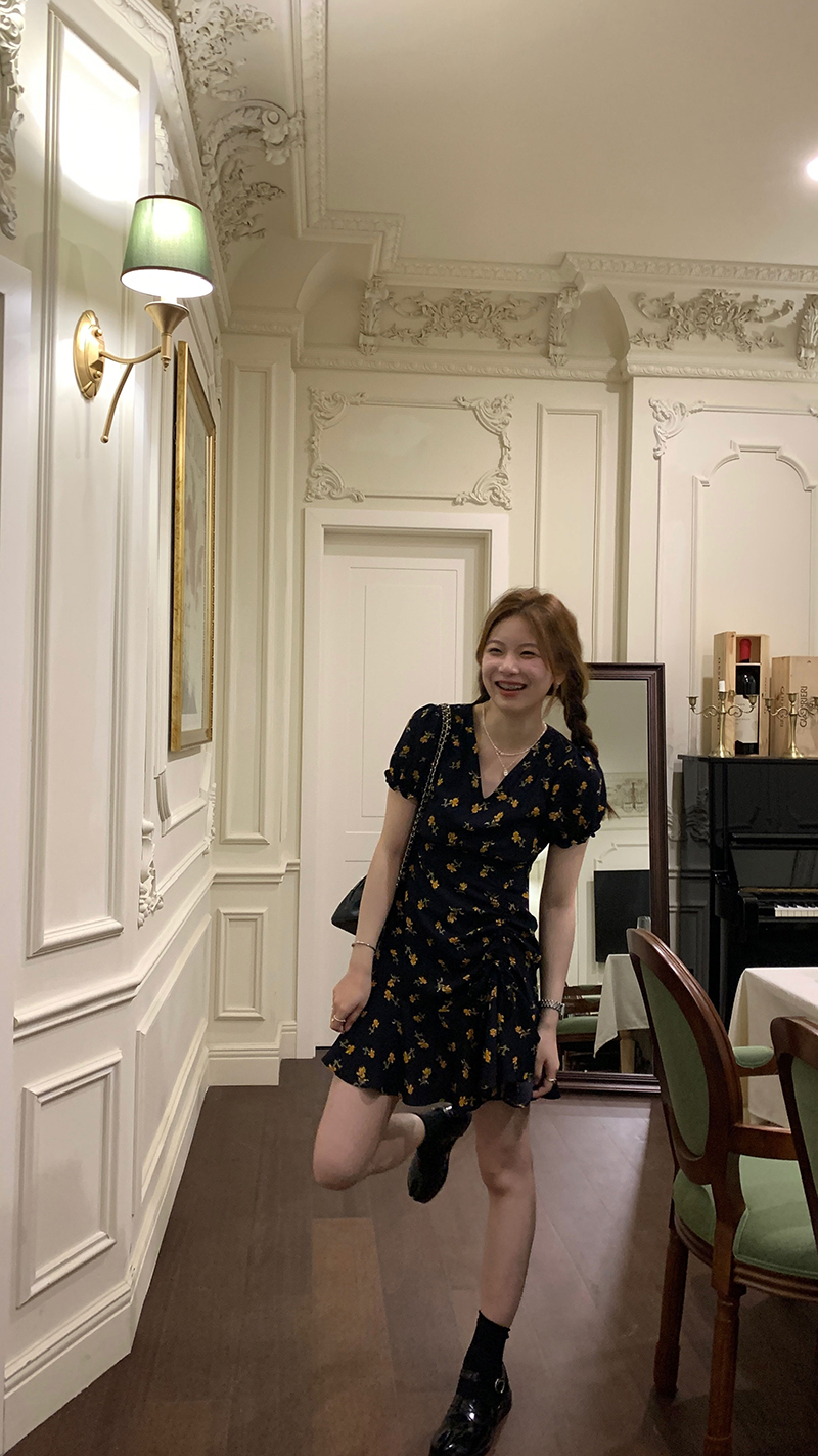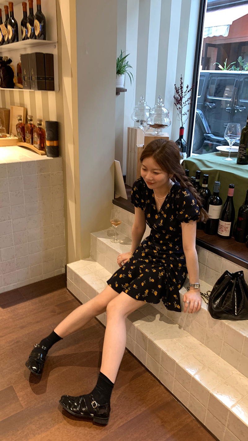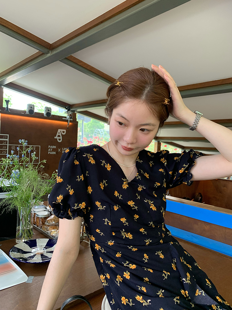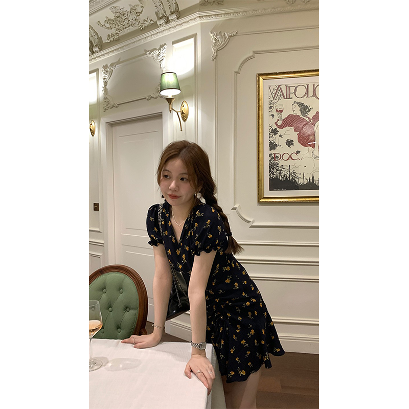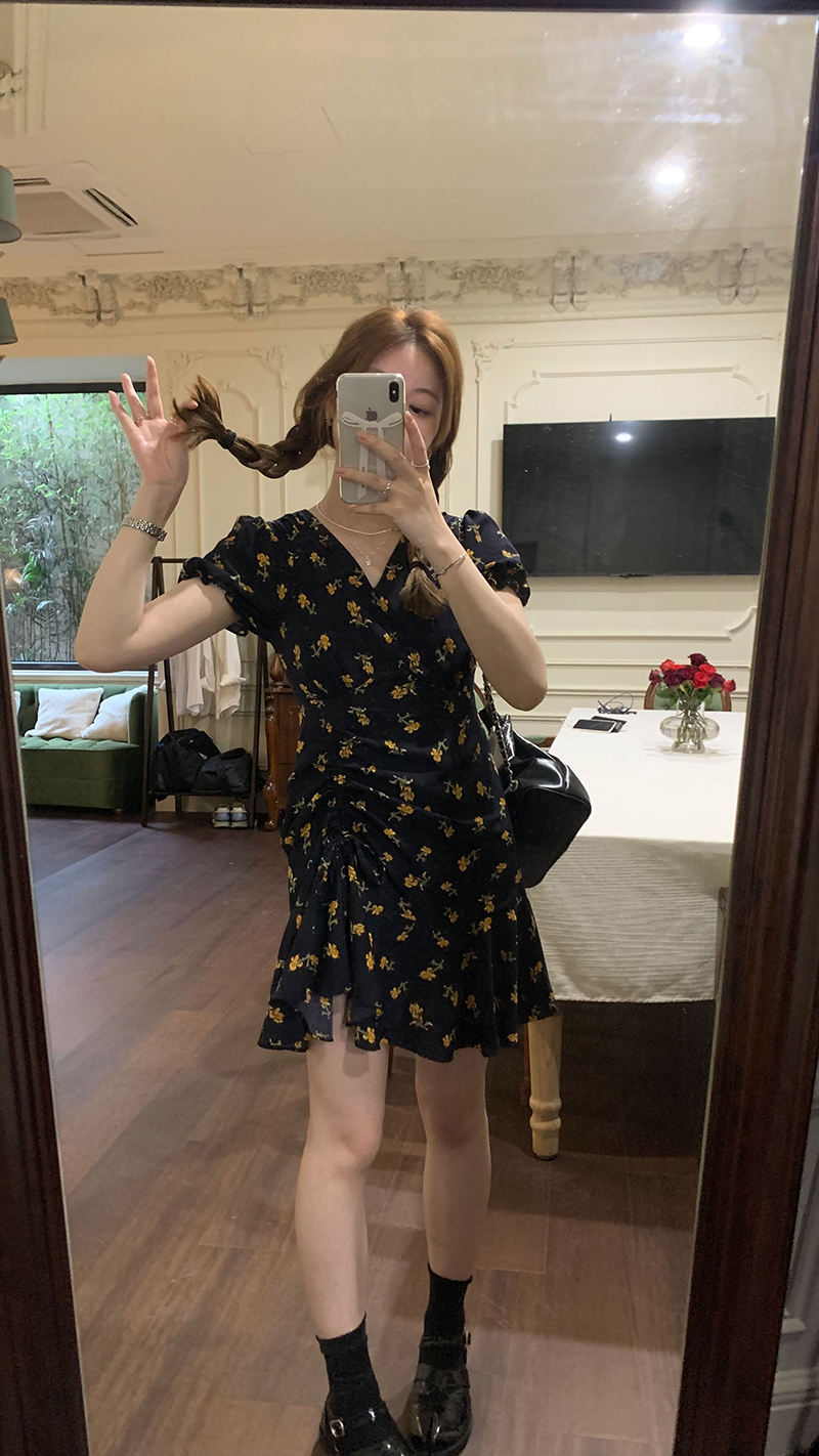 【現貨】im向油畫小黃花V領泡泡袖洋裝不規則荷葉邊甜美碎花裙