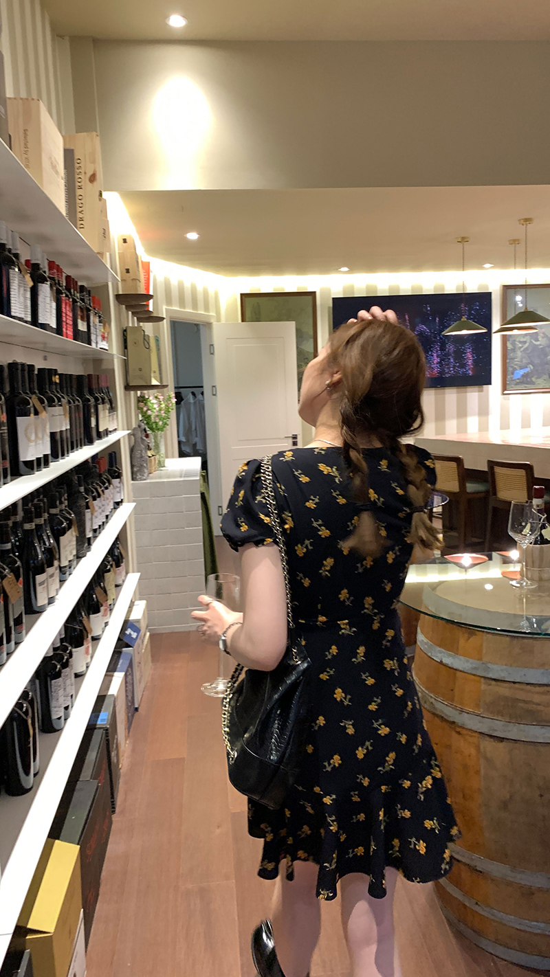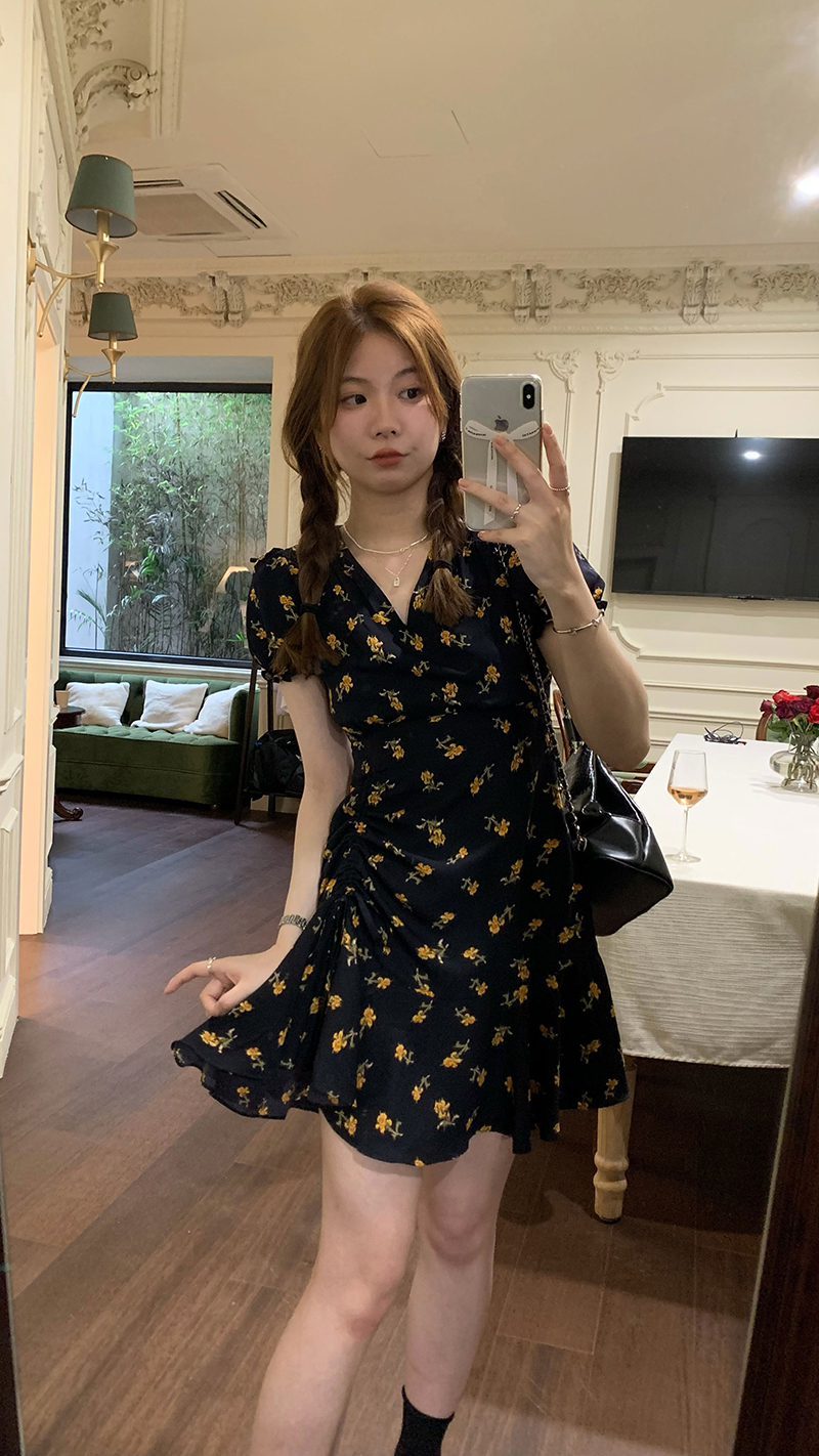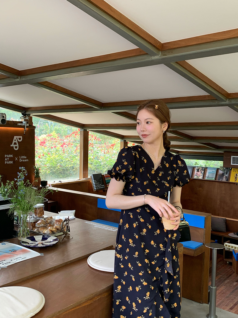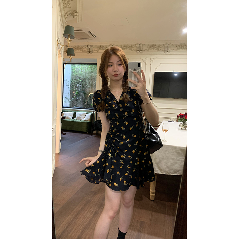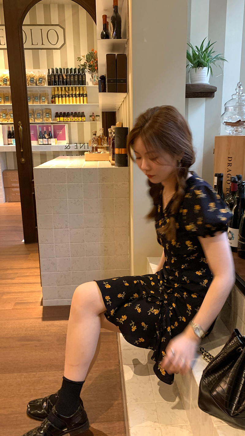 【現貨】im向油畫小黃花V領泡泡袖洋裝不規則荷葉邊甜美碎花裙