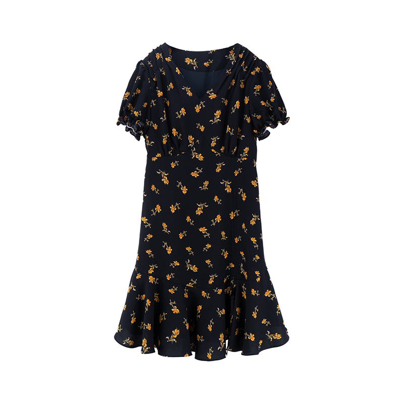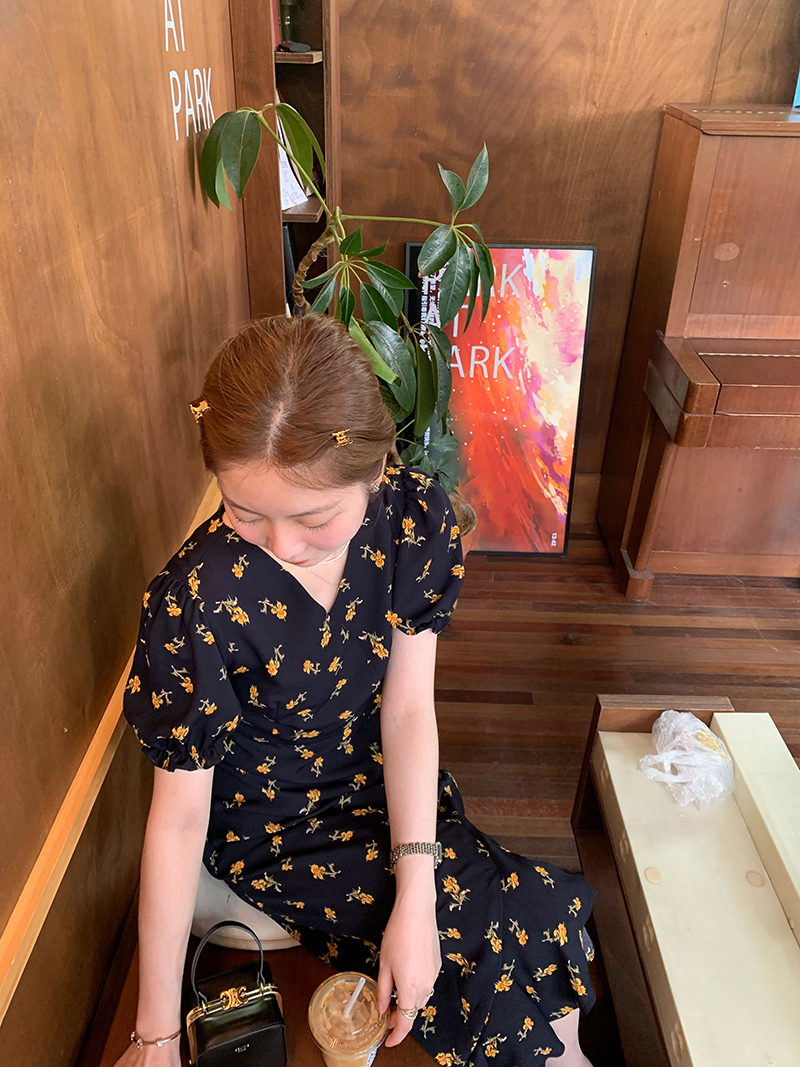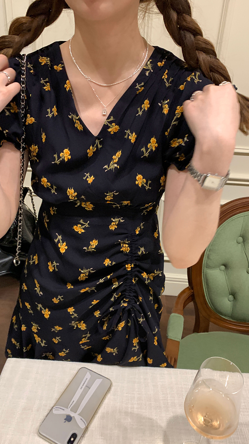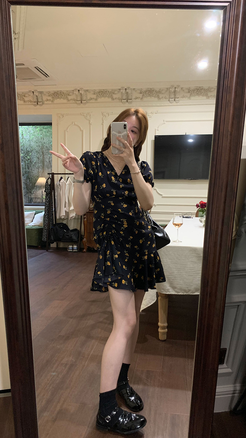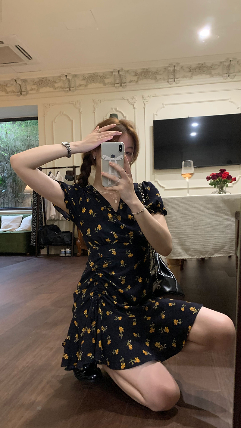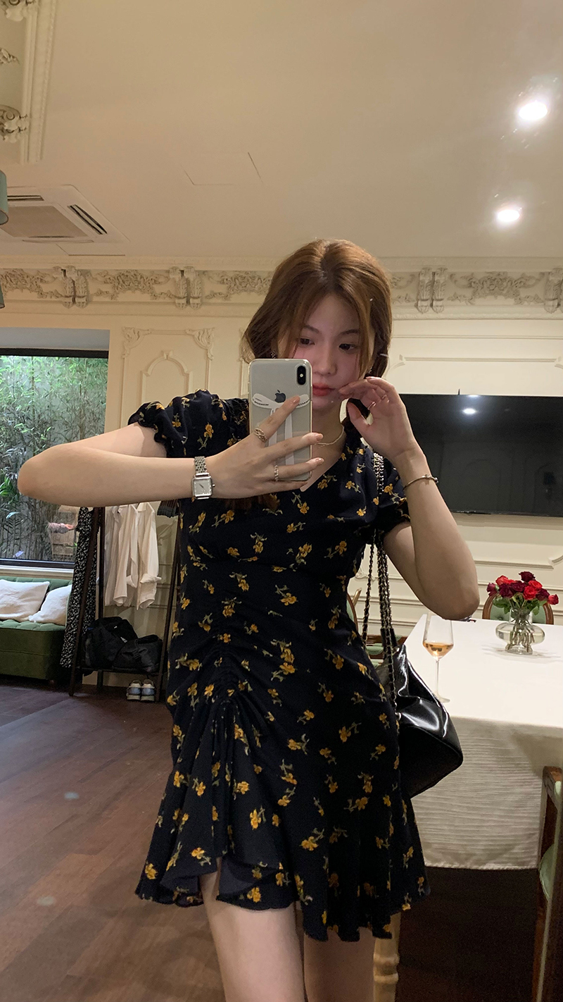 【現貨】im向油畫小黃花V領泡泡袖洋裝不規則荷葉邊甜美碎花裙