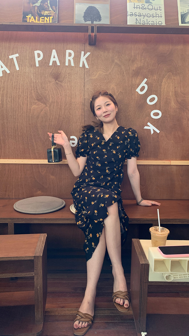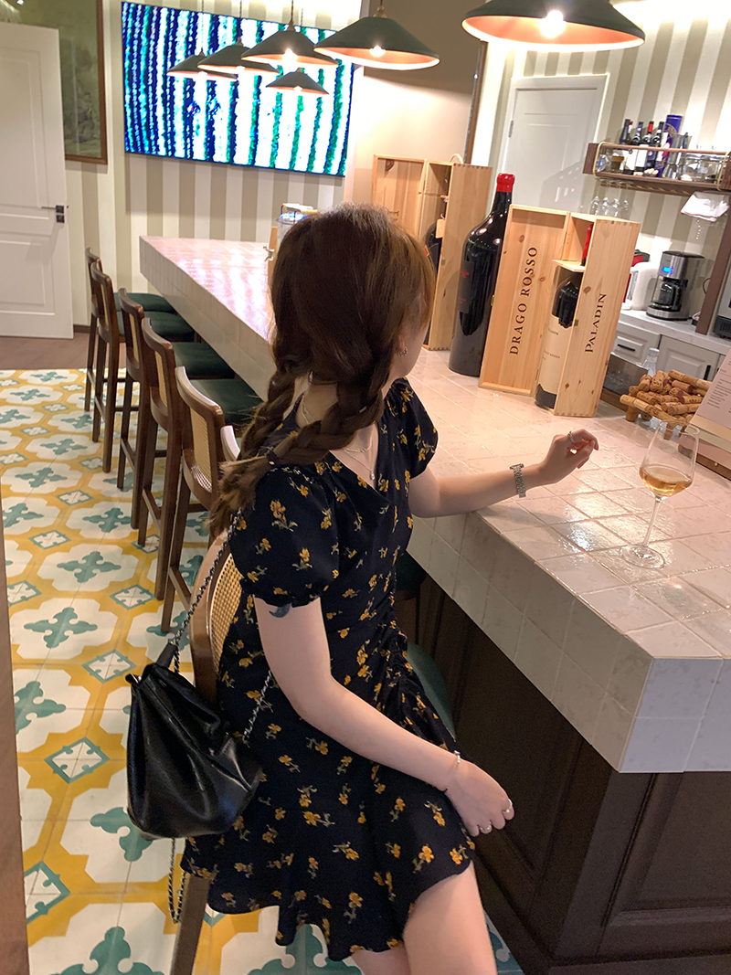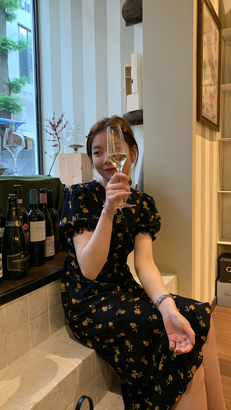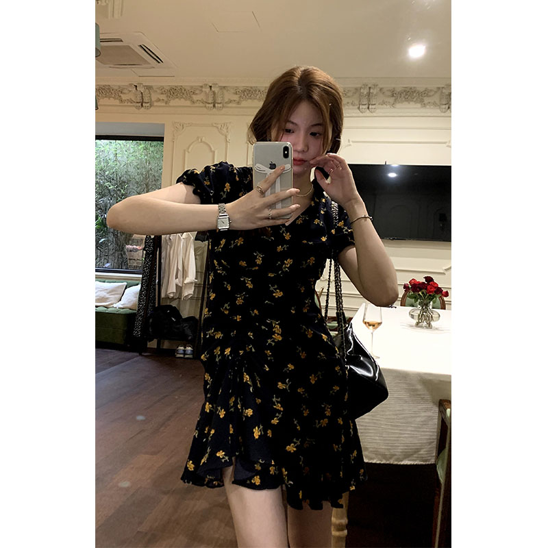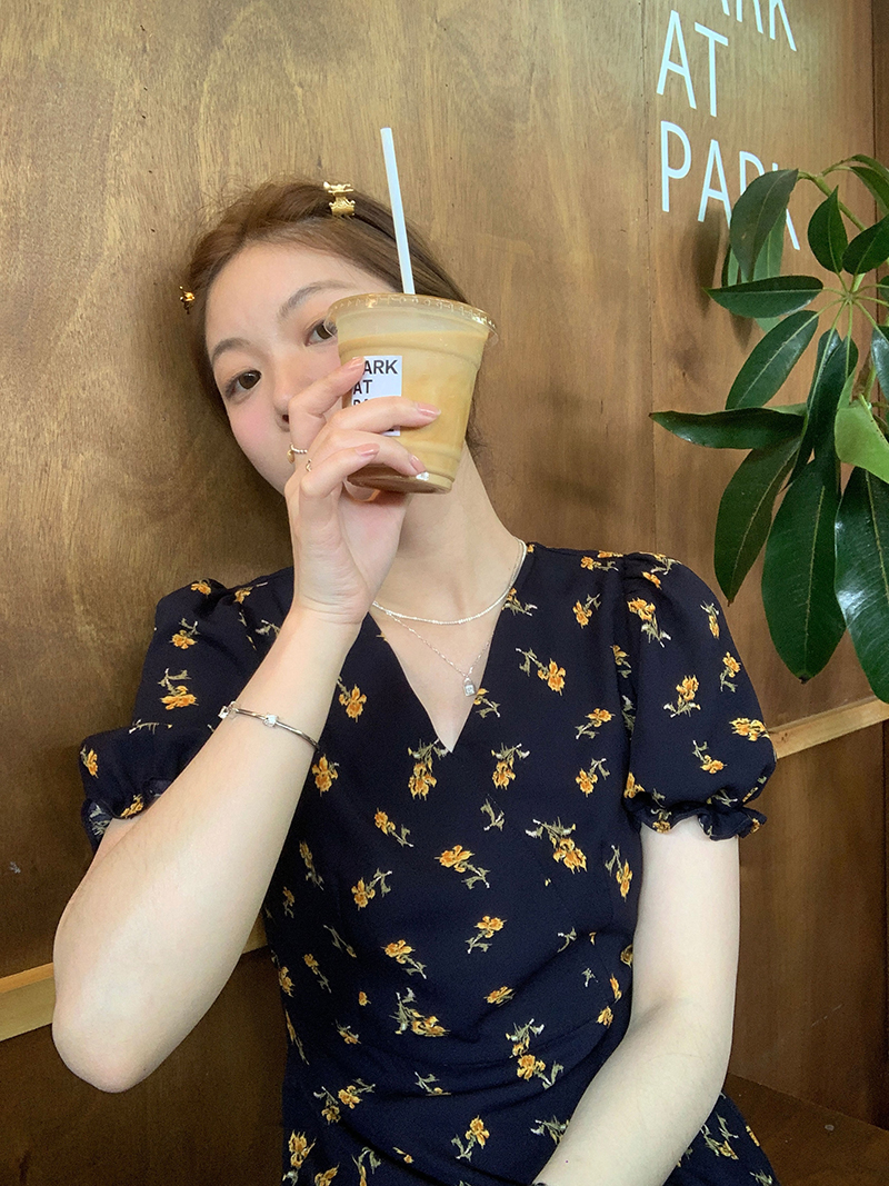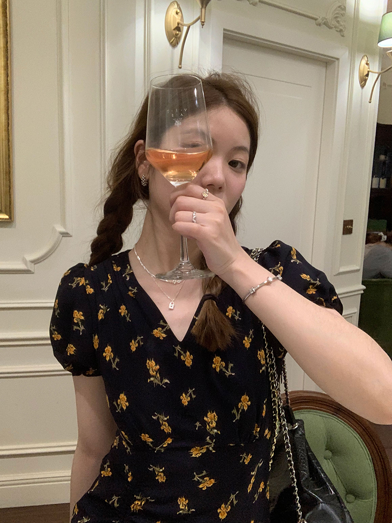 【現貨】im向油畫小黃花V領泡泡袖洋裝不規則荷葉邊甜美碎花裙