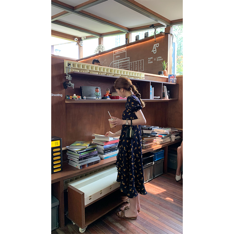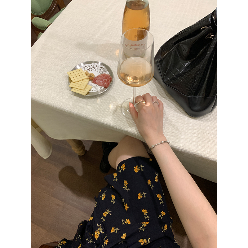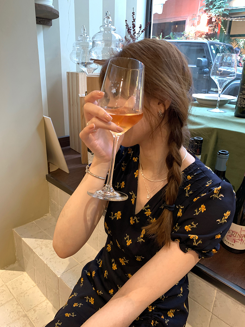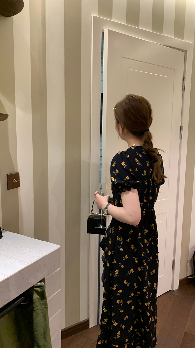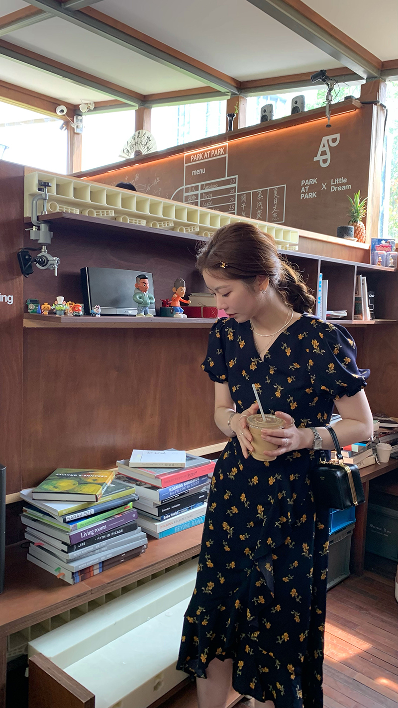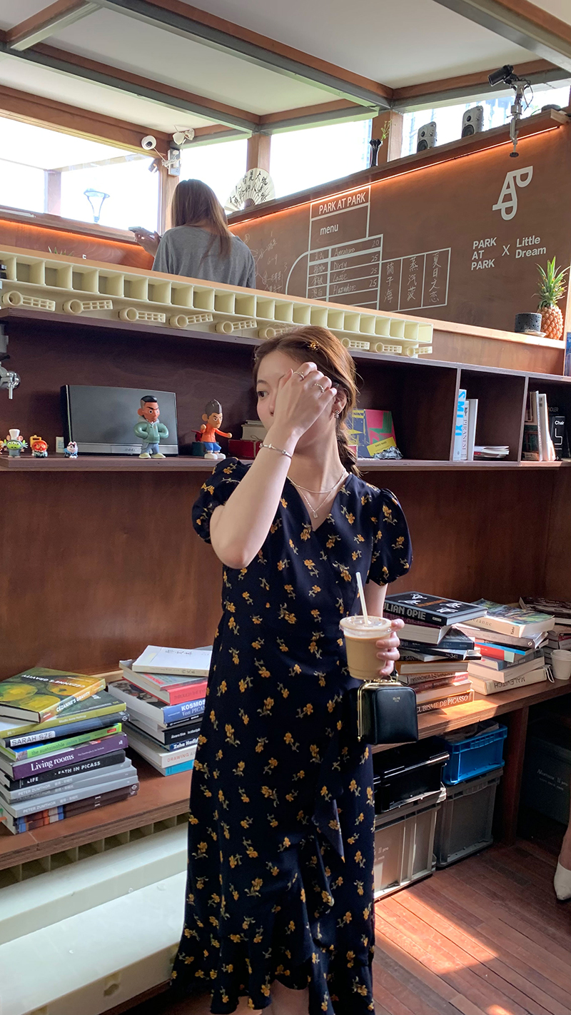 【現貨】im向油畫小黃花V領泡泡袖洋裝不規則荷葉邊甜美碎花裙