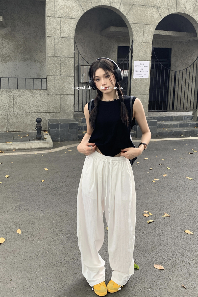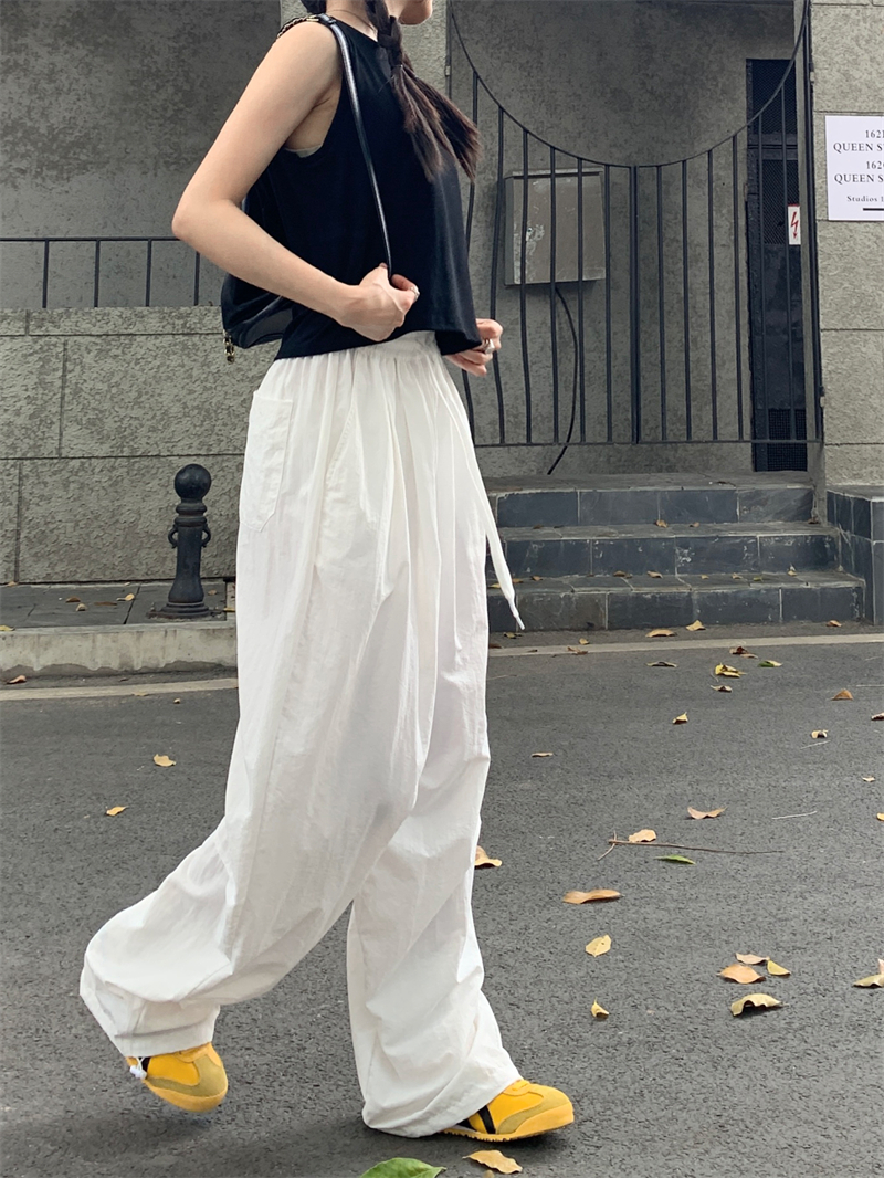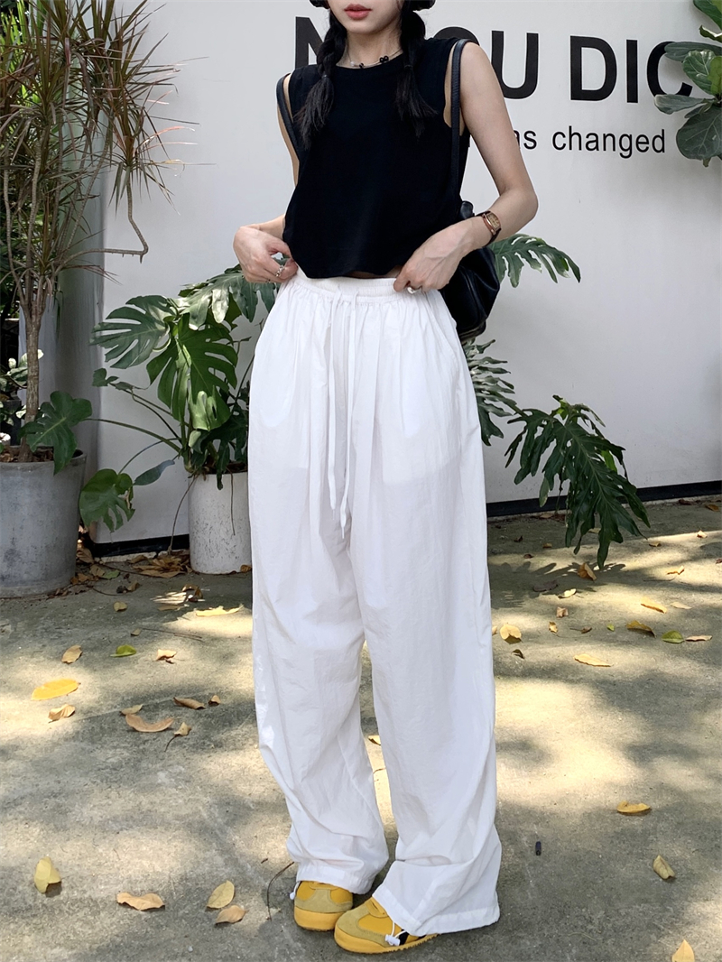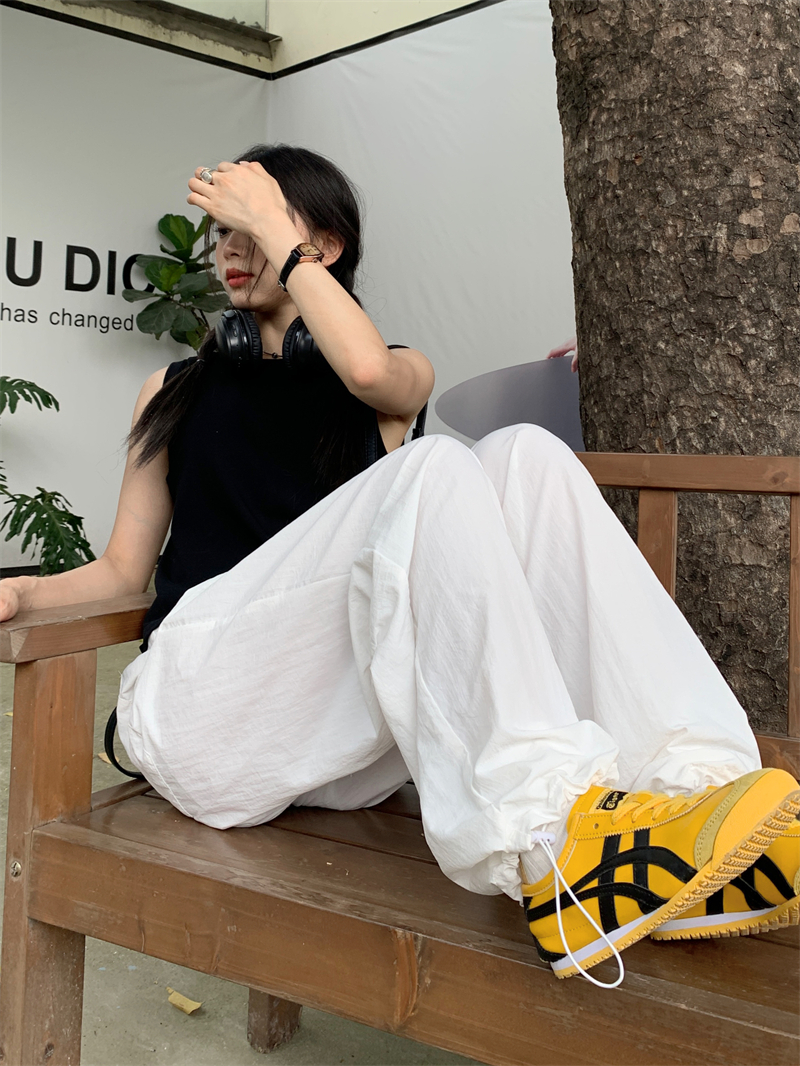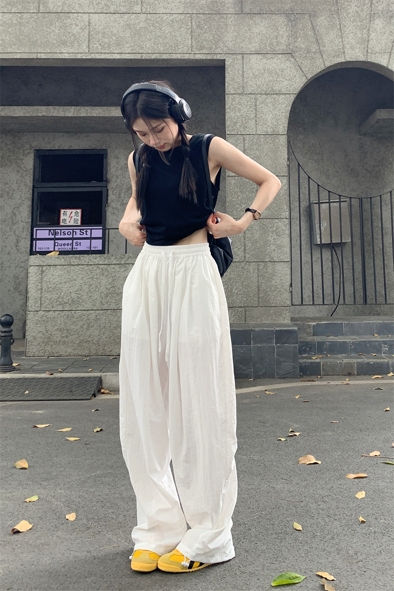 鬆緊腰垂感休閒褲女秋季白色百搭速乾運動褲子小個子寬鬆闊腿長褲