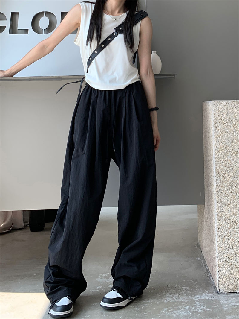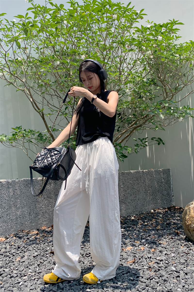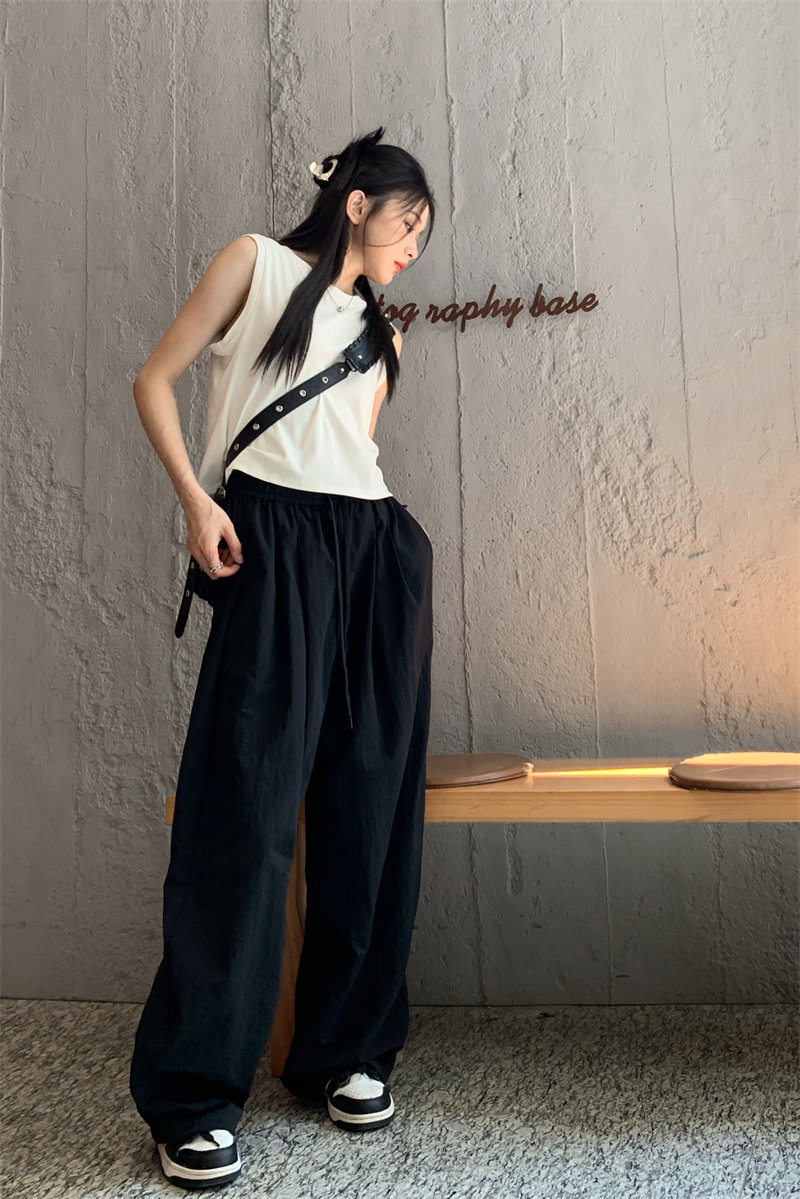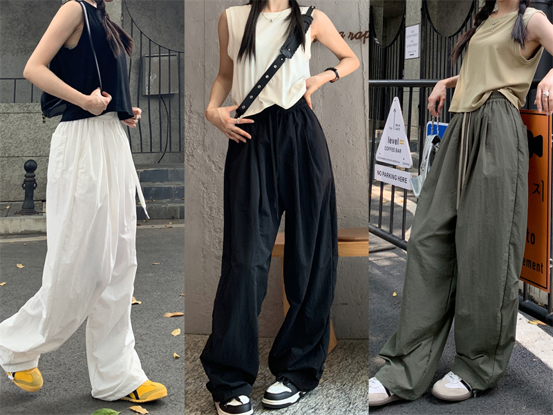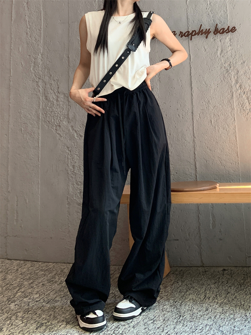 鬆緊腰垂感休閒褲女秋季白色百搭速乾運動褲子小個子寬鬆闊腿長褲
