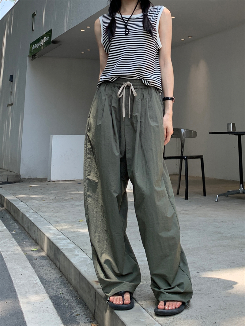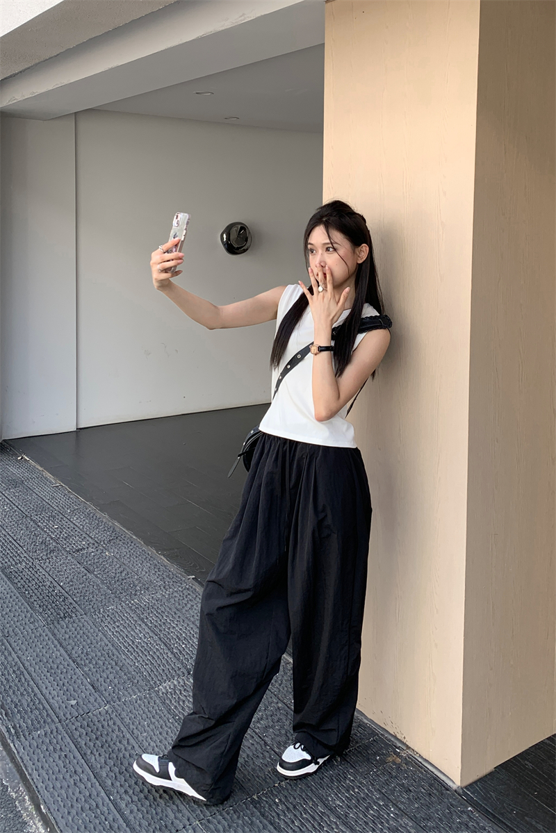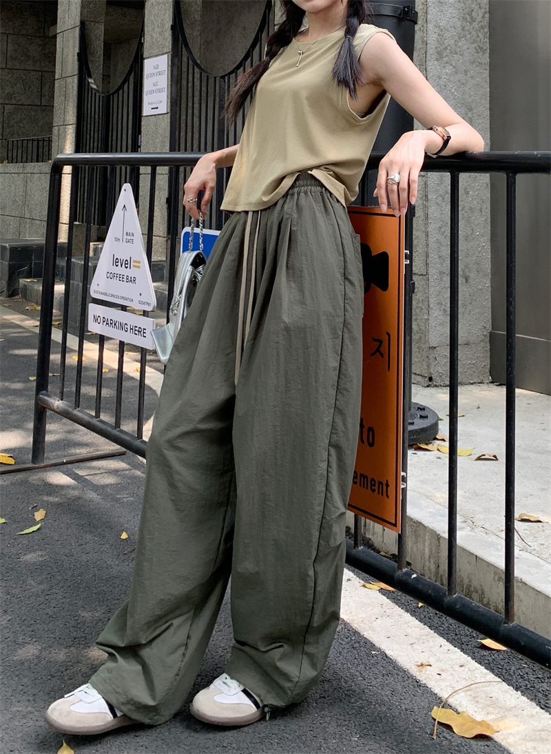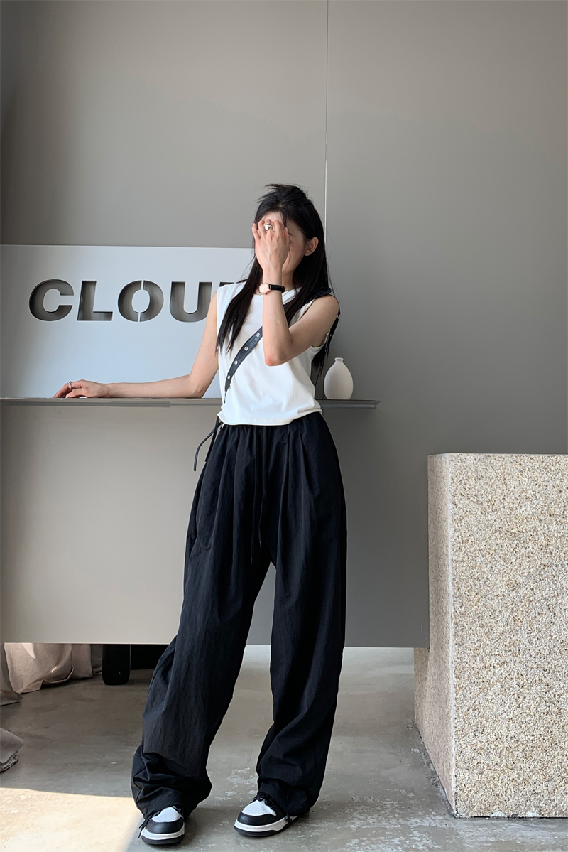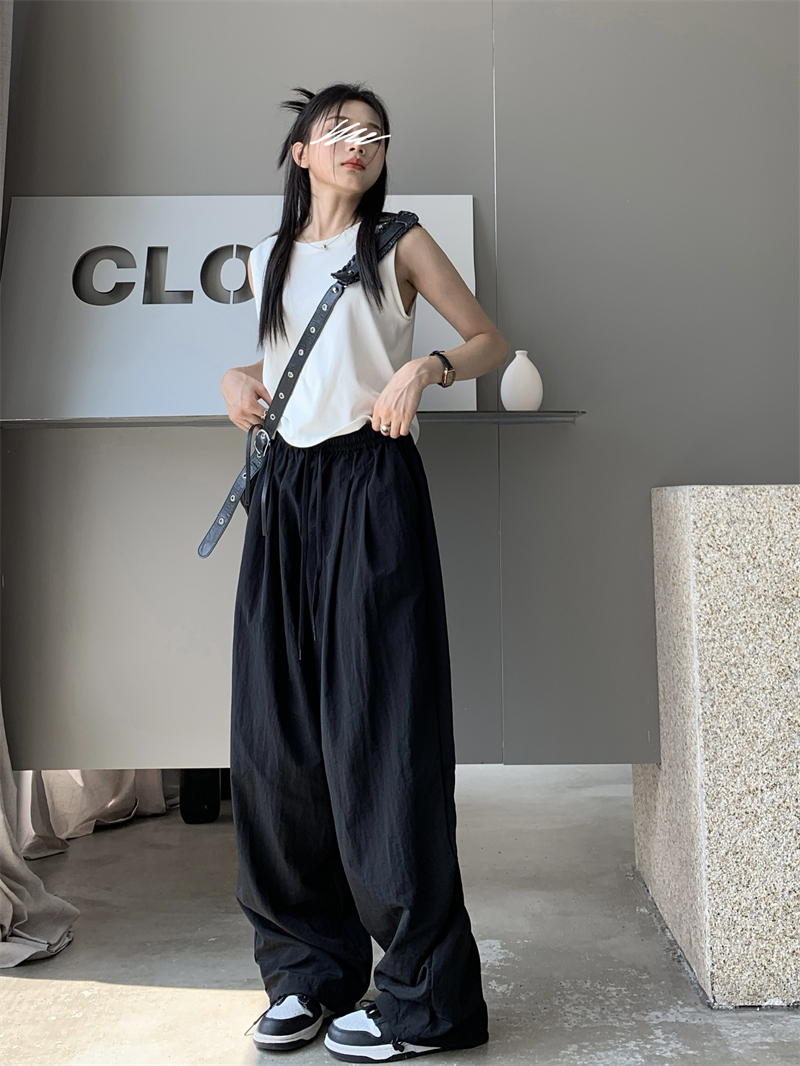 鬆緊腰垂感休閒褲女秋季白色百搭速乾運動褲子小個子寬鬆闊腿長褲