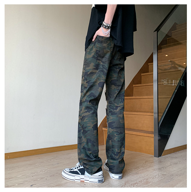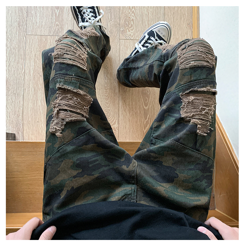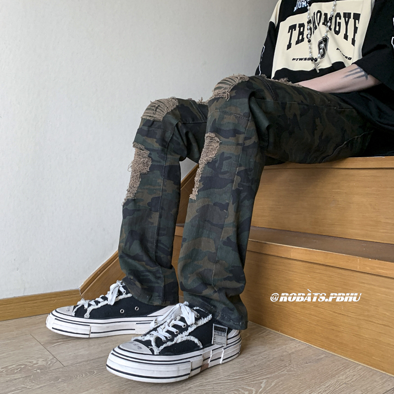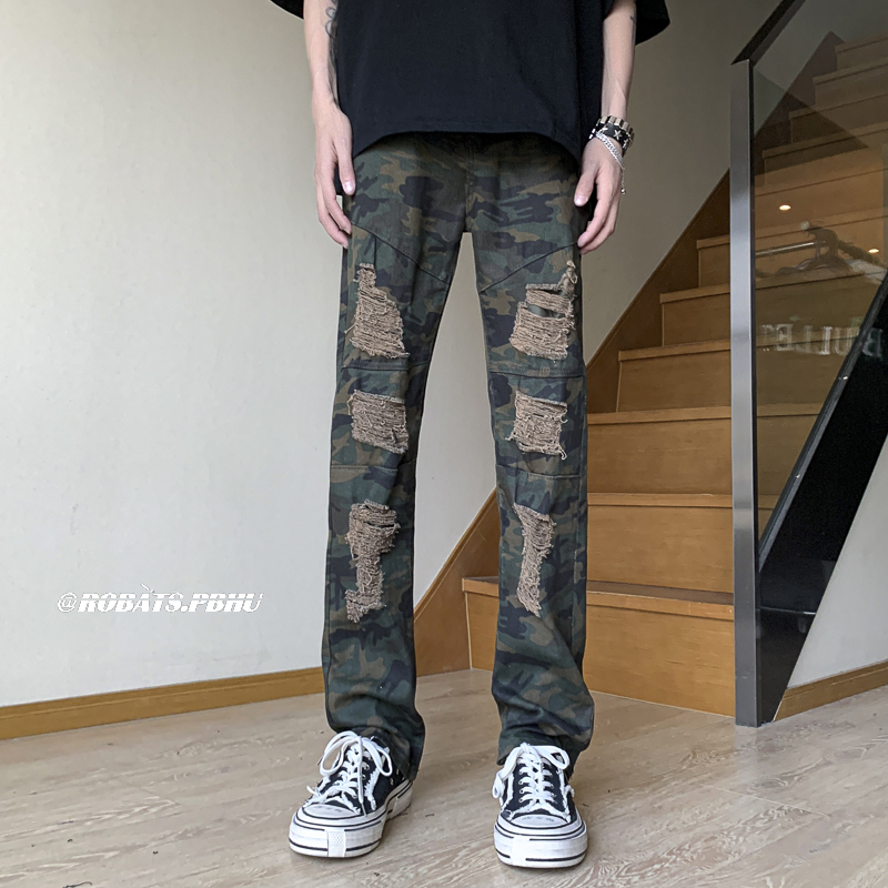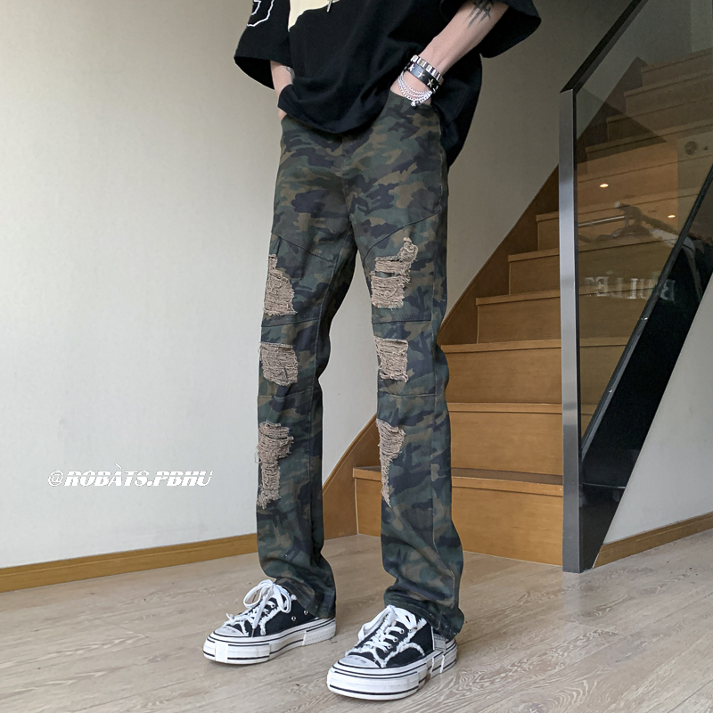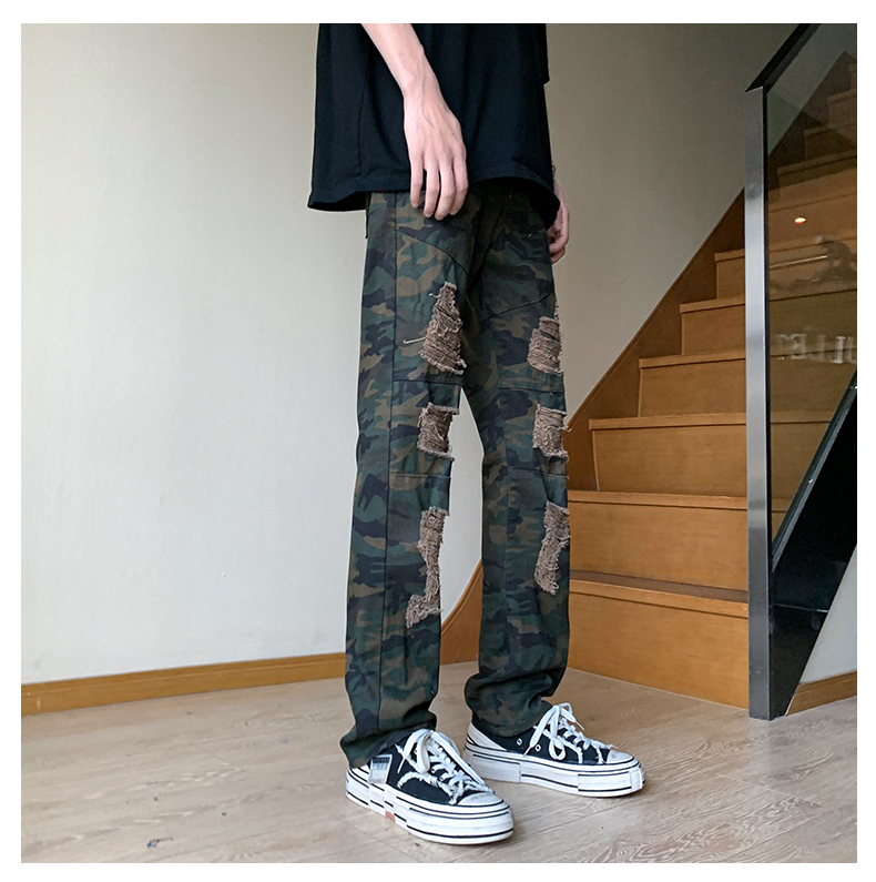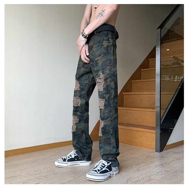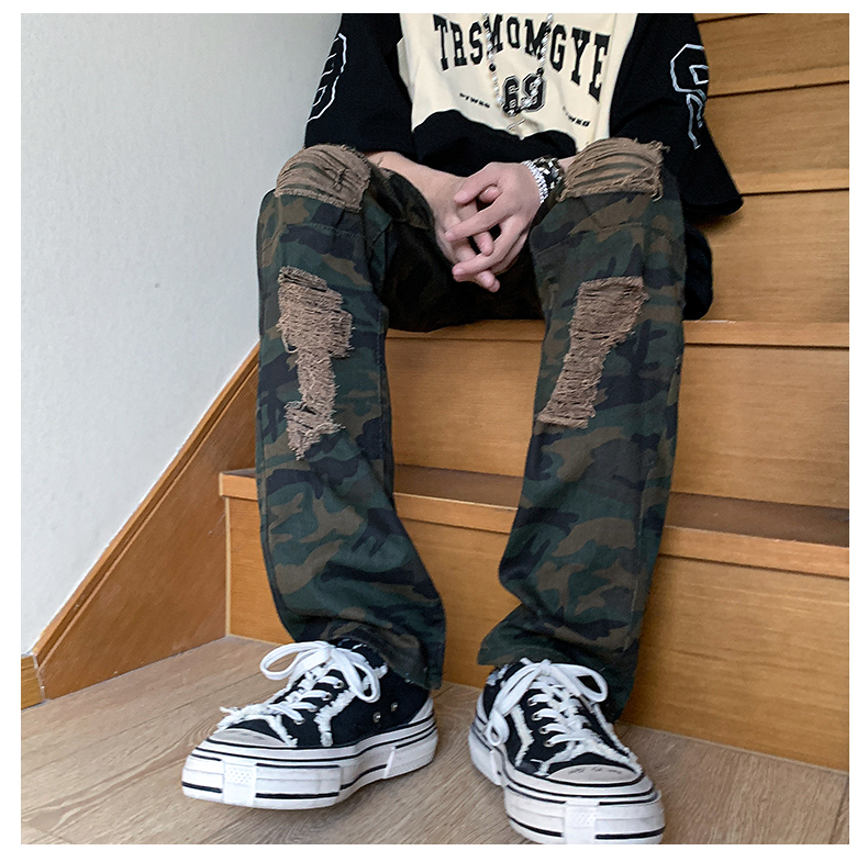 輕奢小眾炸街褲子高街美式vibe工裝迷彩牛仔褲破洞修補布丁直筒褲