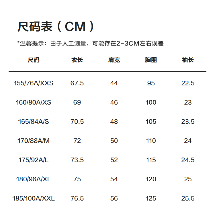 尺碼 155/76A/XXS 160/80A/XS 165/84A/S 170/88A/M 175/92A/L 180/96A/XL 185/100A/XXL