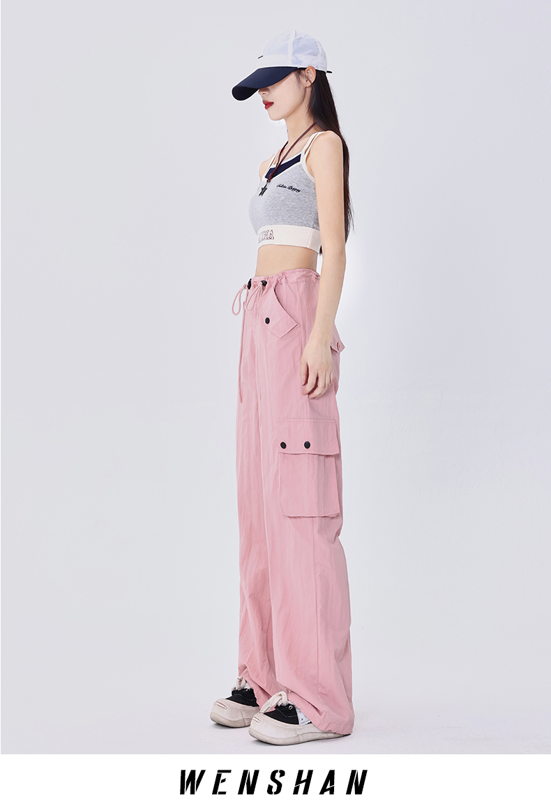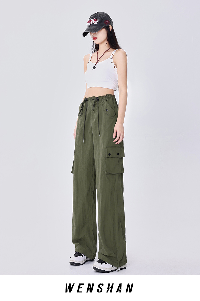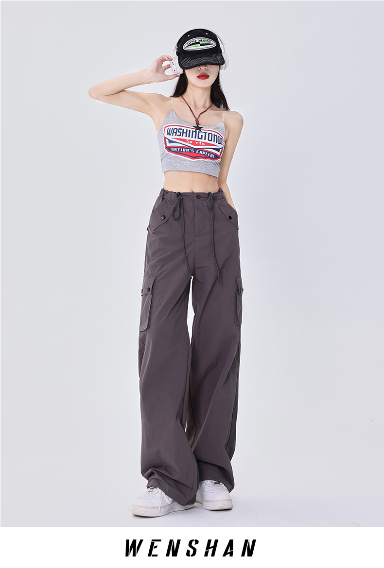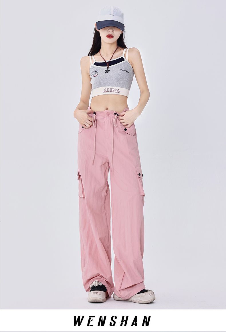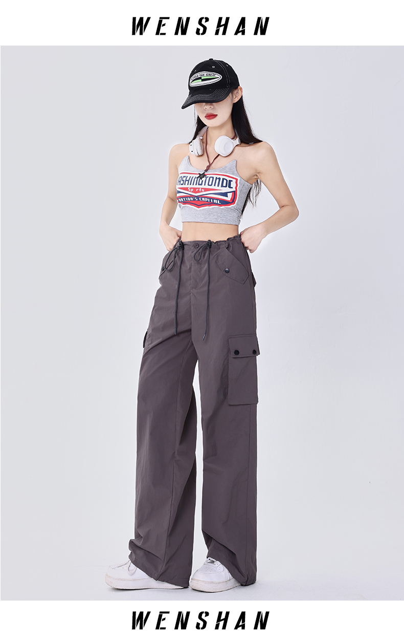 溫姍美式辣妹速乾冰絲高腰工裝褲夏抽繩設計寬鬆闊腿百搭休閒長褲