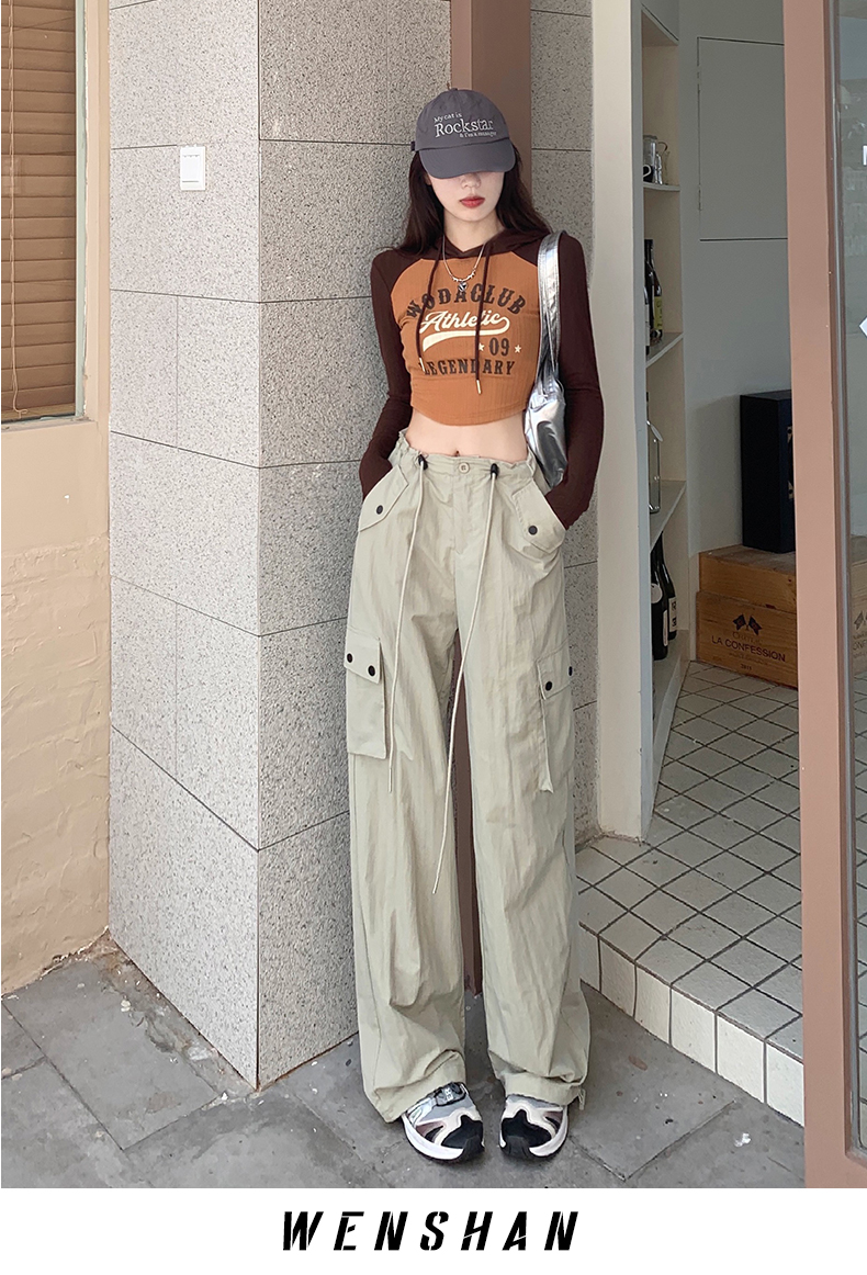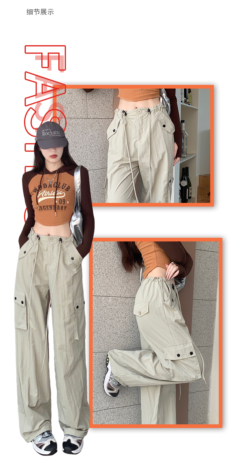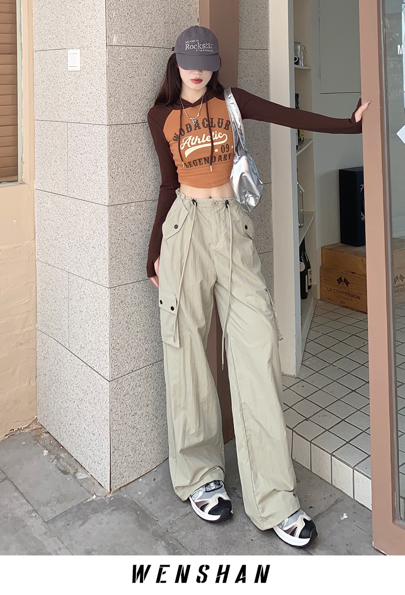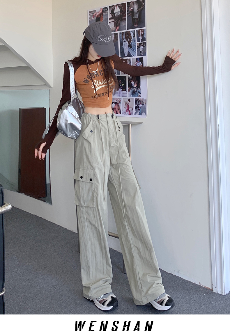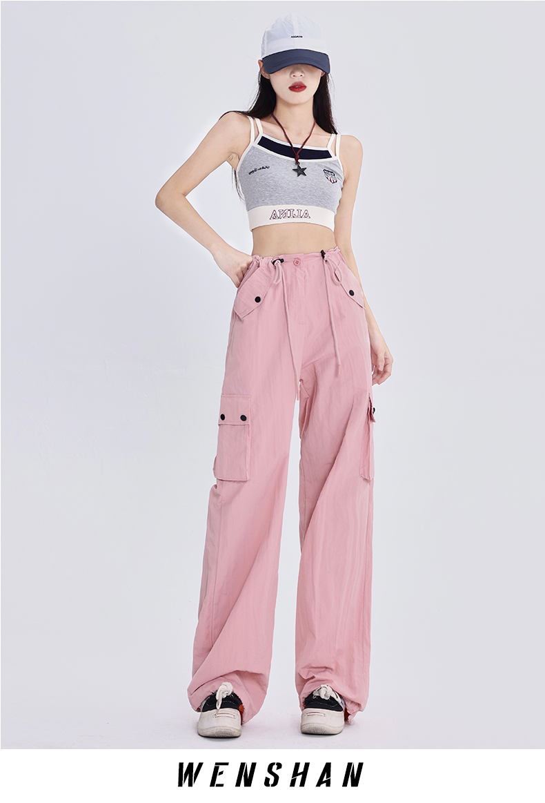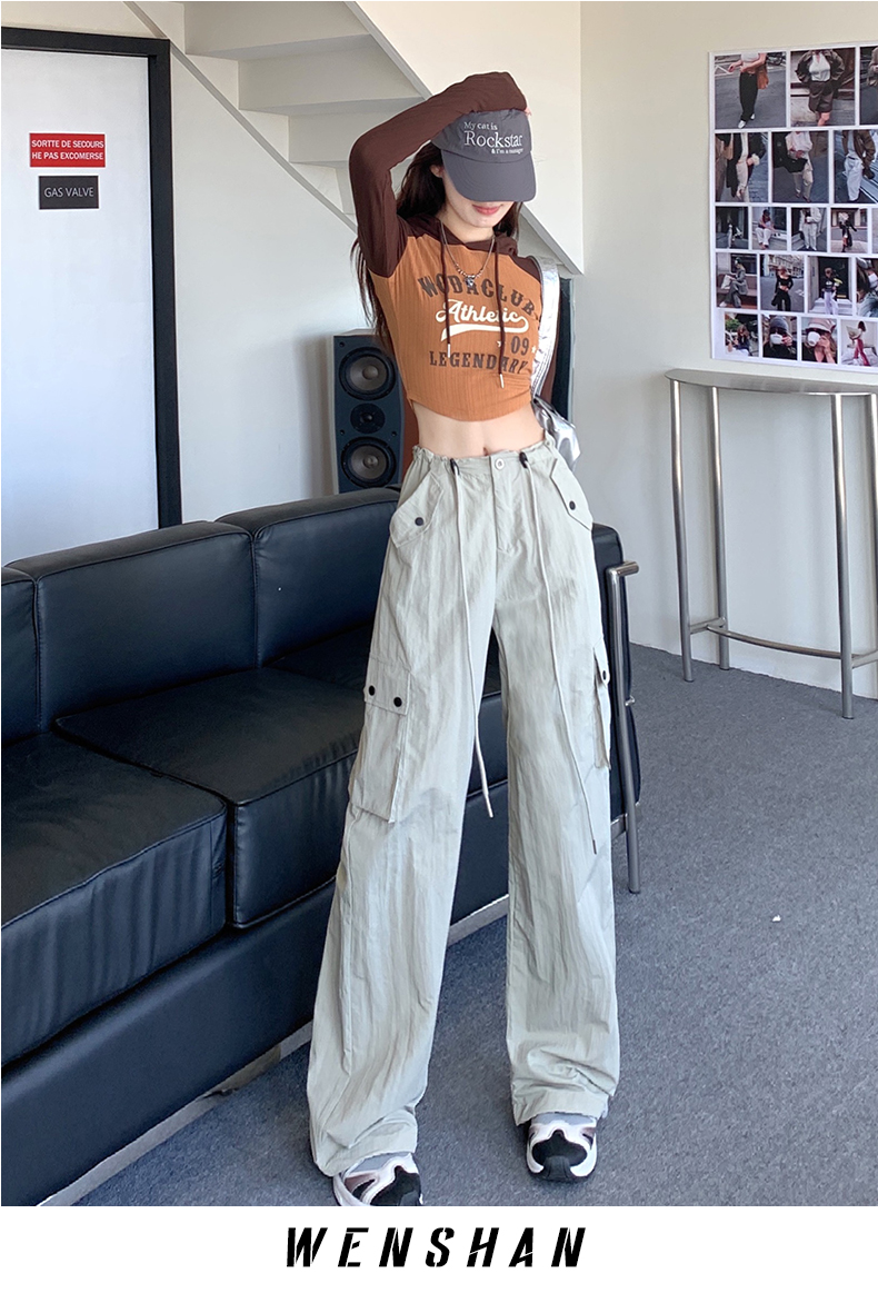 溫姍美式辣妹速乾冰絲高腰工裝褲夏抽繩設計寬鬆闊腿百搭休閒長褲
