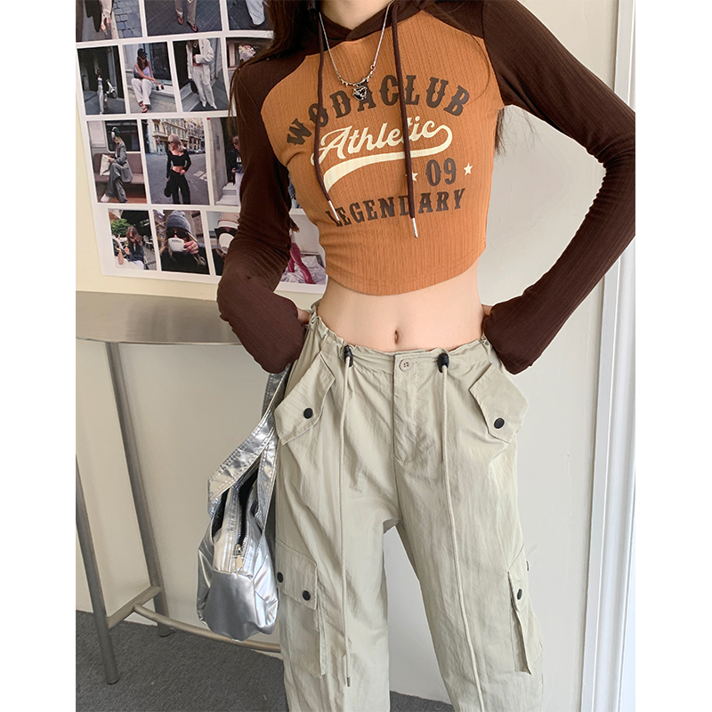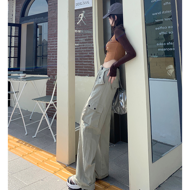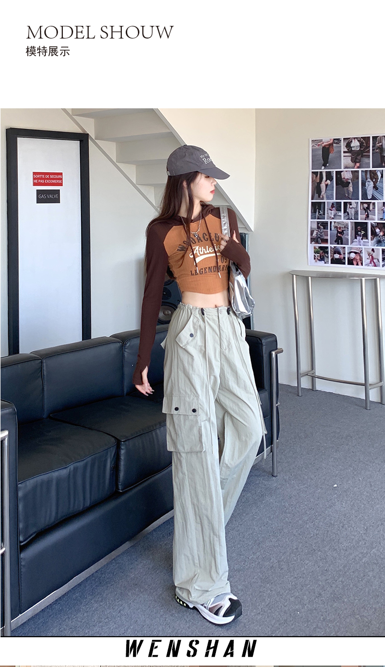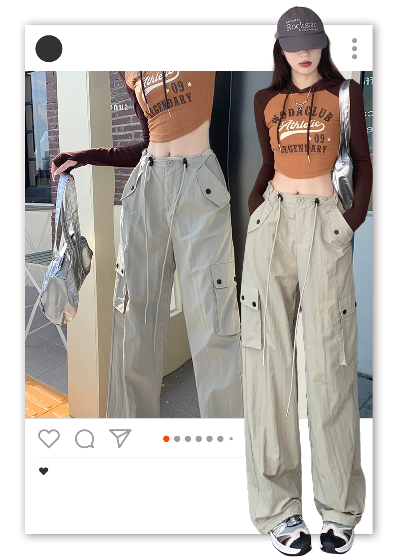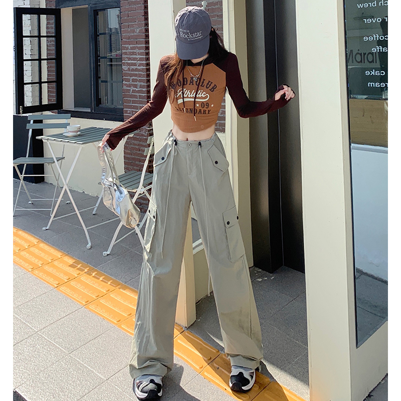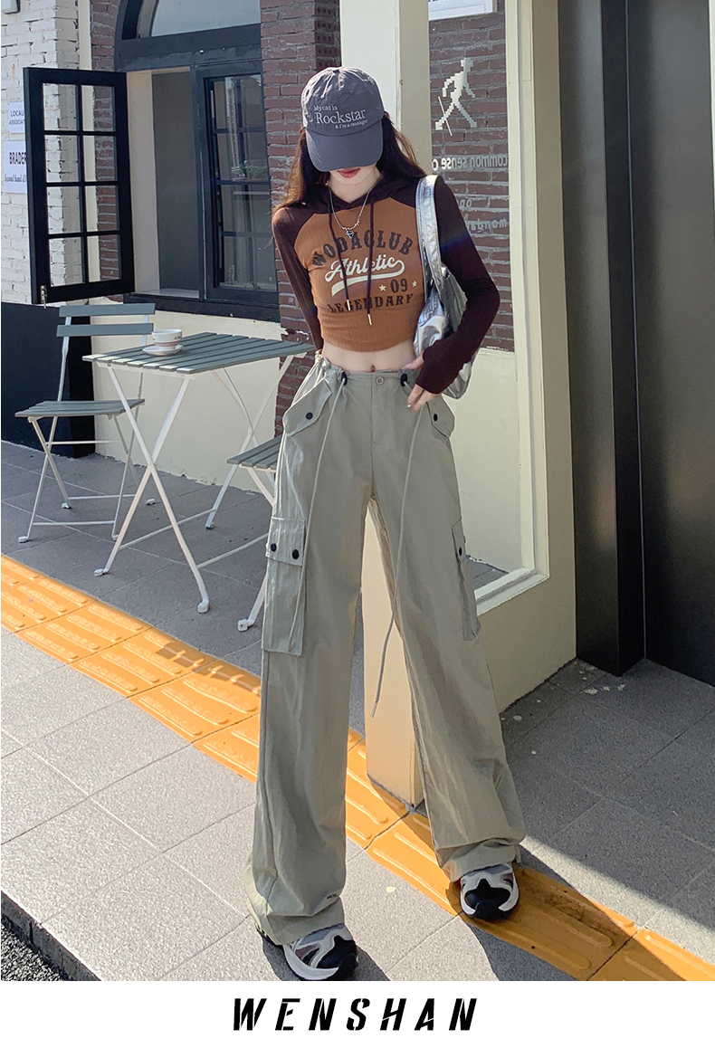 溫姍美式辣妹速乾冰絲高腰工裝褲夏抽繩設計寬鬆闊腿百搭休閒長褲