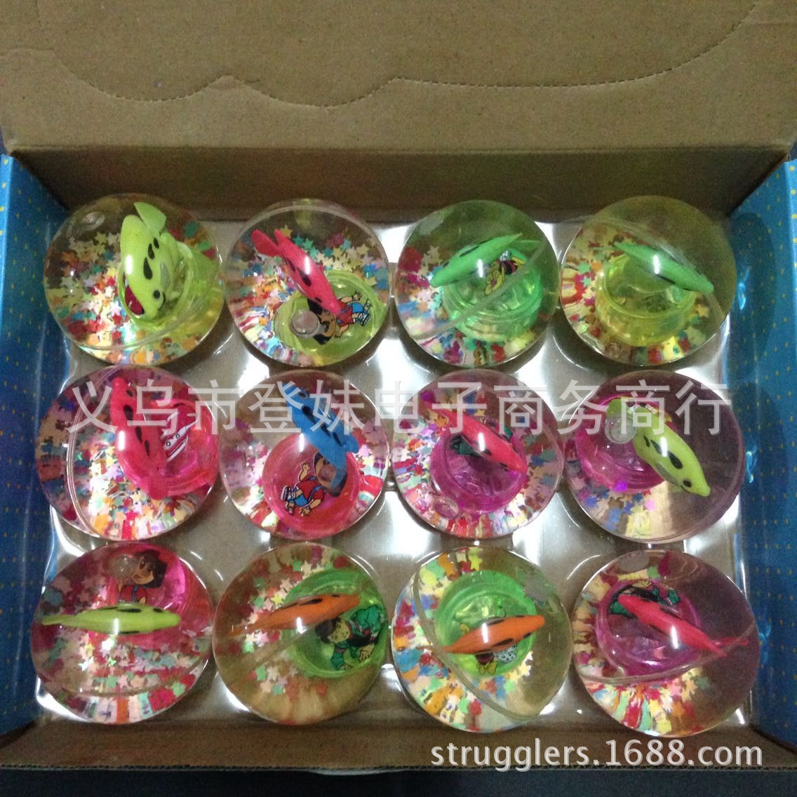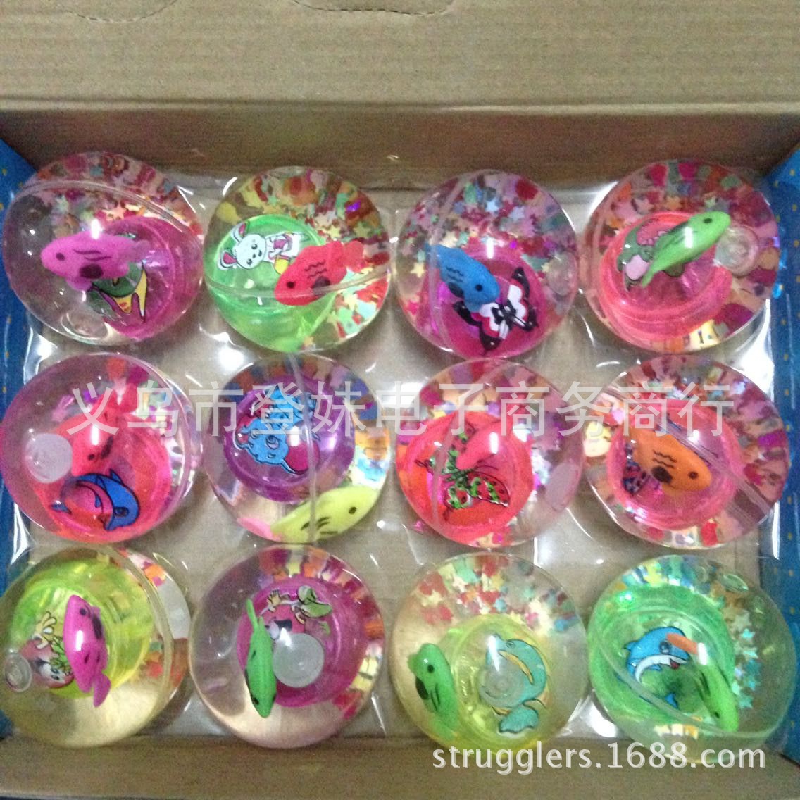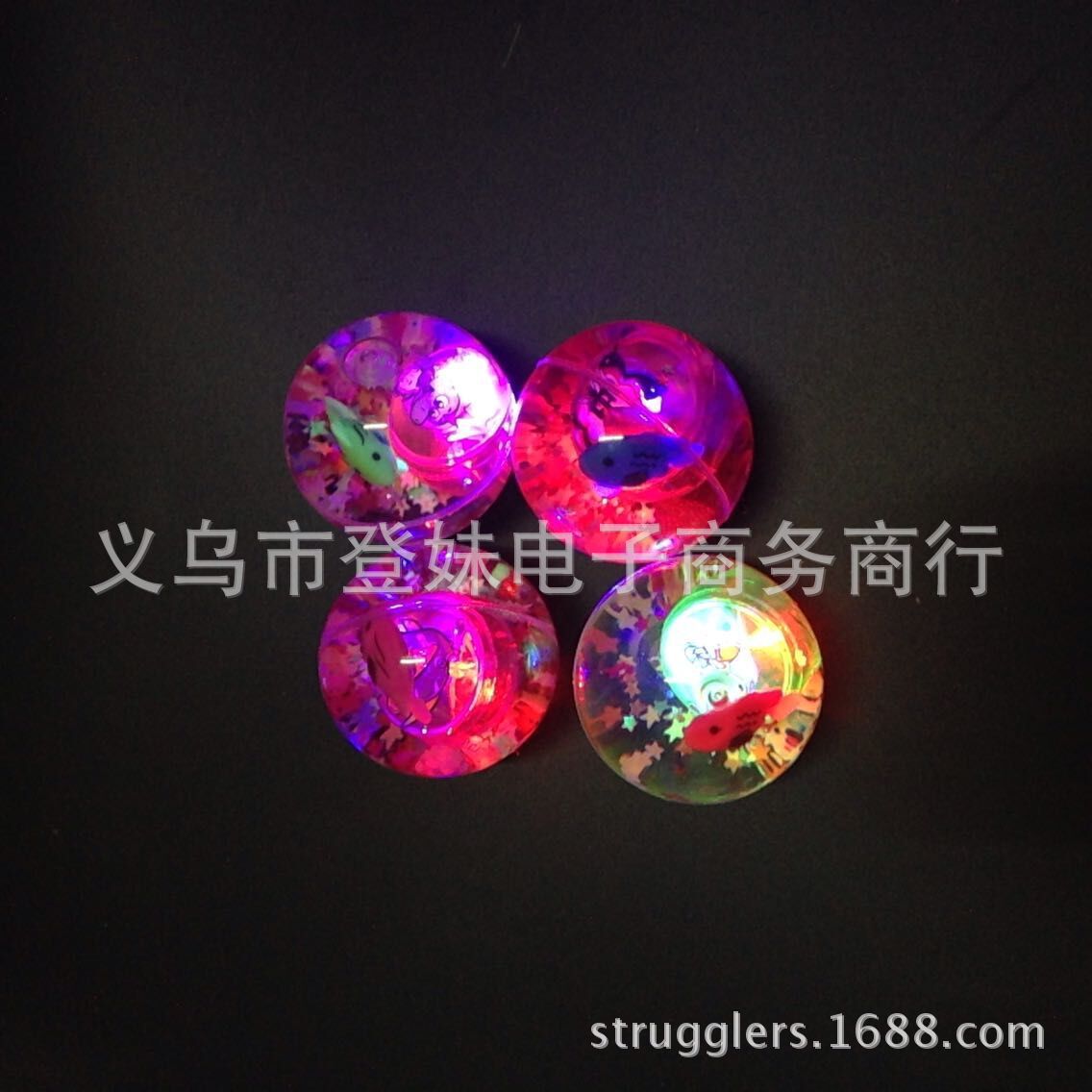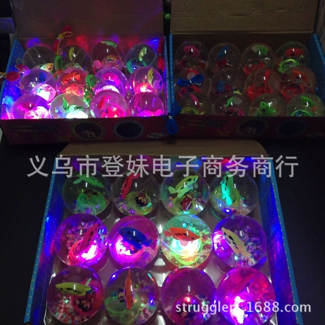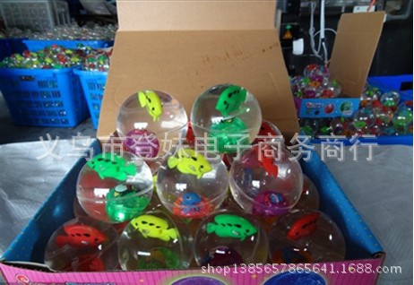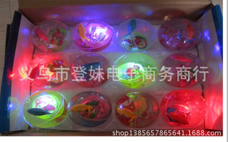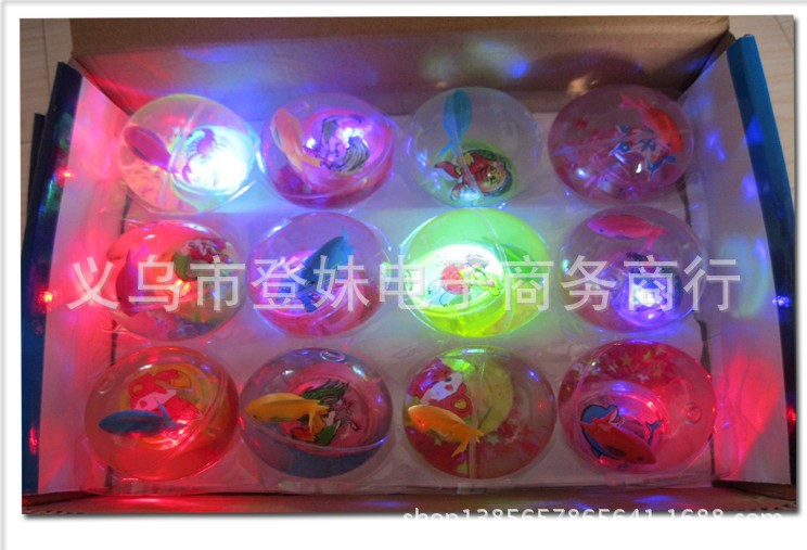 宝贝说明:闪光弹力跳跳球内置LED灯,发出七彩闪烁光芒,内置不同颜色的塑料小球和可爱的金鱼在游动(随机发货不挑)在灯光的照耀下很是漂亮!圆形的小球,震动开关,球往地上扔下或敲一下弹跳一下球就会闪亮,闪一会后自动熄灭,再震动再亮。