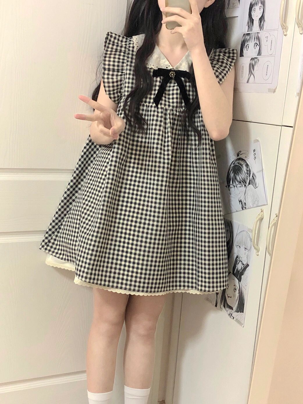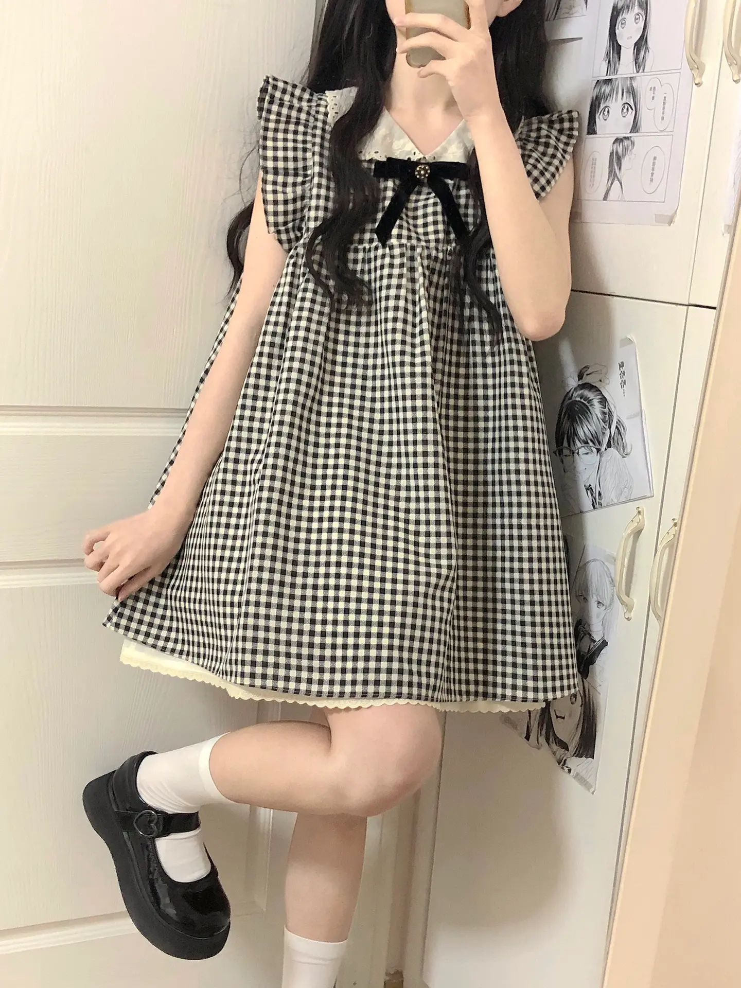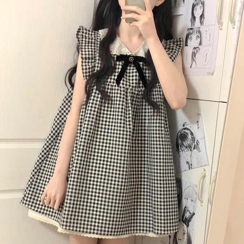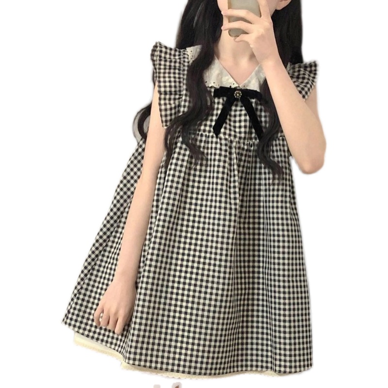 法式小香風娃娃領短洋裝女夏荷葉袖格子甜美寬鬆小個子無袖裙