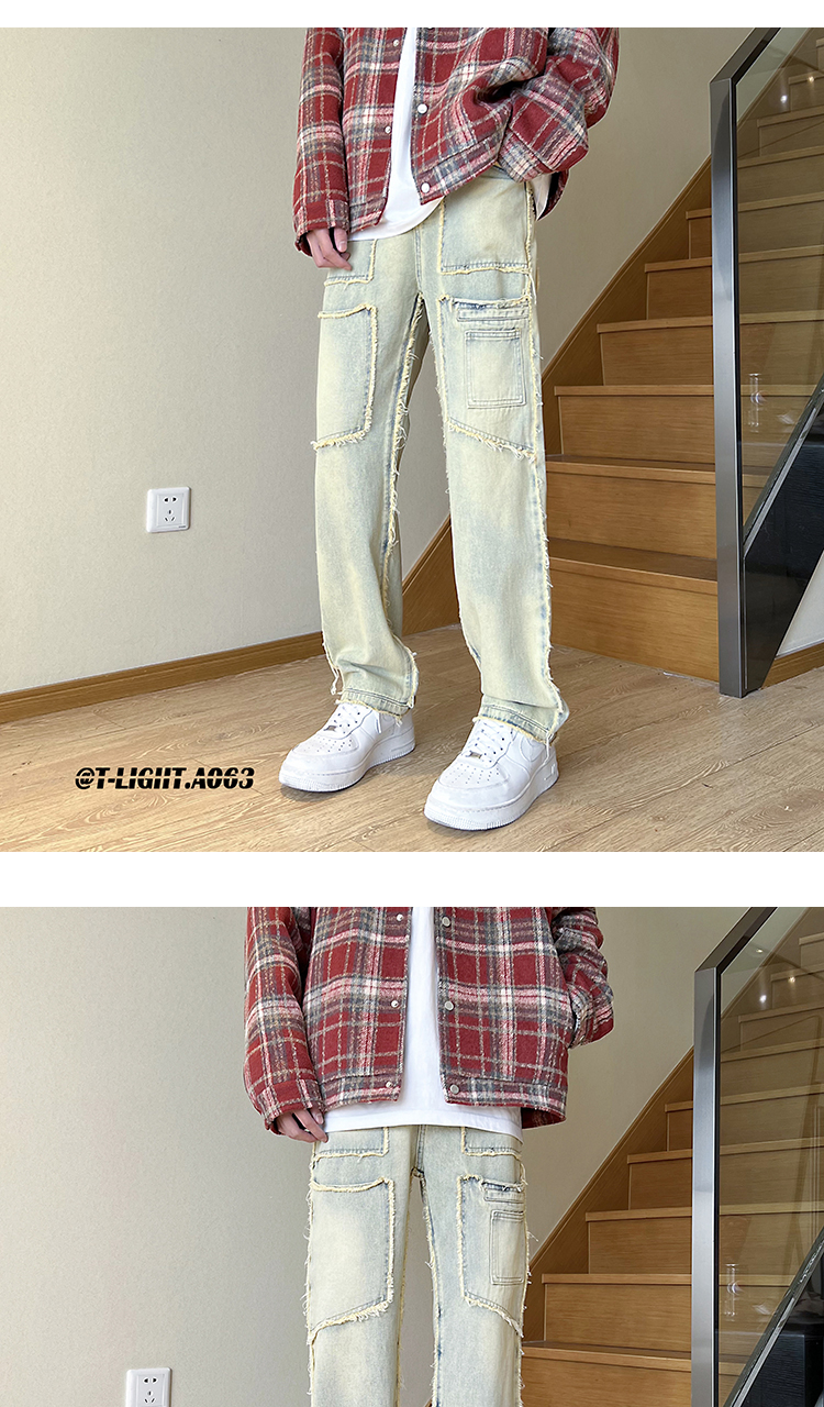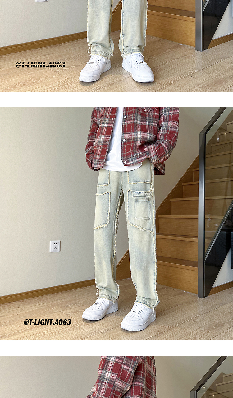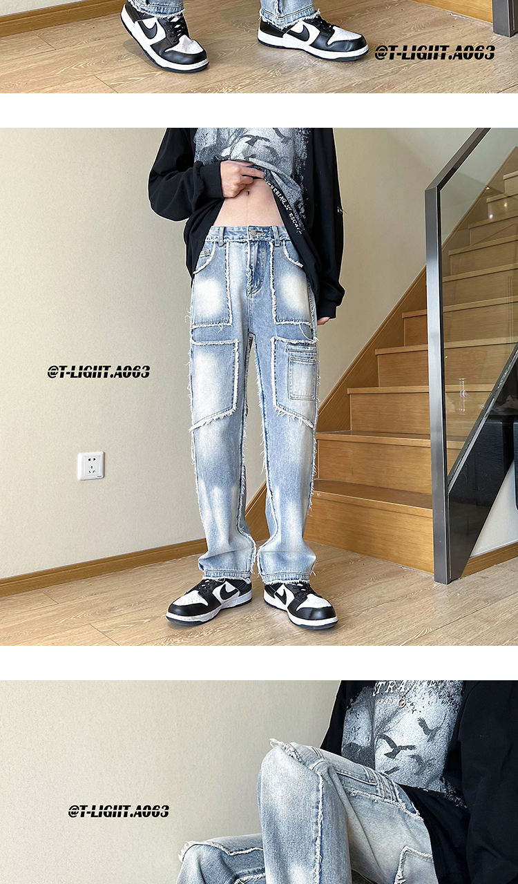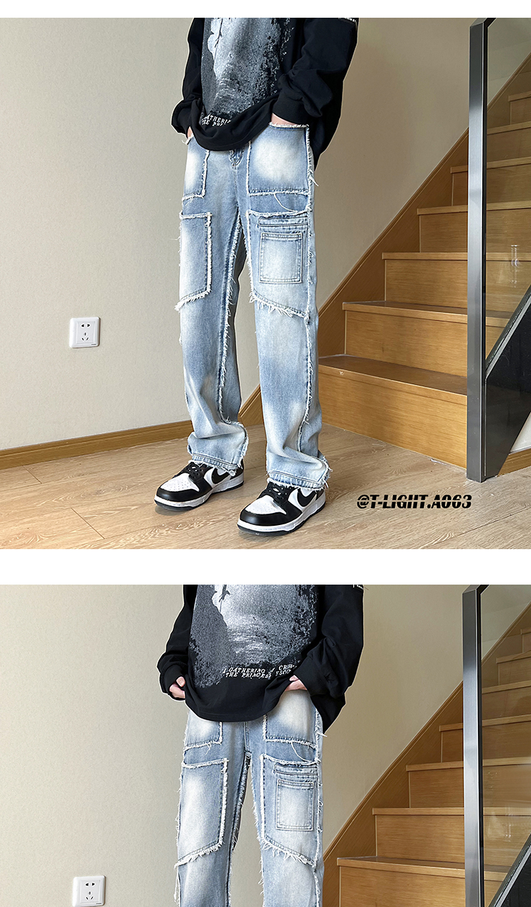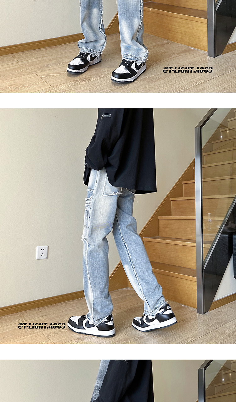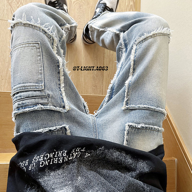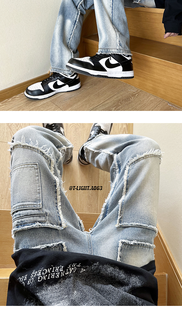 美式vibe風褲子高街黑色紮染漸層牛仔褲男款毛邊修身直筒工裝褲潮