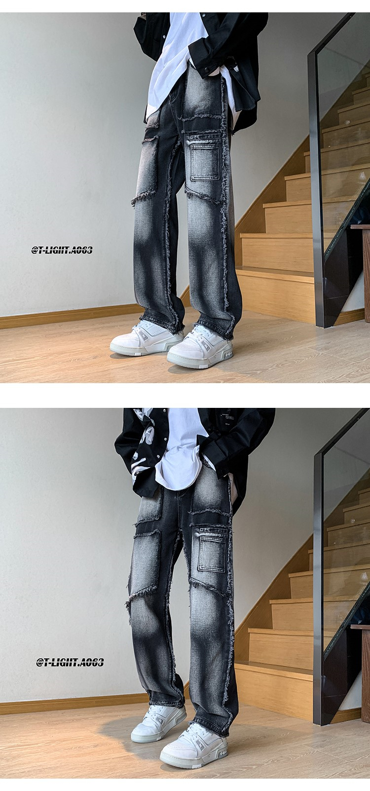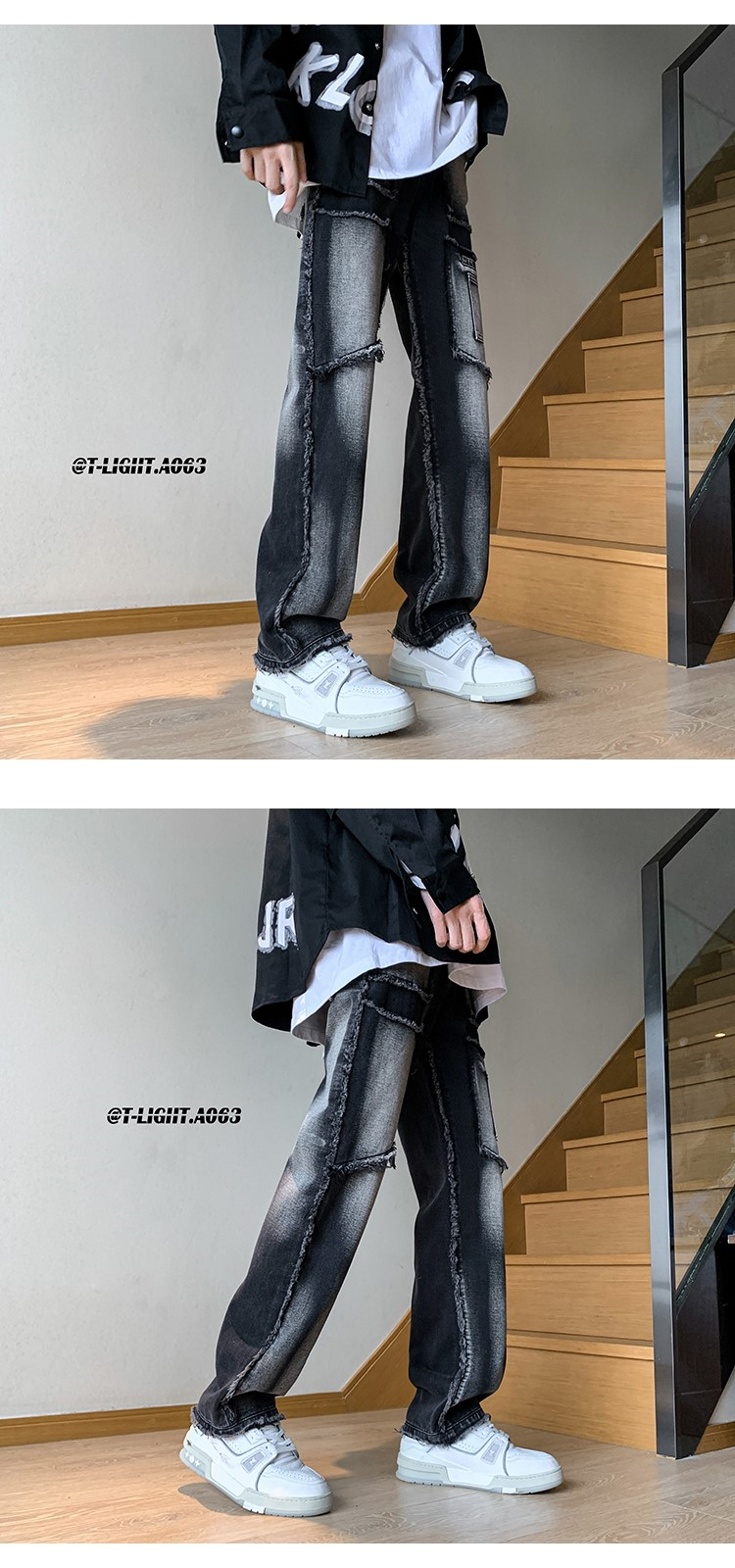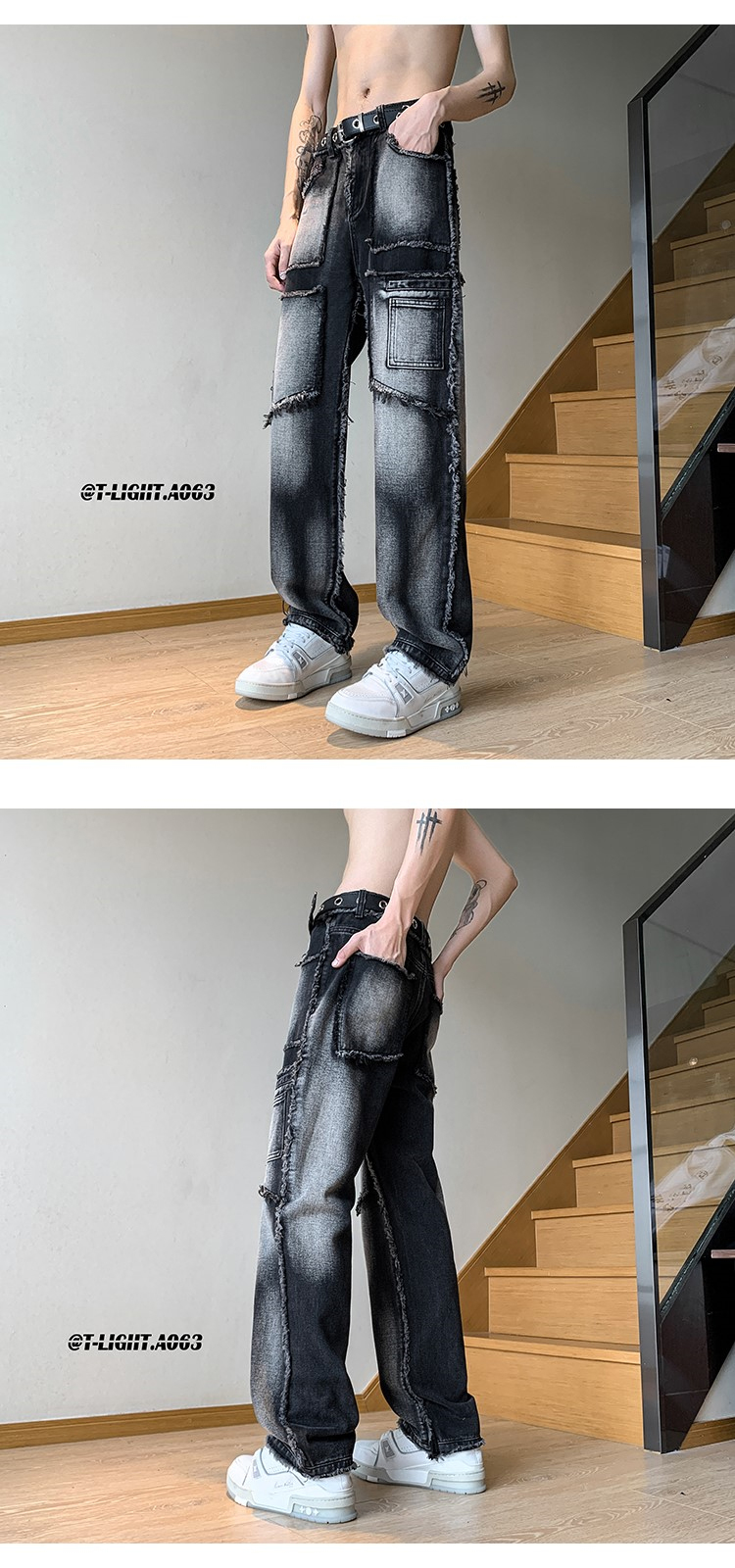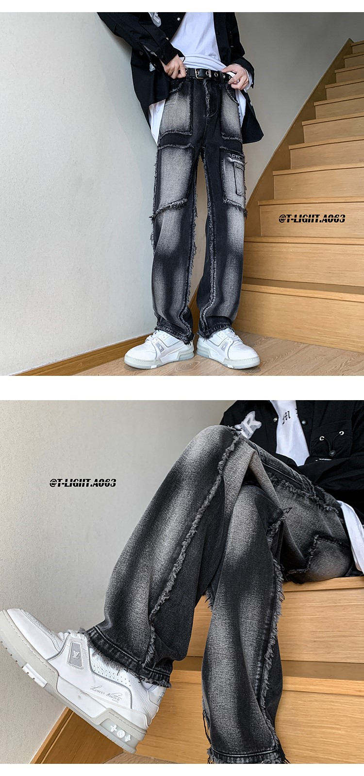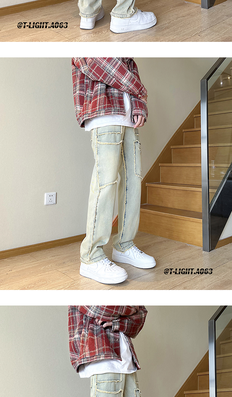 美式vibe風褲子高街黑色紮染漸層牛仔褲男款毛邊修身直筒工裝褲潮
