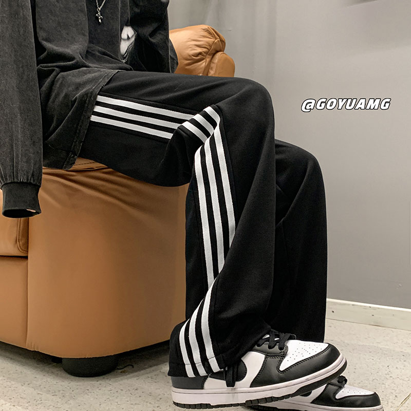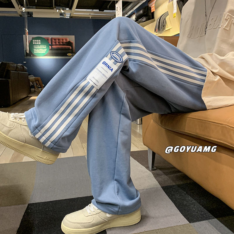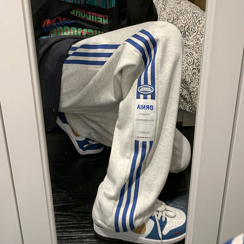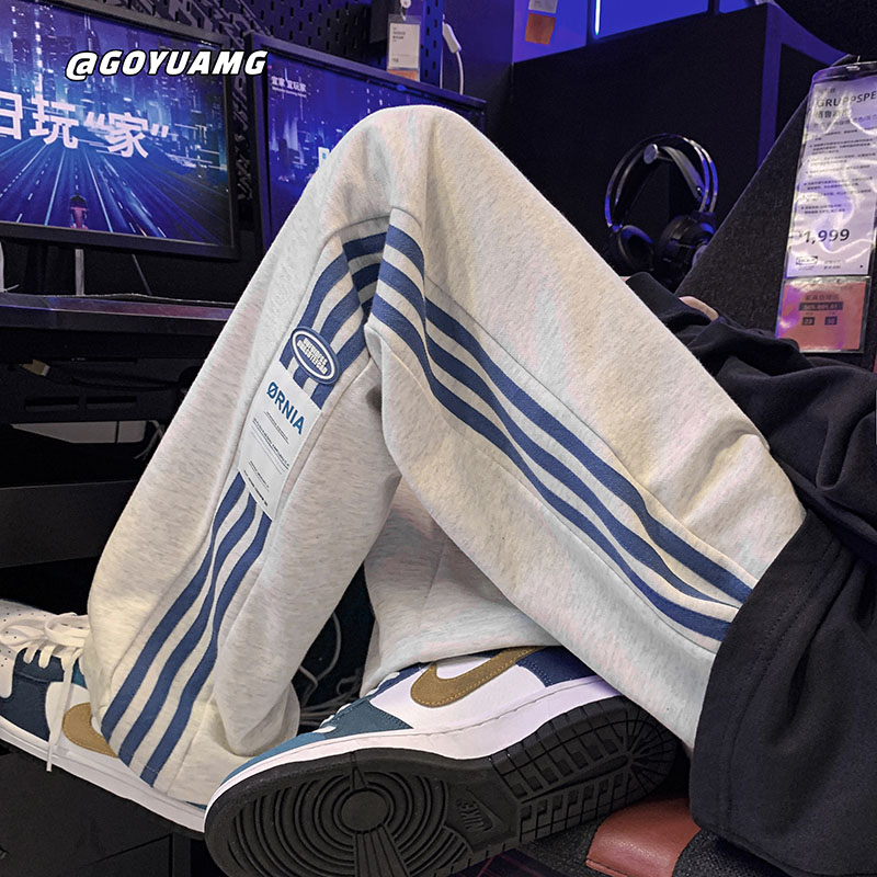 美式hiphop褲子ins高街潮垂感灰色條紋運動厚棉褲男寬鬆直筒寬褲