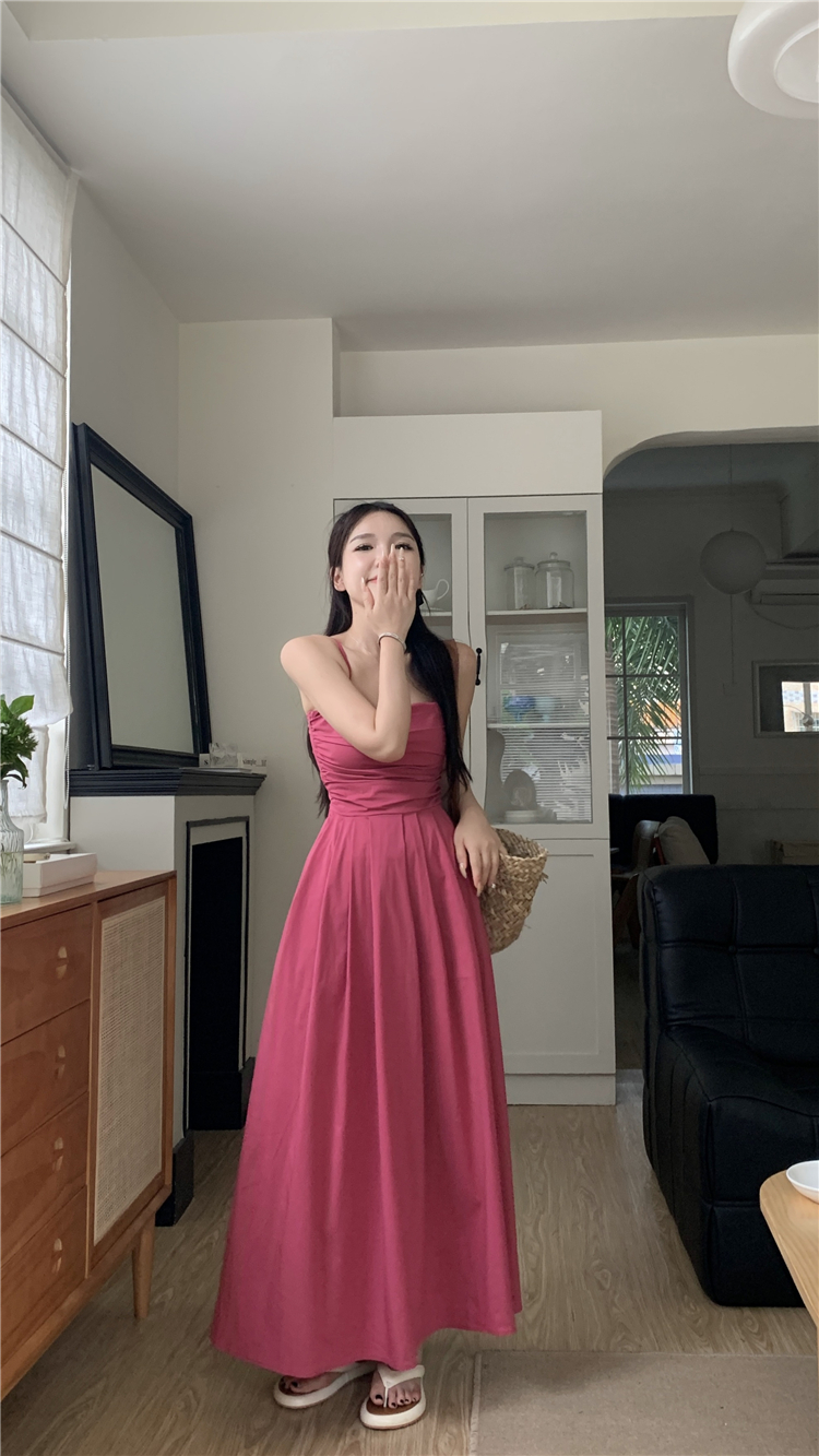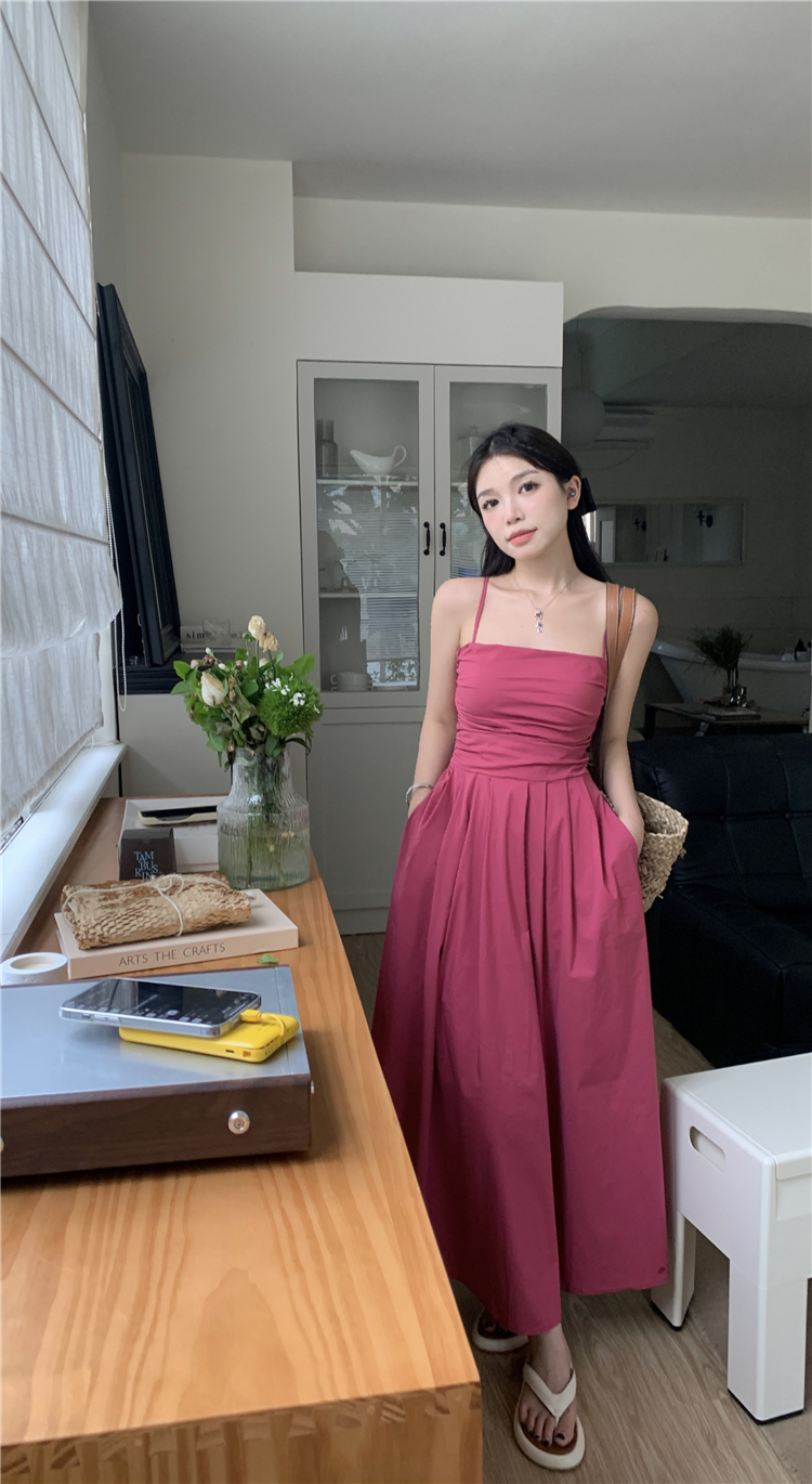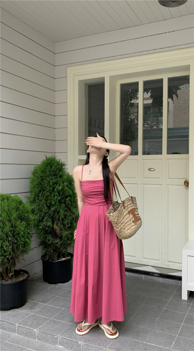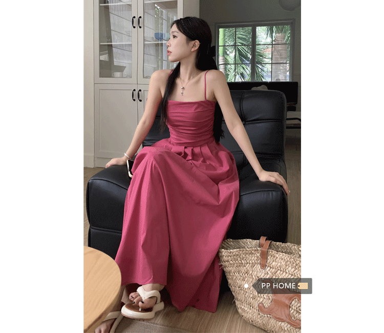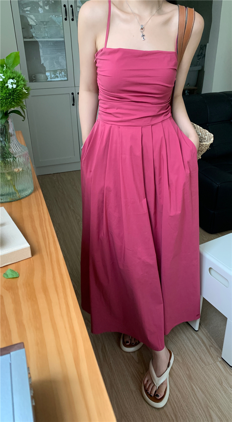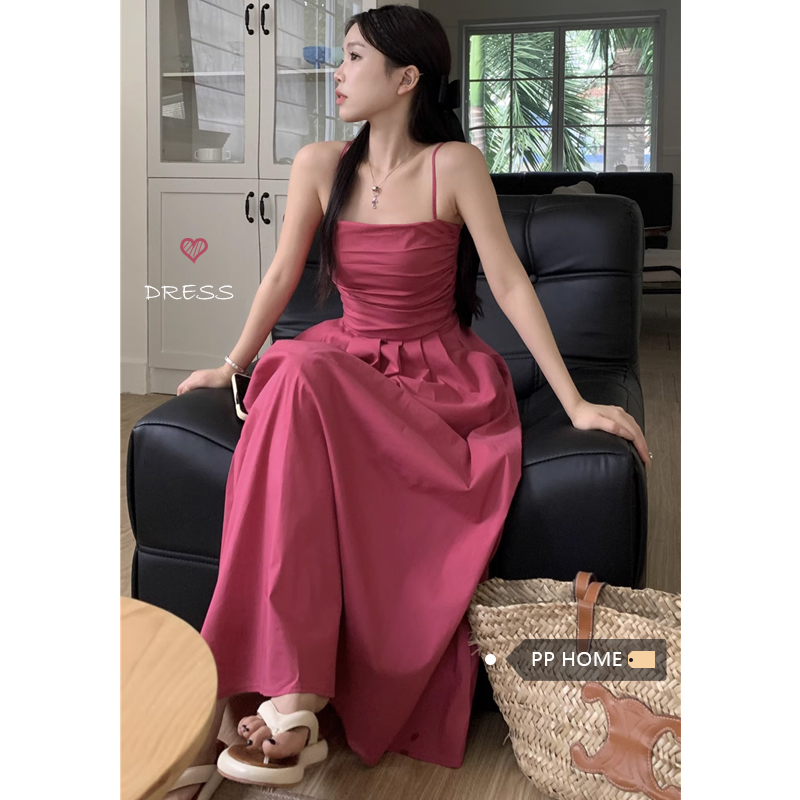 PPHOME嬌欲千金~法式褶皺顯瘦百搭露背氣質中長版吊帶洋裝夏季