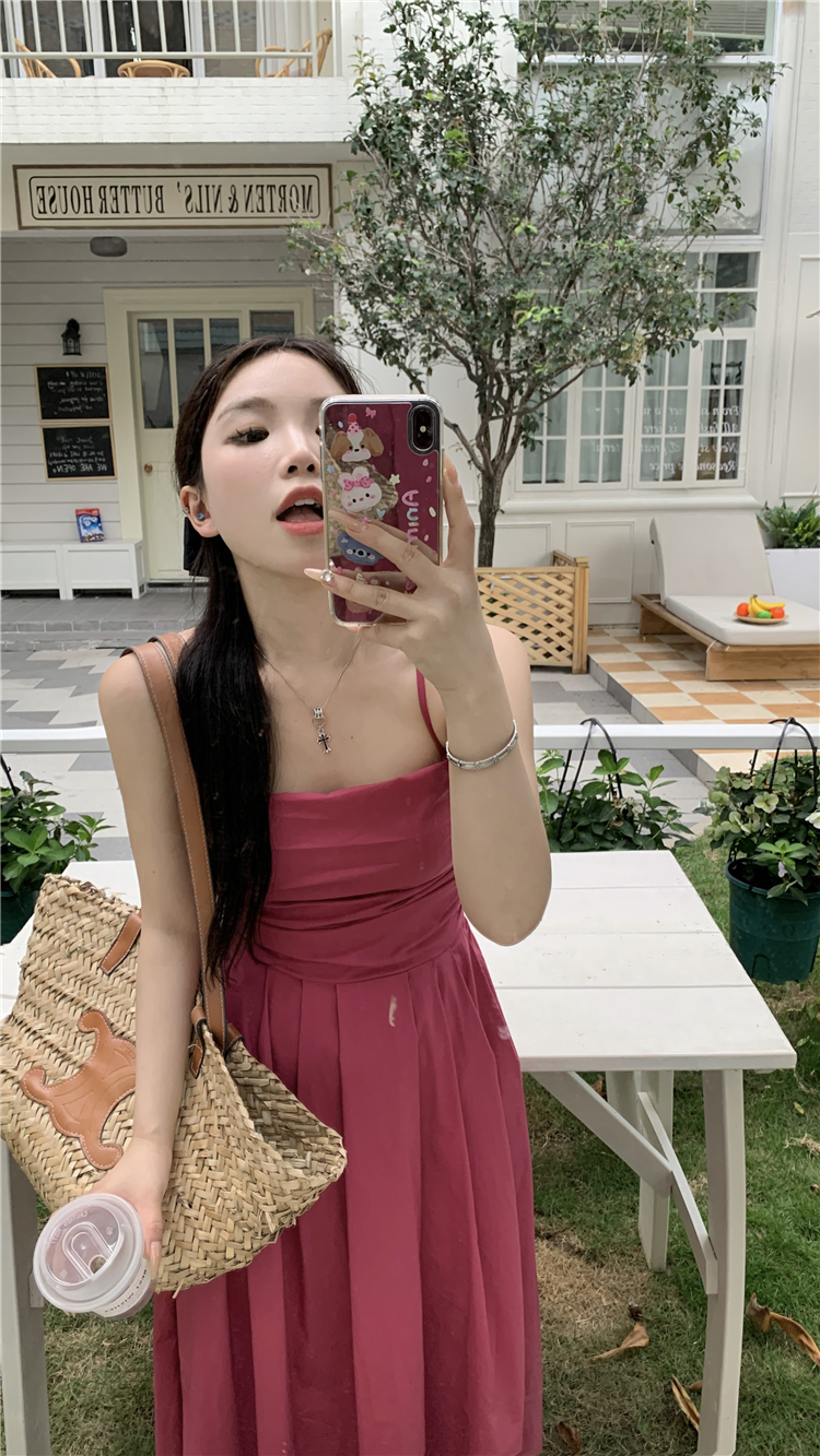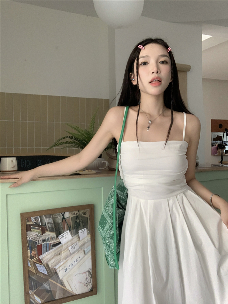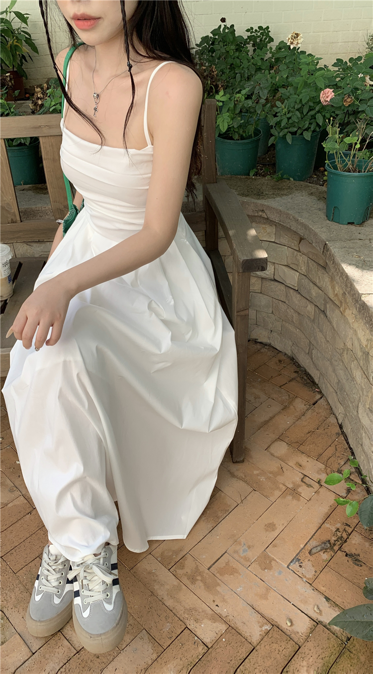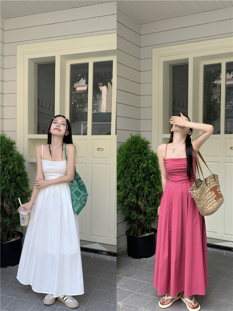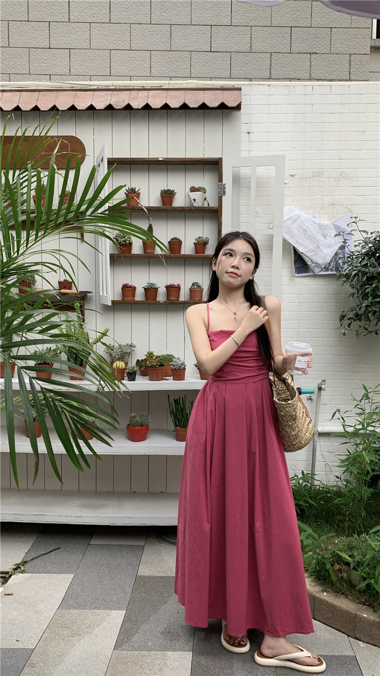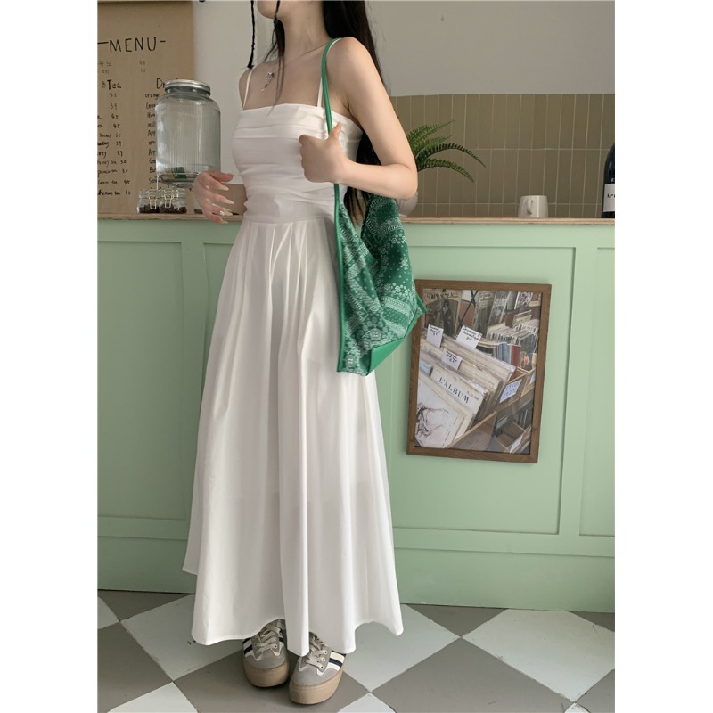 PPHOME嬌欲千金~法式褶皺顯瘦百搭露背氣質中長版吊帶洋裝夏季