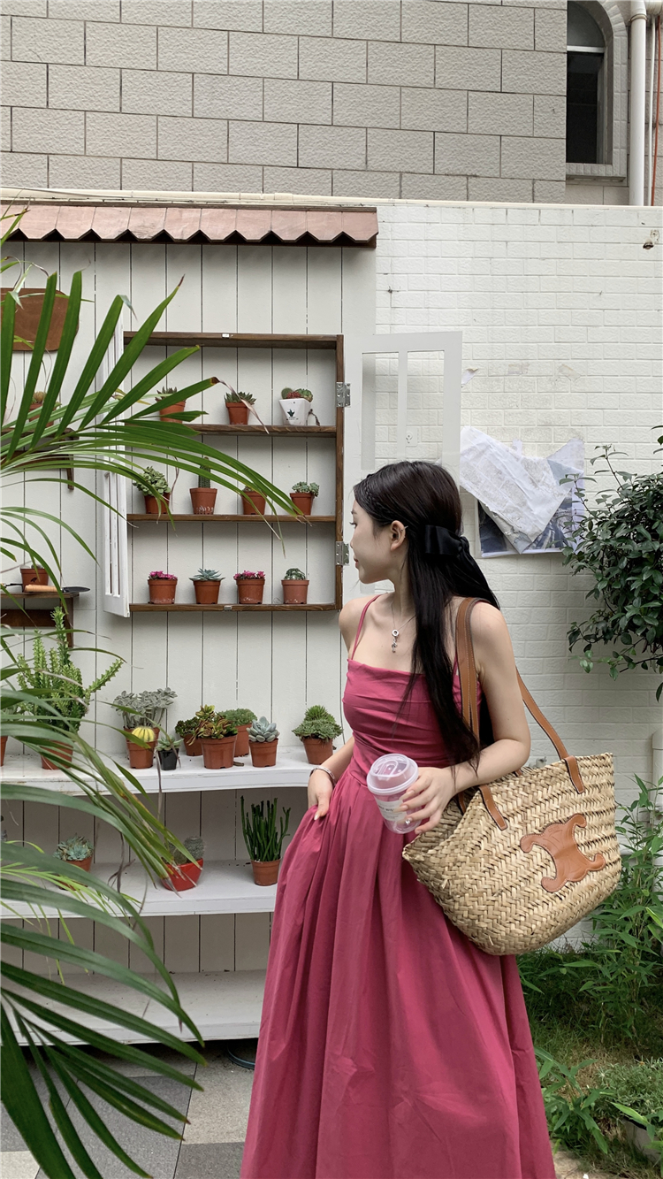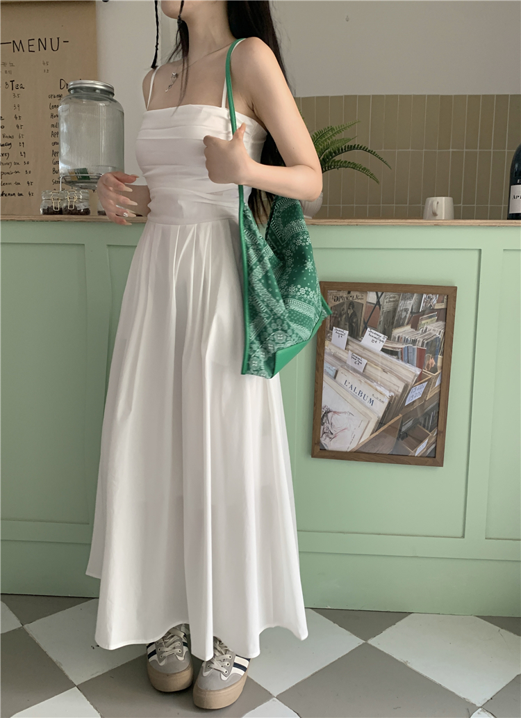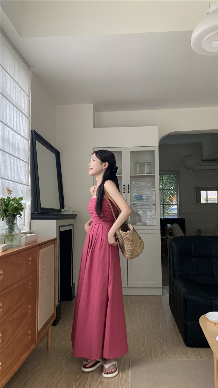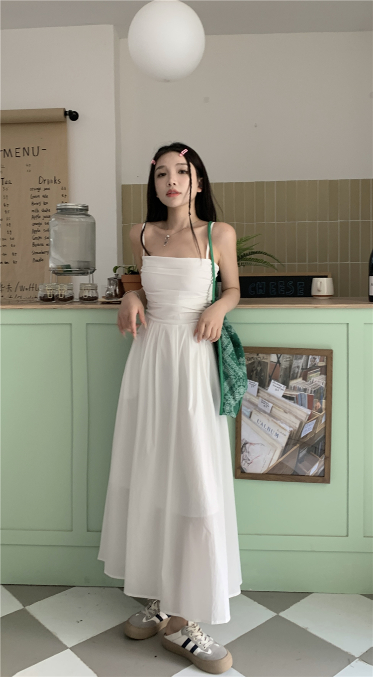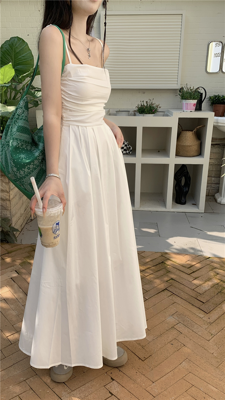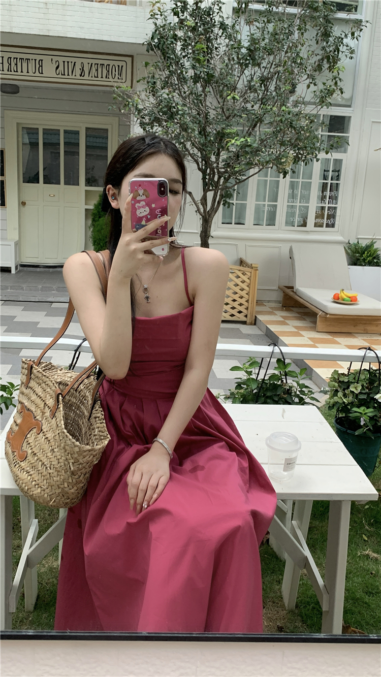 PPHOME嬌欲千金~法式褶皺顯瘦百搭露背氣質中長版吊帶洋裝夏季