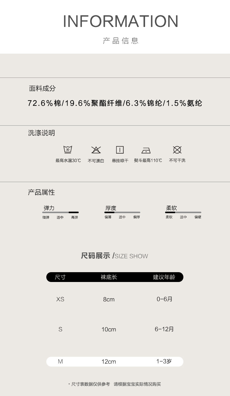 童袜尺码 XS码(0-6个月),S码(6-12个月),M码(1-3岁)