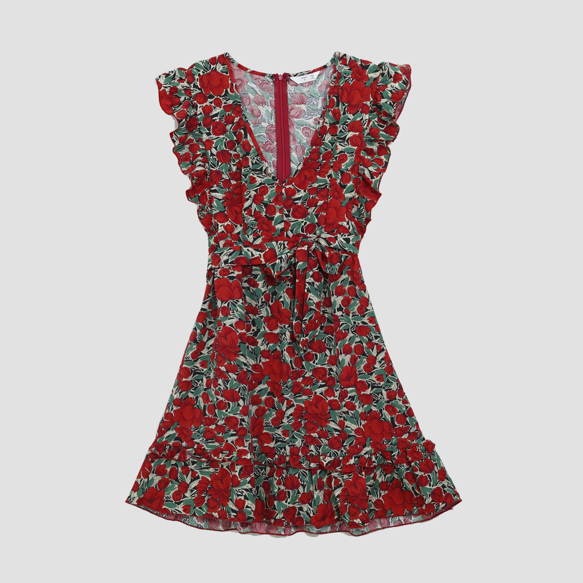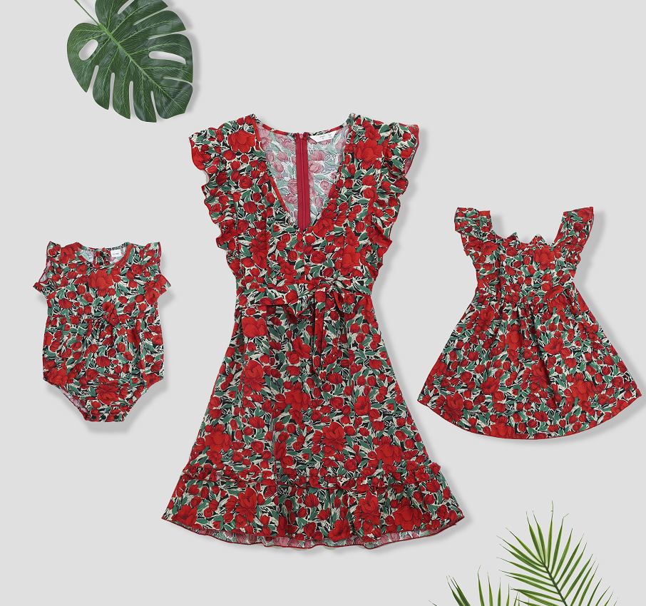 跨境22春秋新品亚马逊爆款欧美女装碎花V领连衣裙独立站亲子童装