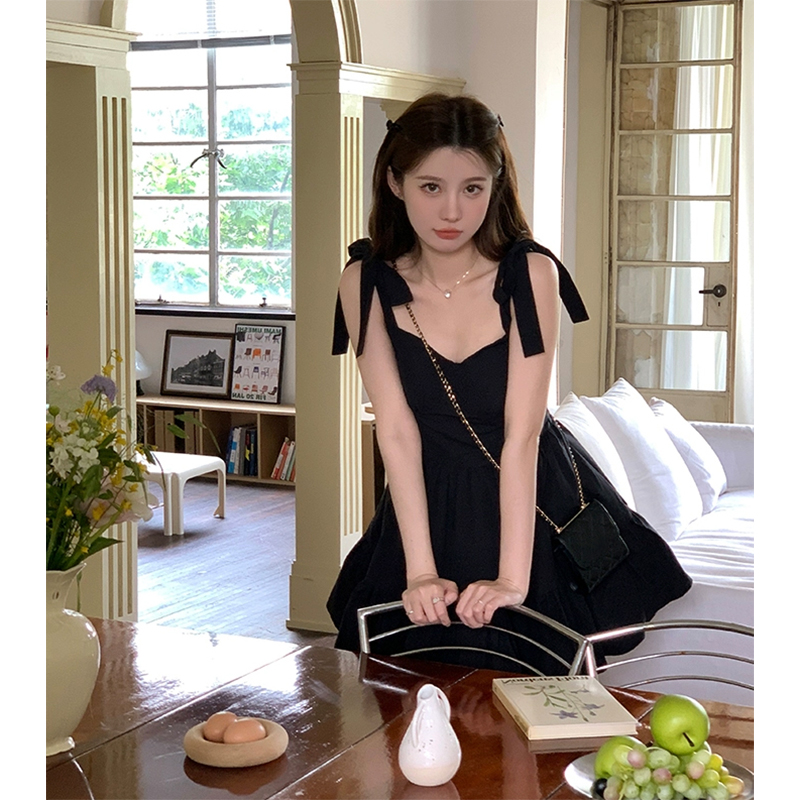 法式少女氣質黑色吊帶洋裝女夏季小眾設計感收腰顯瘦短款A字裙