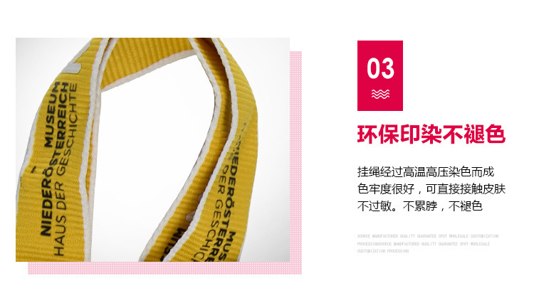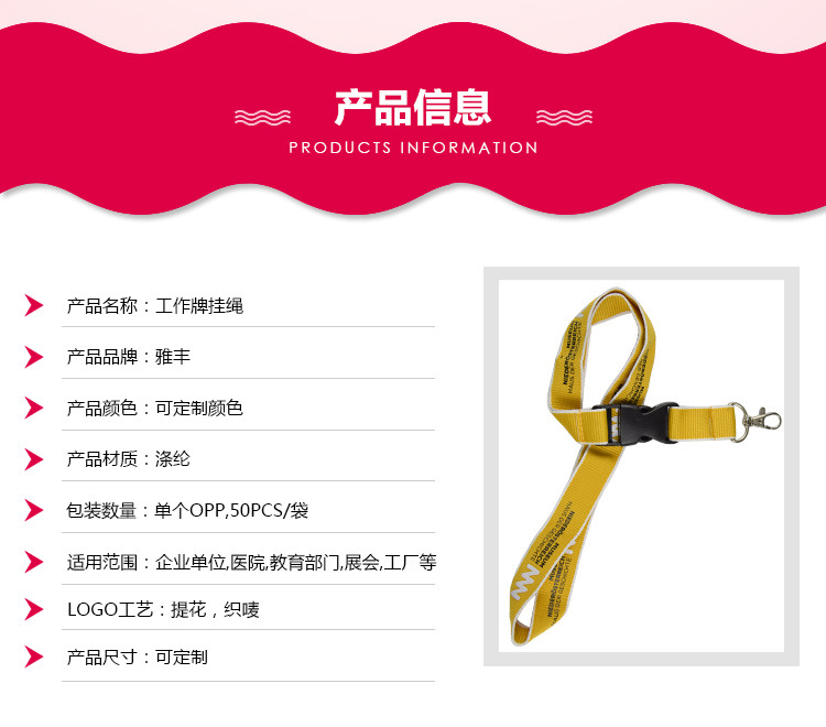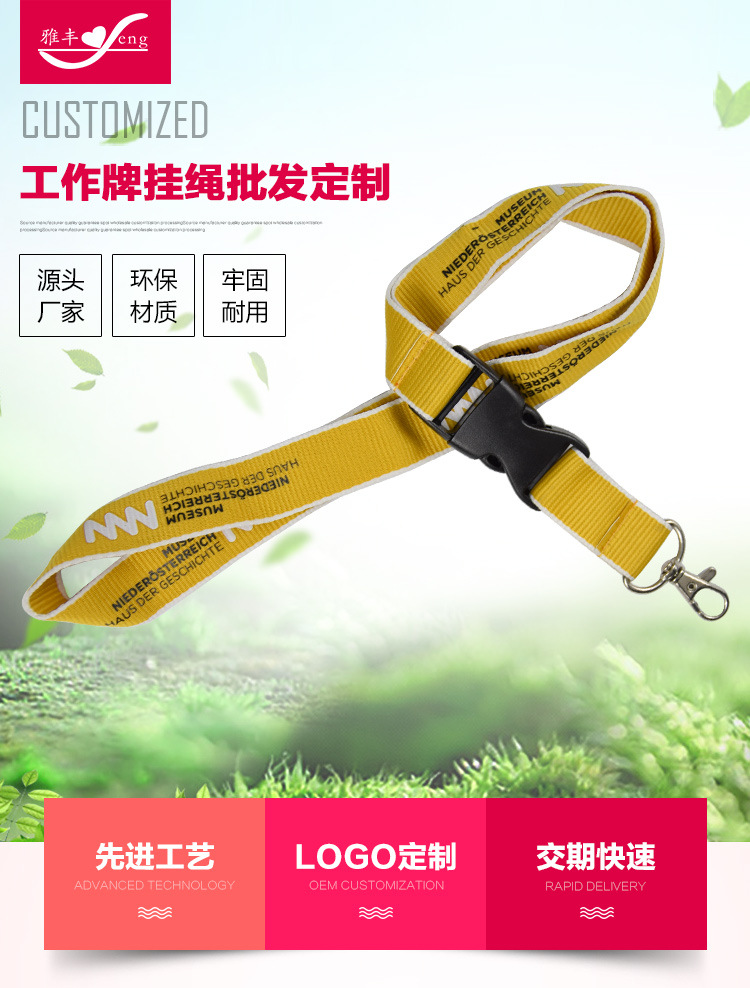 挂绳本体采用优质的涤纶材质,绳面可根据客户要求电脑刺绣公司名与公司Logo;公司员工配带着含有您公司Logo的挂绳,无形中体显出您公司的形象与员工素质。