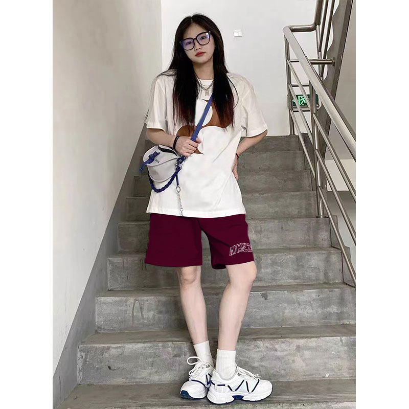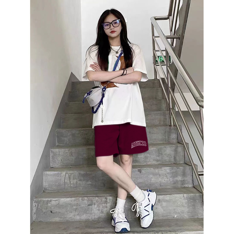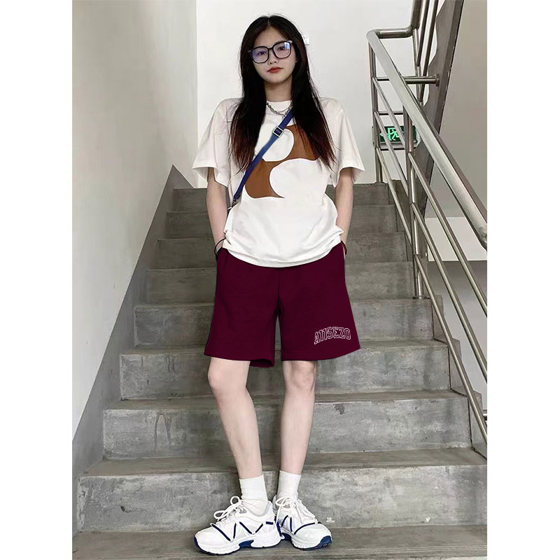 2023夏季新款美式復古流行紅色運動褲短褲寬鬆休閒褲女高腰五分褲