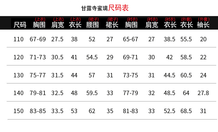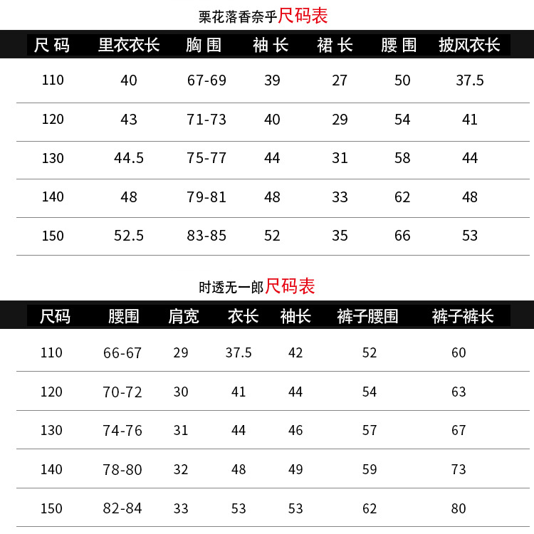 尺码 110,120,130,140,150