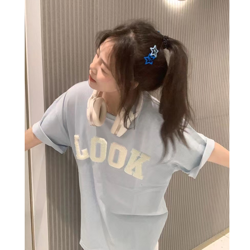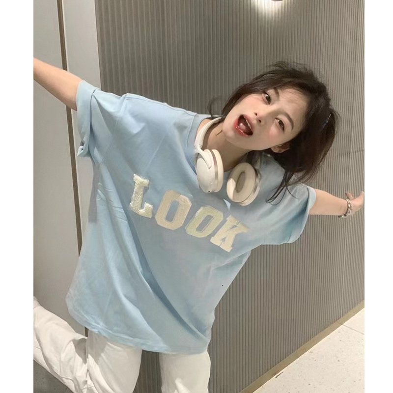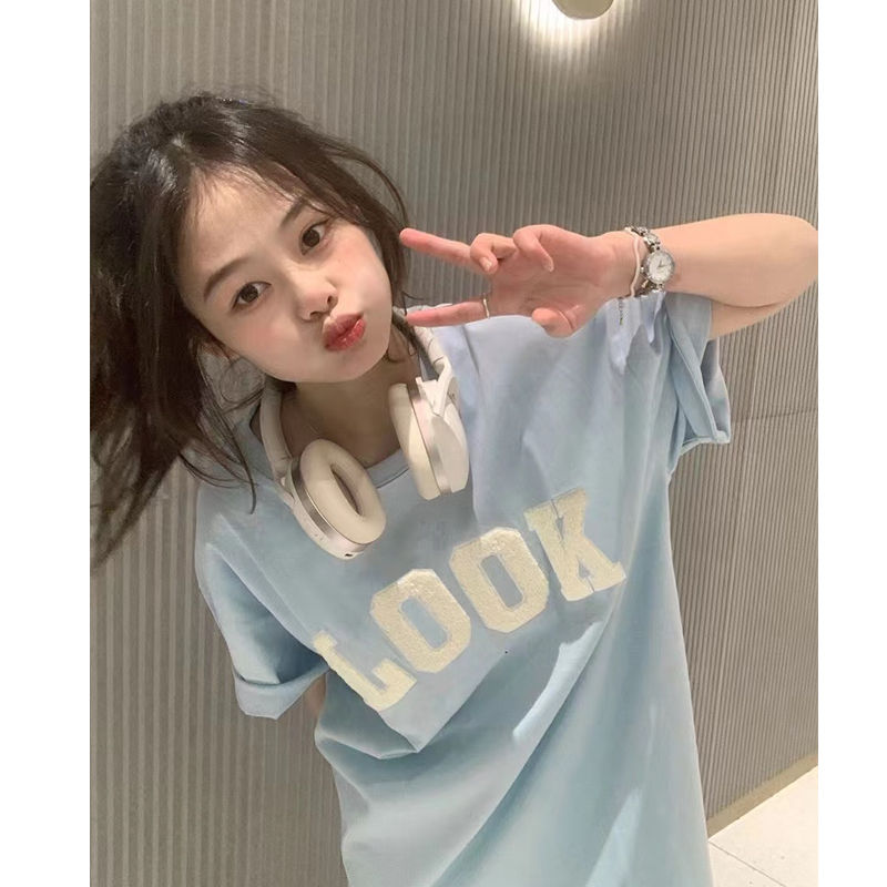 潮牌美式復古刺繡正肩短袖t恤女夏季純棉小眾設計感chic港味上衣
