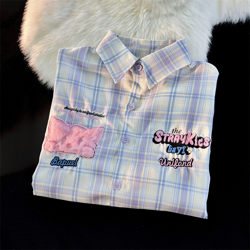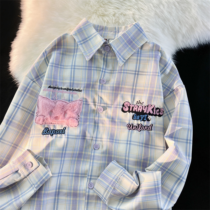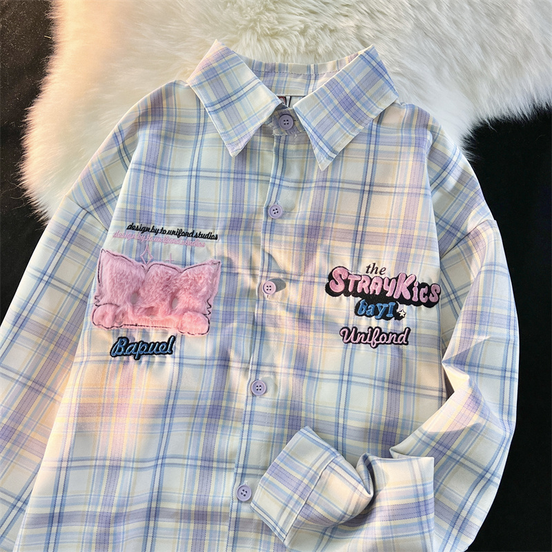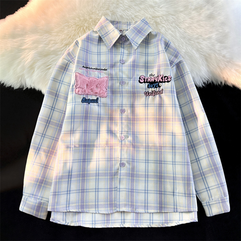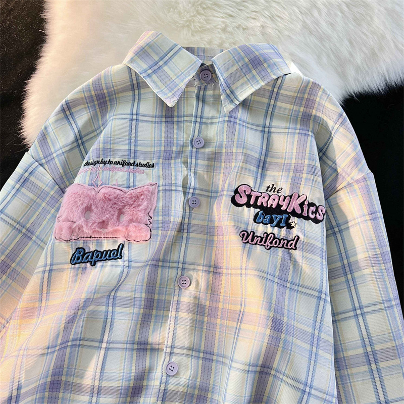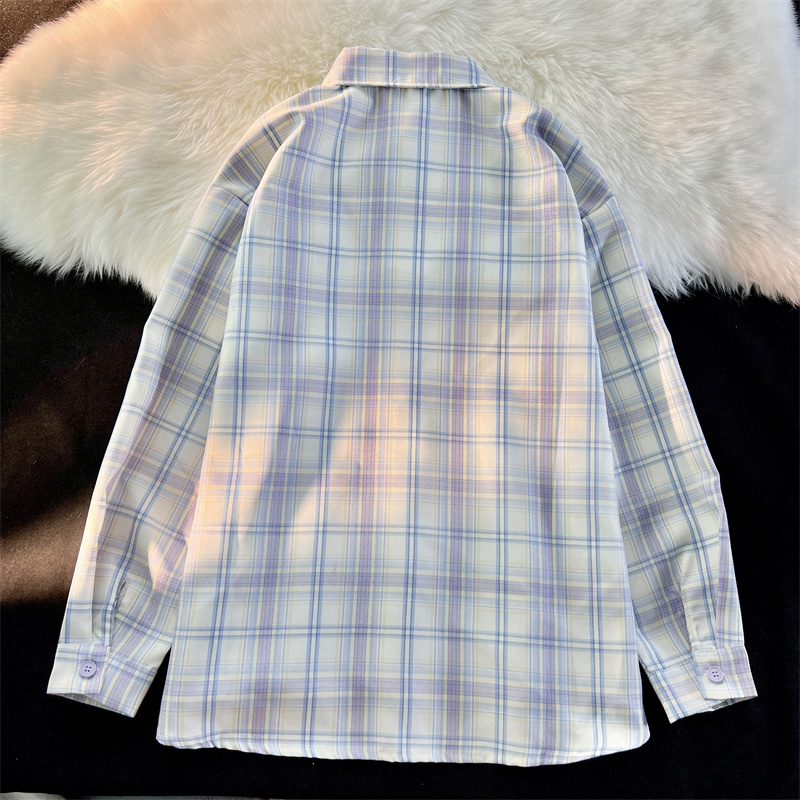日系甜美風格子襯衫女秋季復古寬鬆韓系慵懶風chic長袖襯衫防曬衣