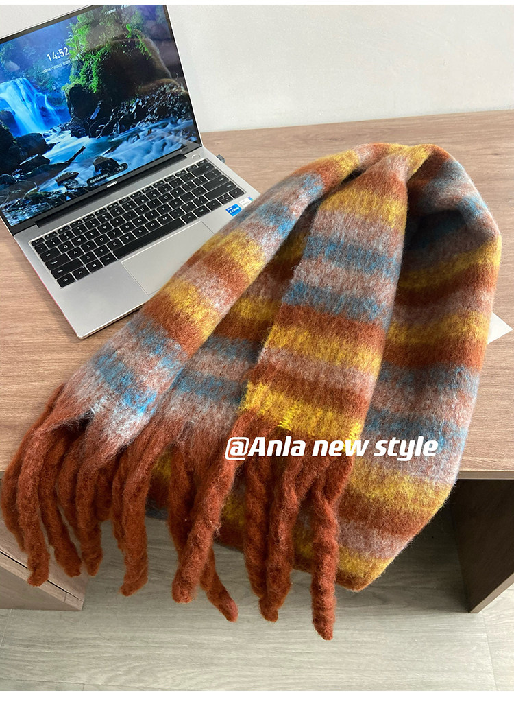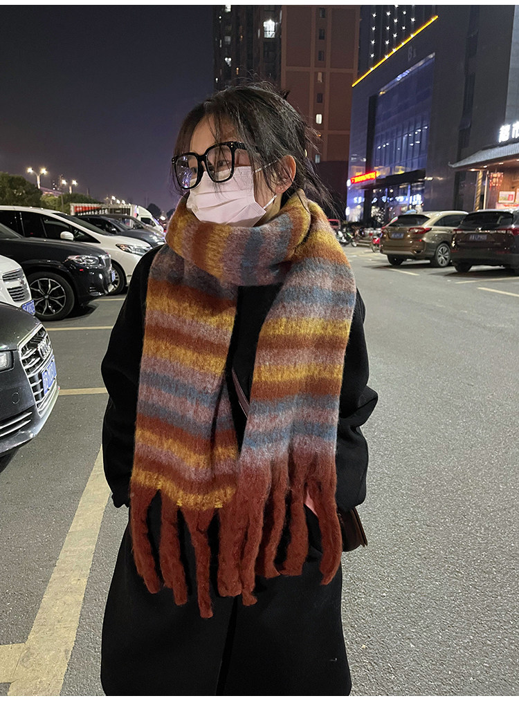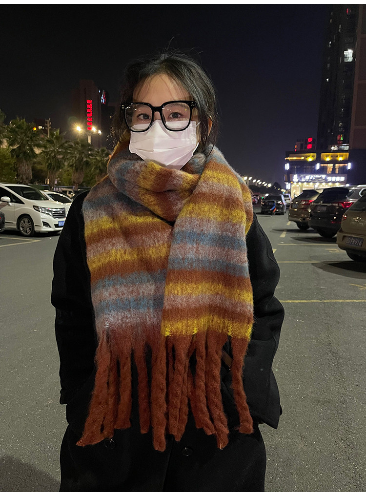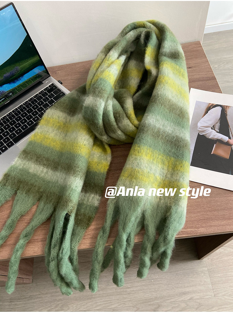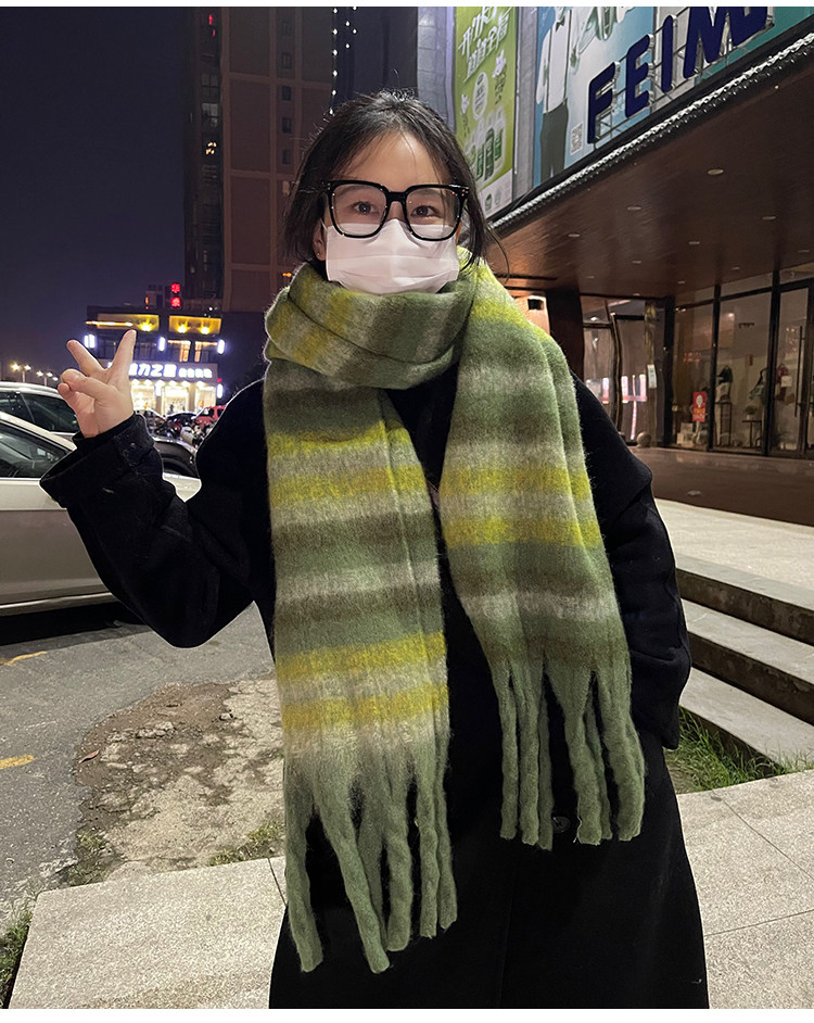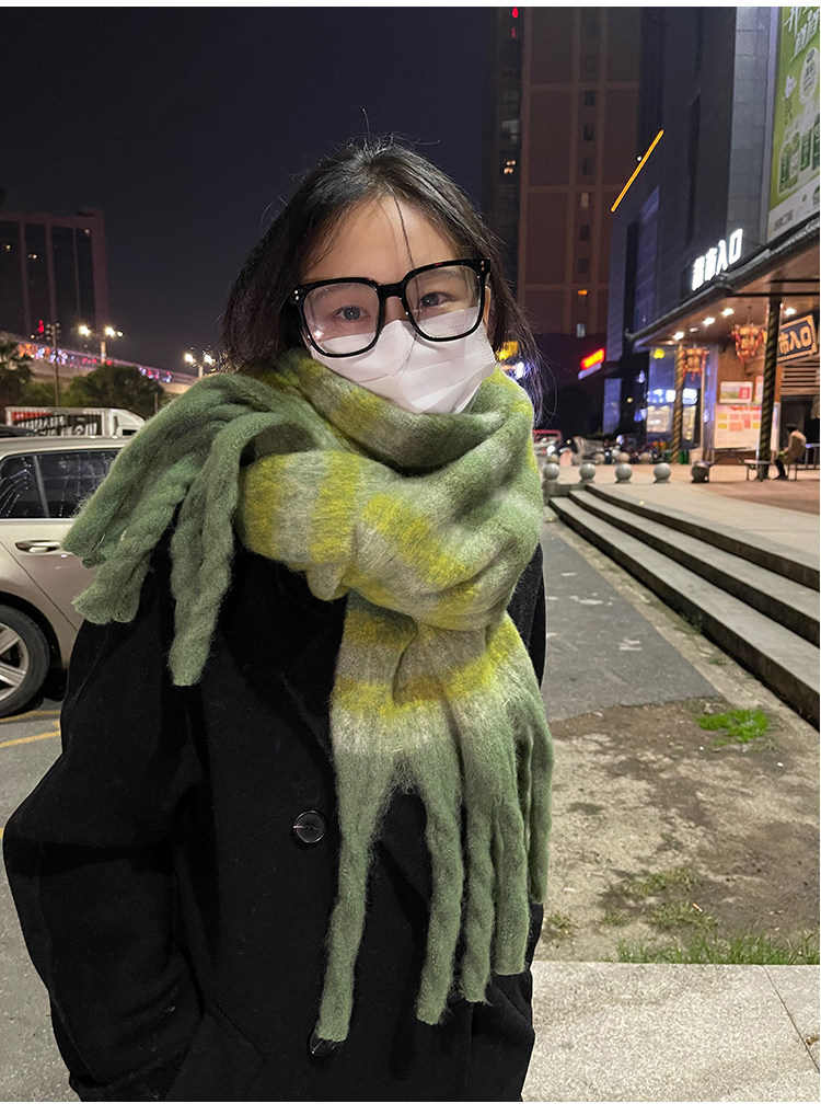 韓系氛圍感森林綠圍巾女冬季彩色條紋加厚流蘇保暖高級感毛絨圍脖
