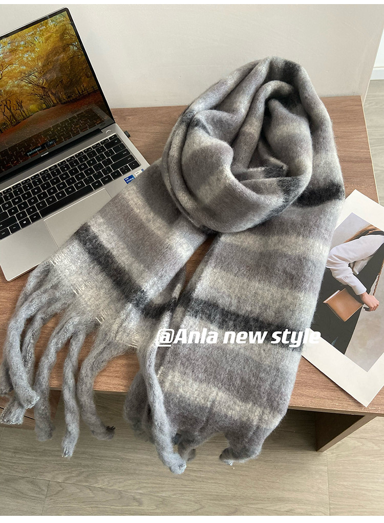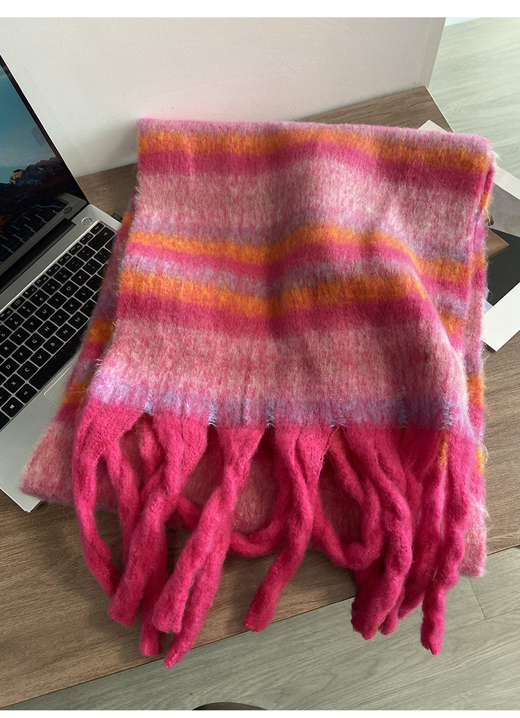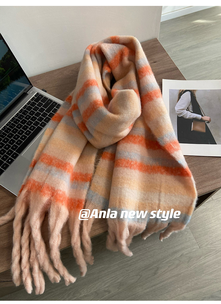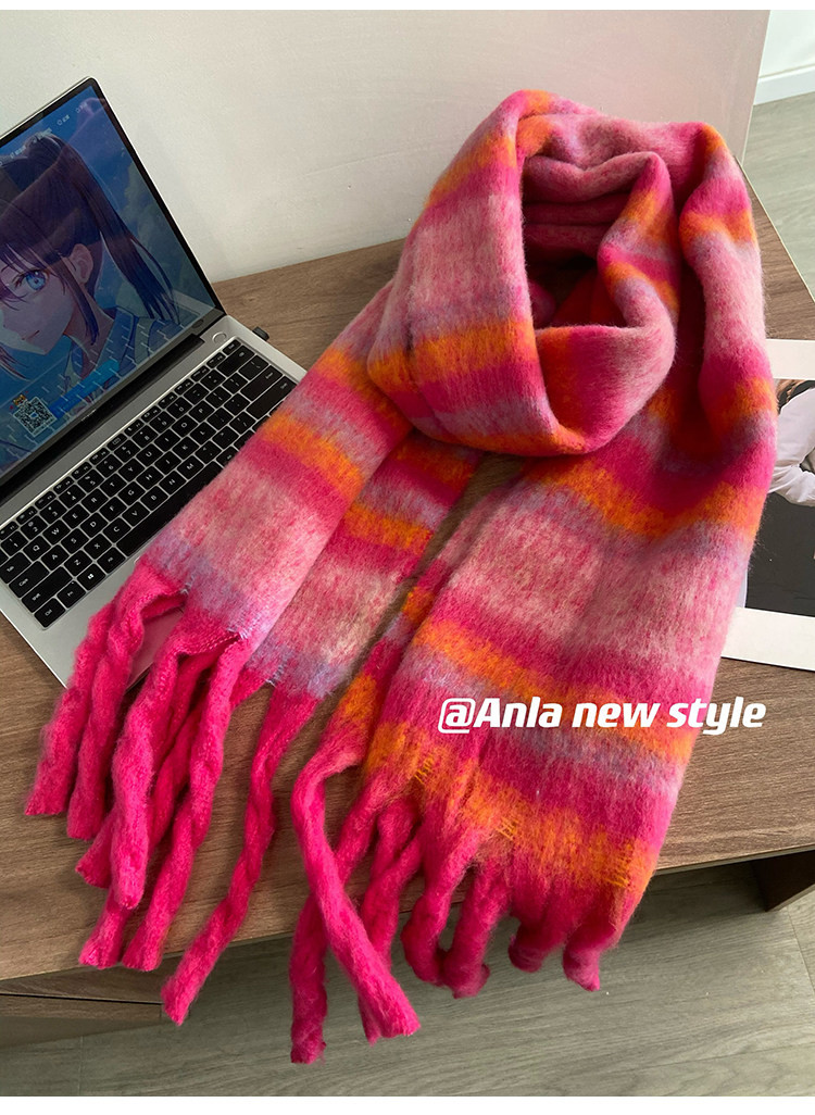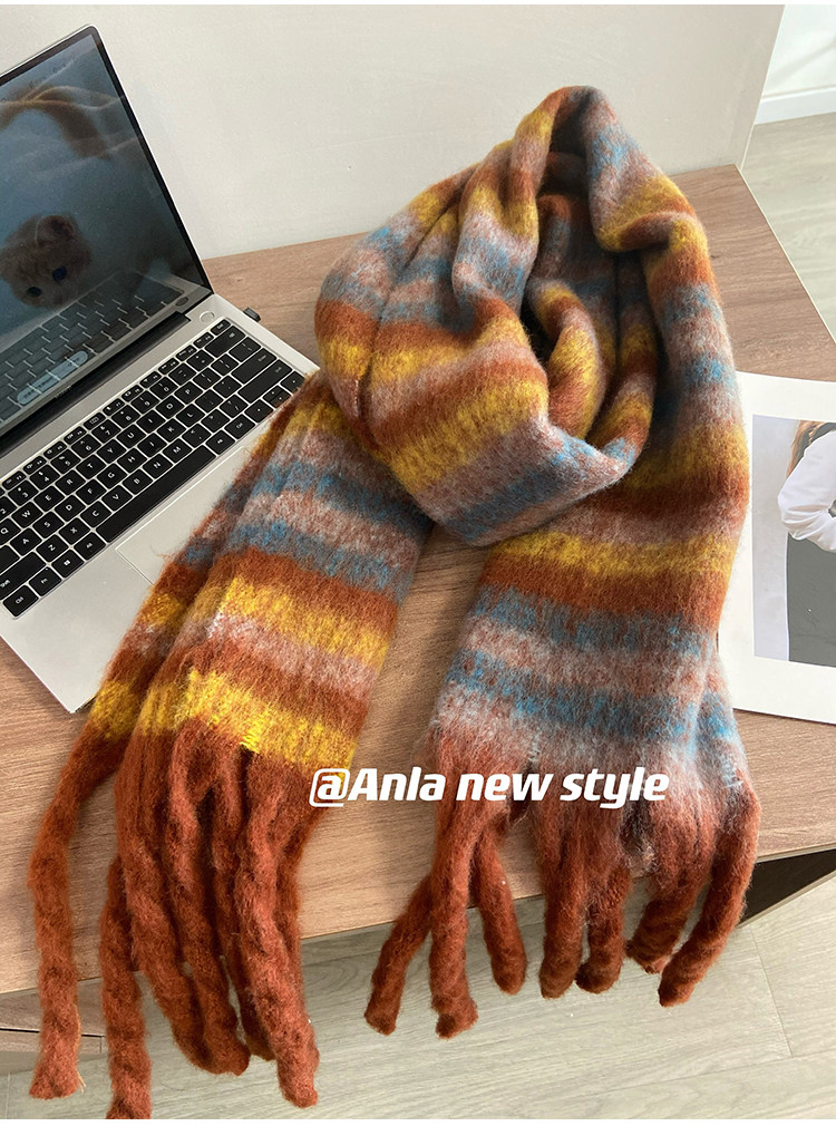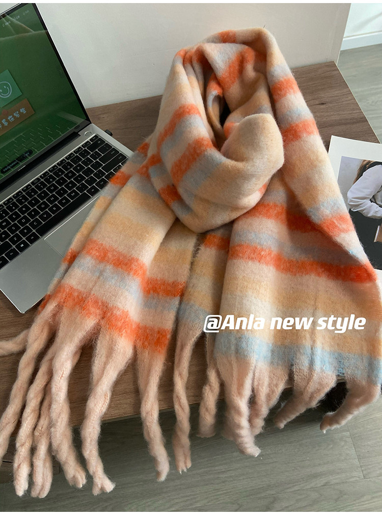 韓系氛圍感森林綠圍巾女冬季彩色條紋加厚流蘇保暖高級感毛絨圍脖