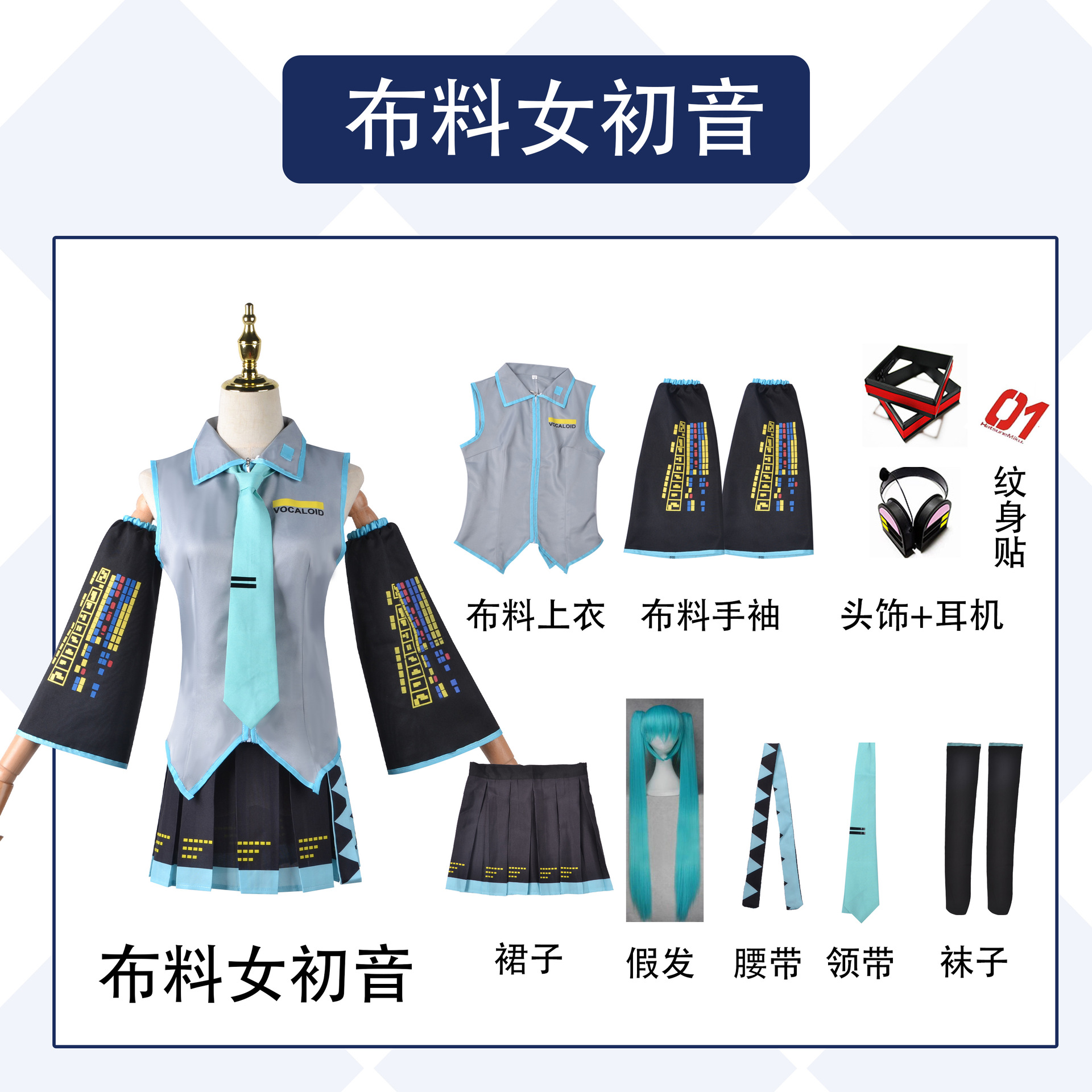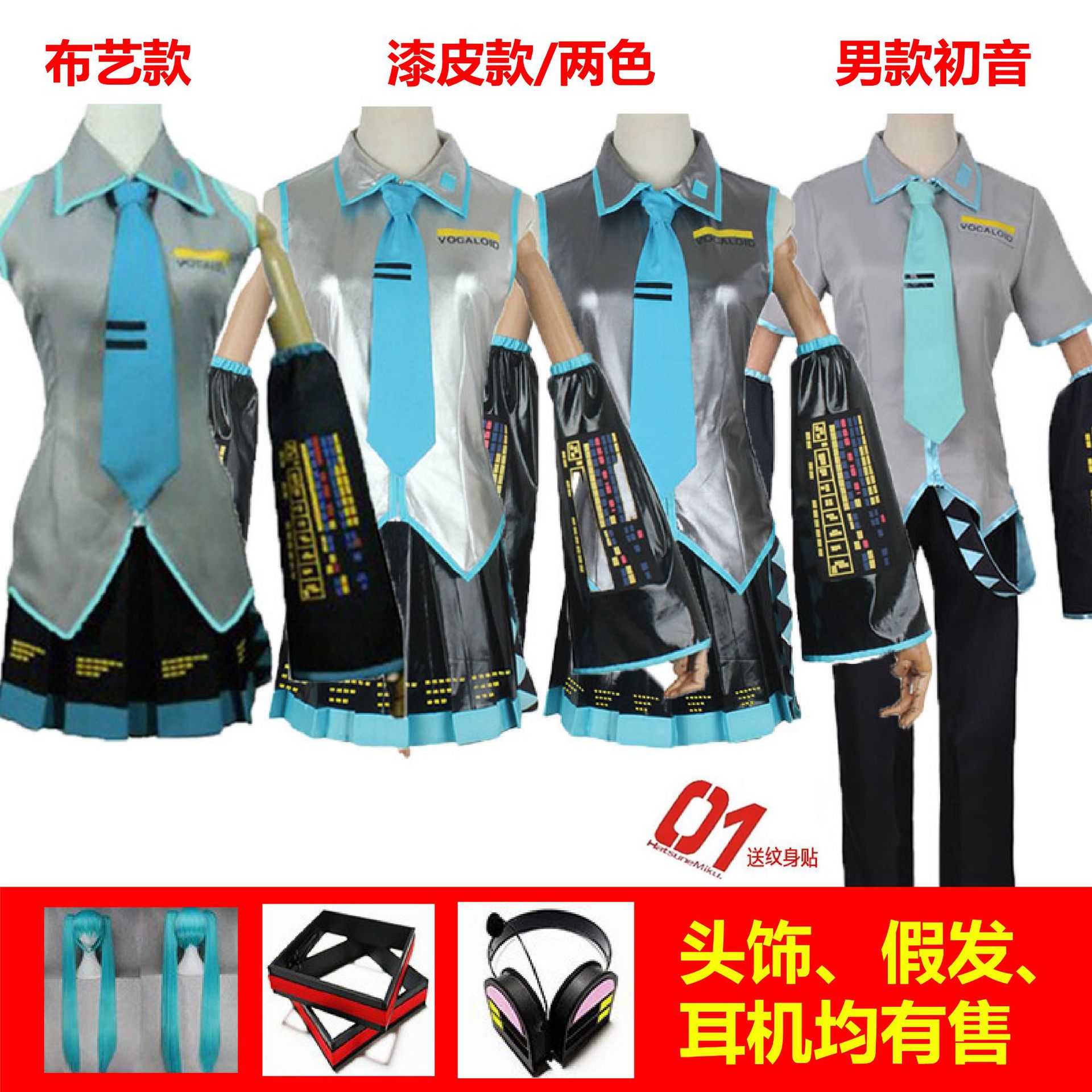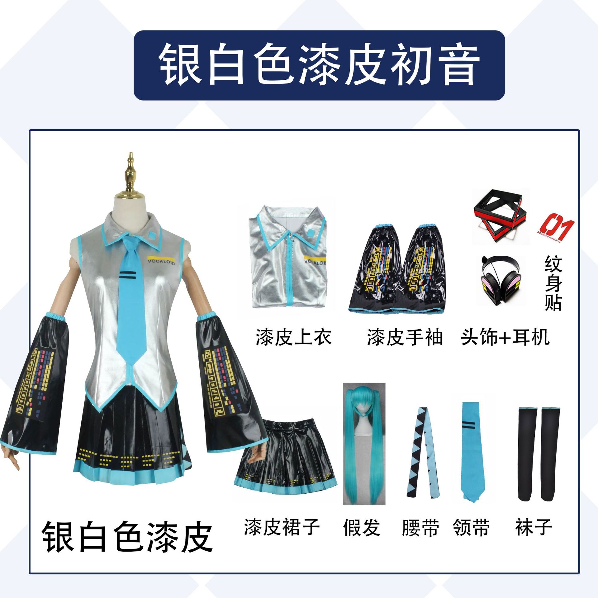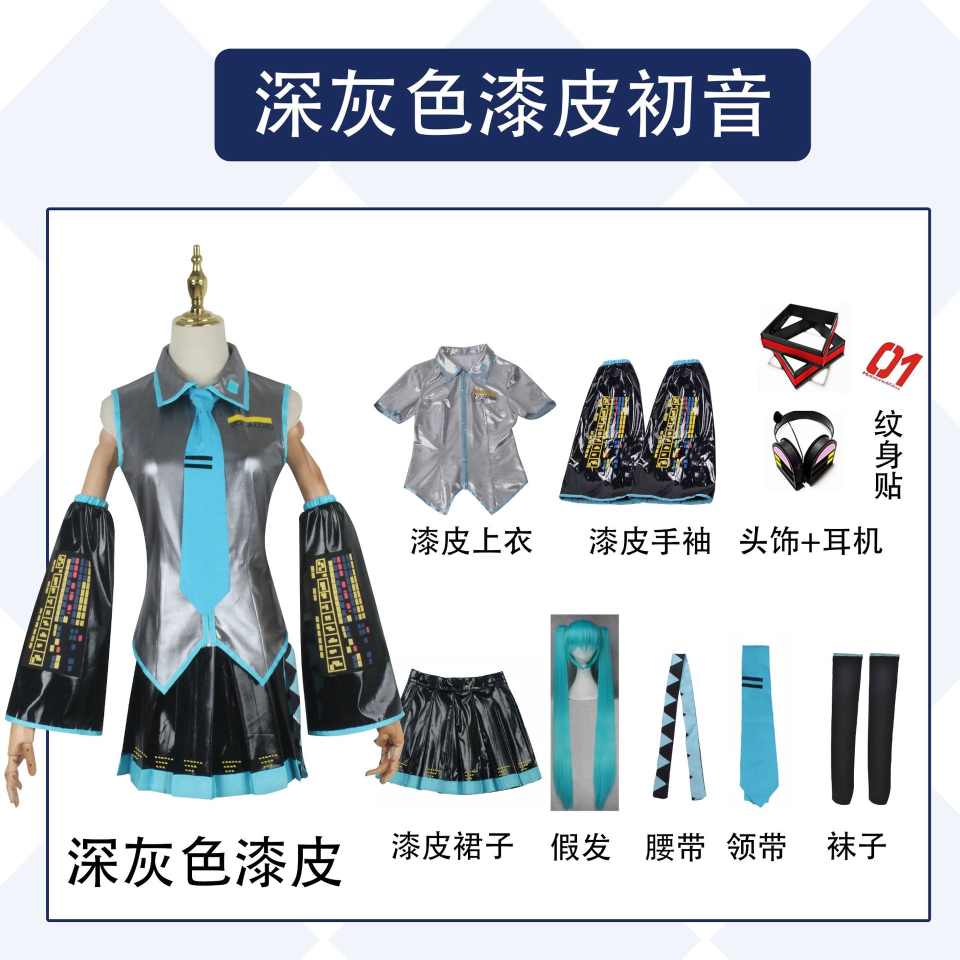 颜色 布料女款全套现货(上衣+裙子+手袖+袜子+领带),假发,头饰,耳机,(头饰+耳机),布料初音超级大全套(衣服+假发+头饰耳机),银白色漆皮全套,深灰色漆皮现货,男初音,银白色全套+耳机+头饰+假发,银灰色全套+耳机+头饰+假发,漆皮男初音服装,初音未来鞋子(请备注尺码)