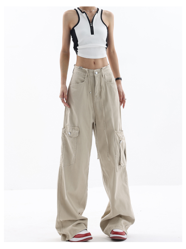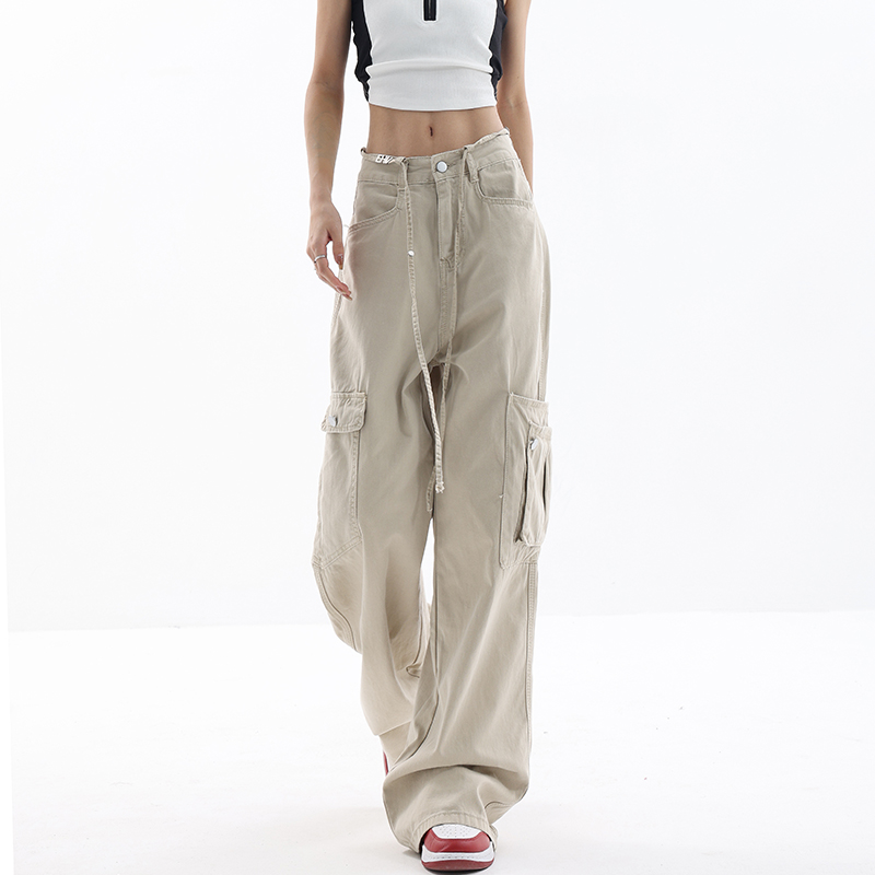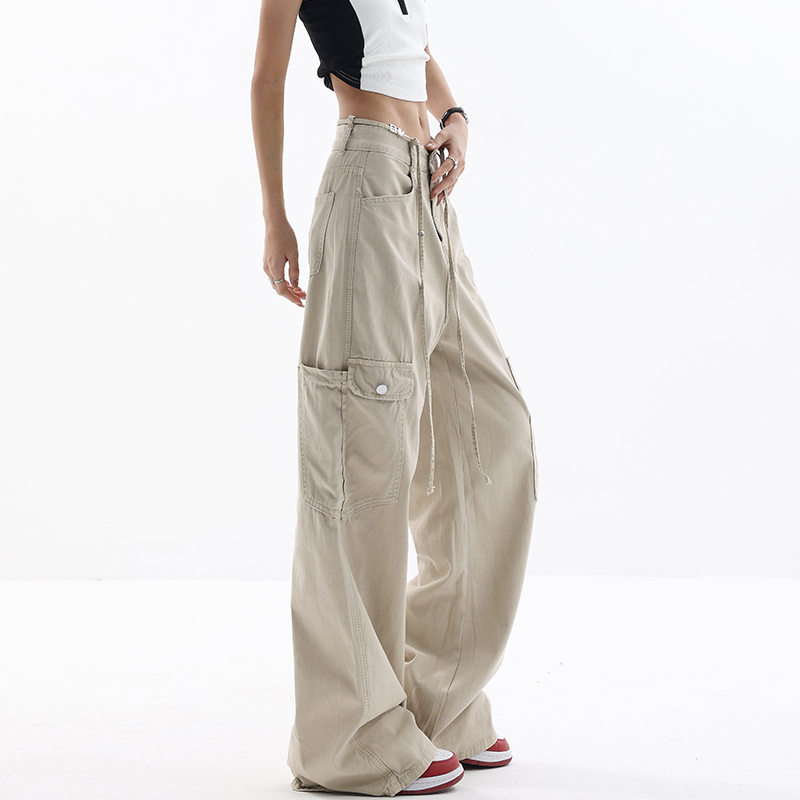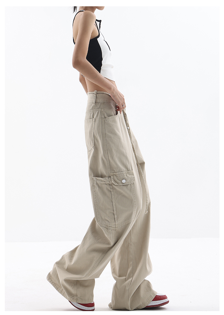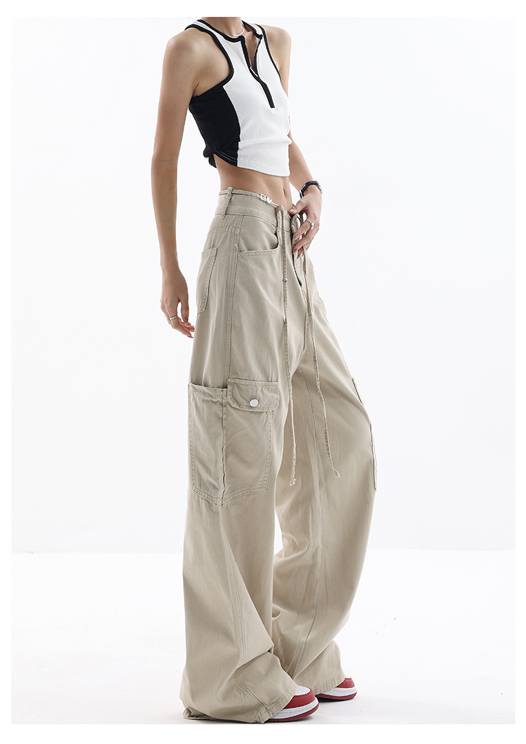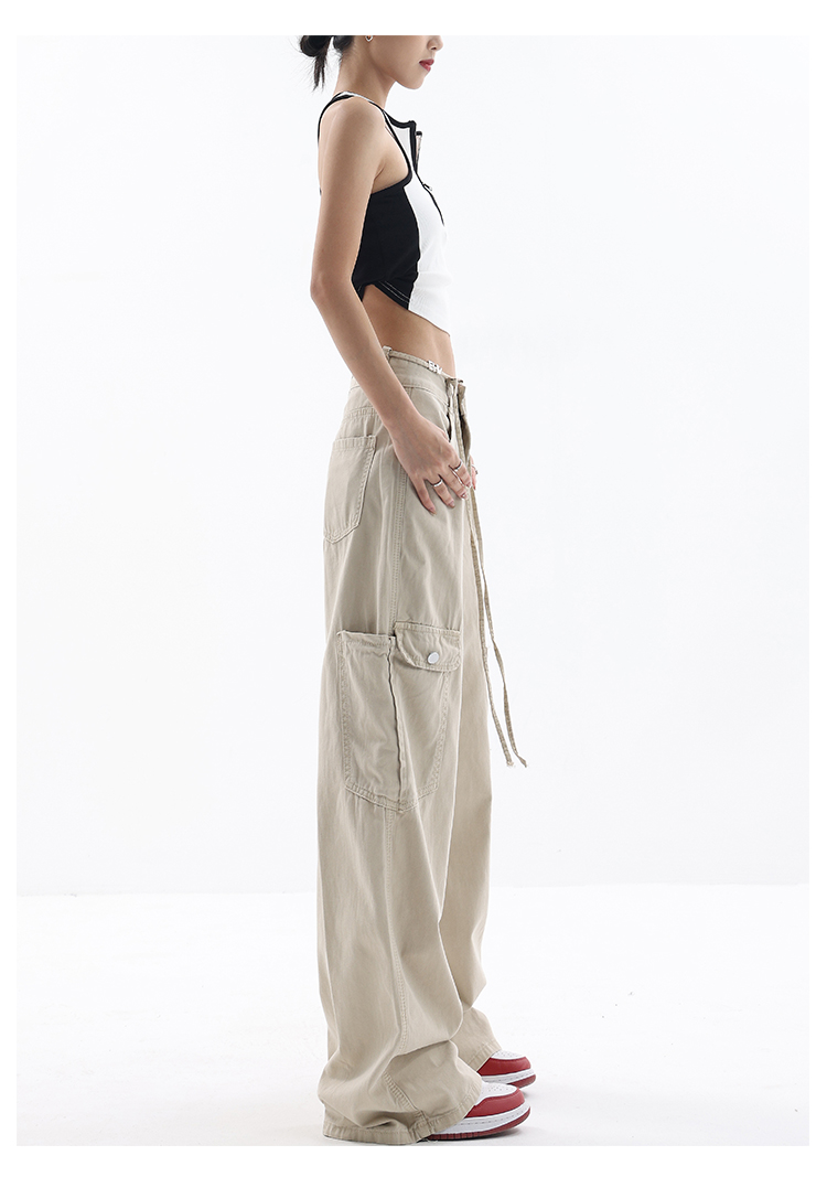 KEN STUDIO美式復古工裝褲女夏季抽繩大口袋設計感寬鬆闊腿褲褲子