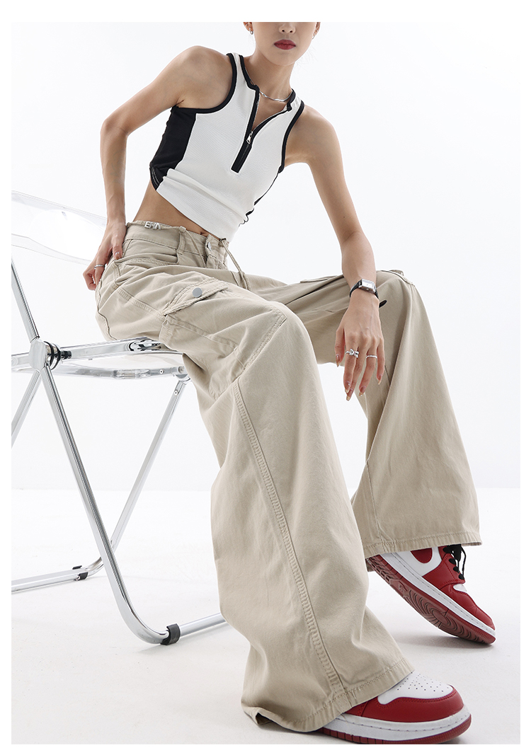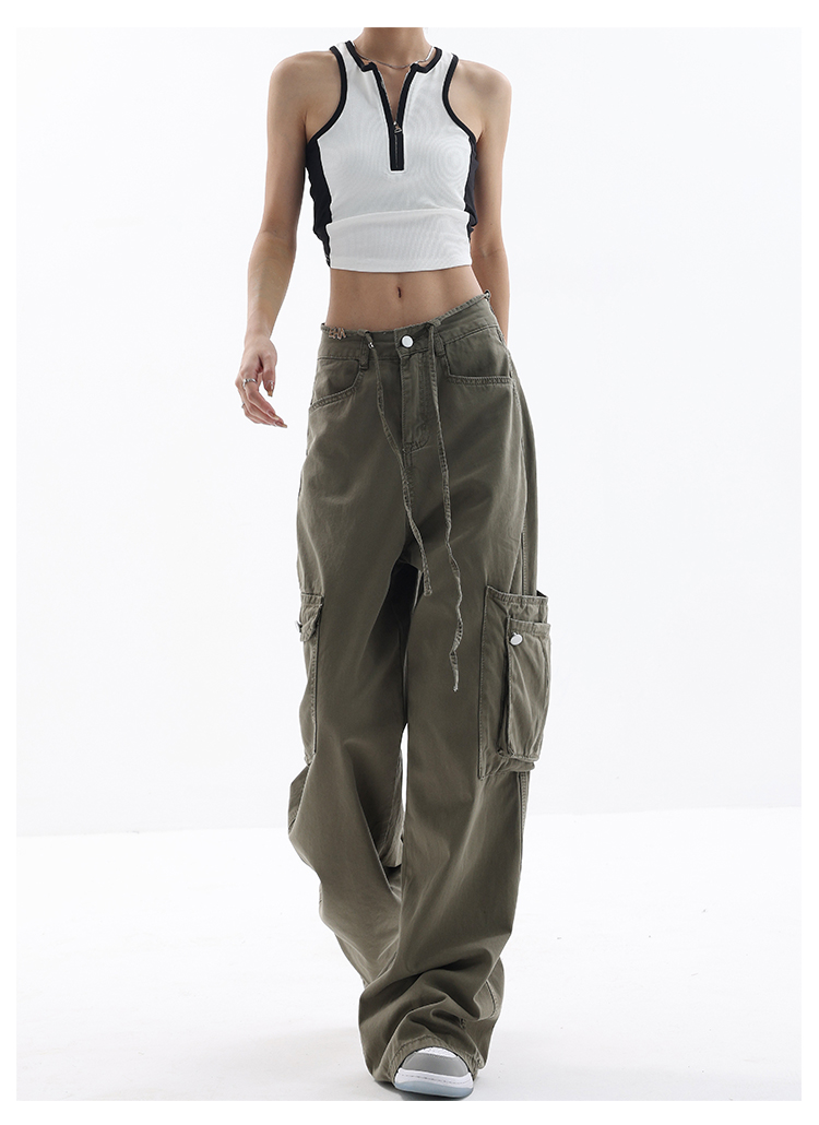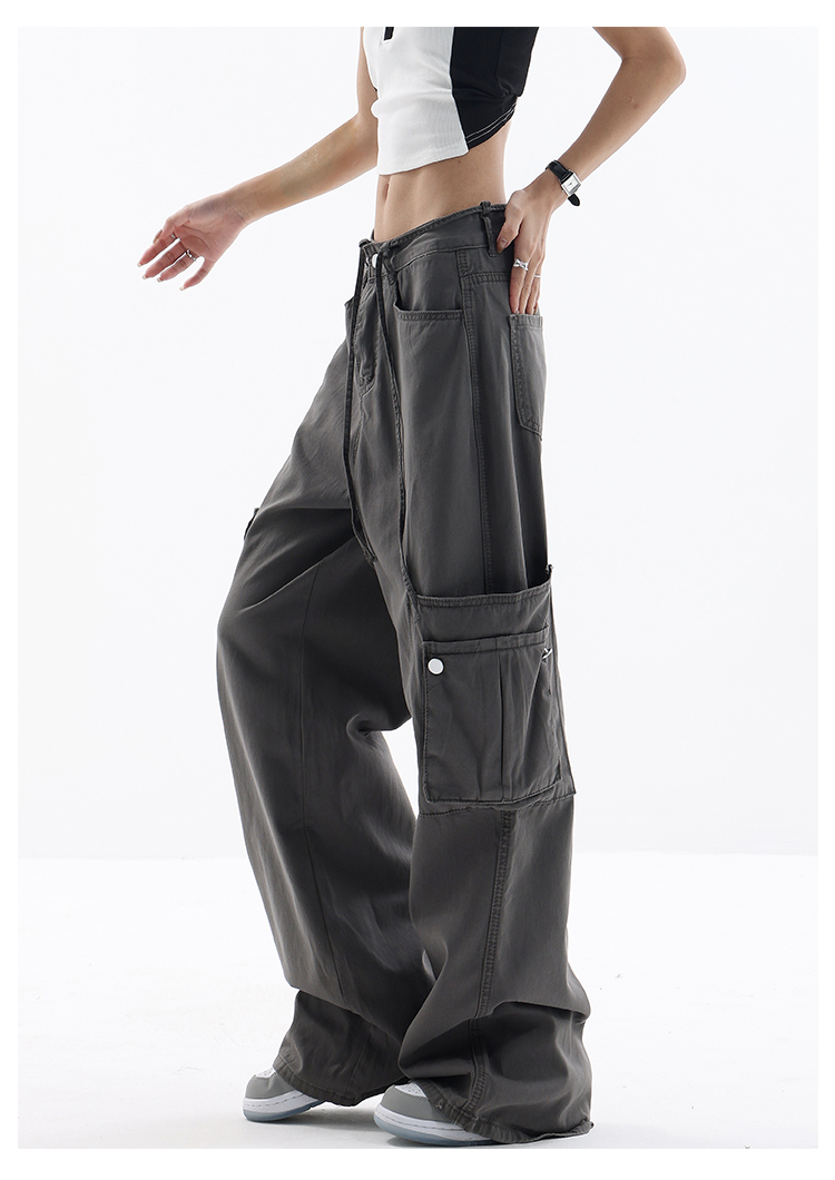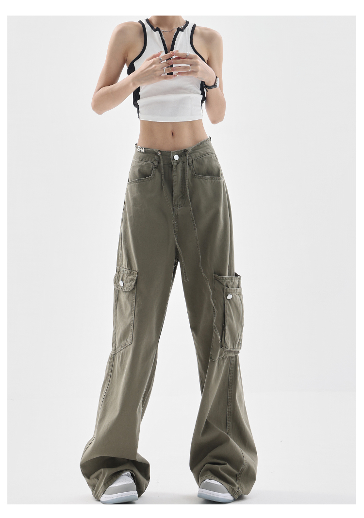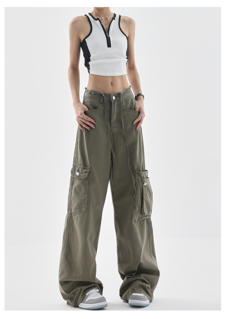 KEN STUDIO美式復古工裝褲女夏季抽繩大口袋設計感寬鬆闊腿褲褲子