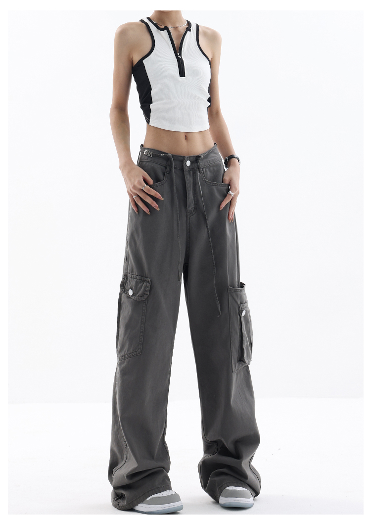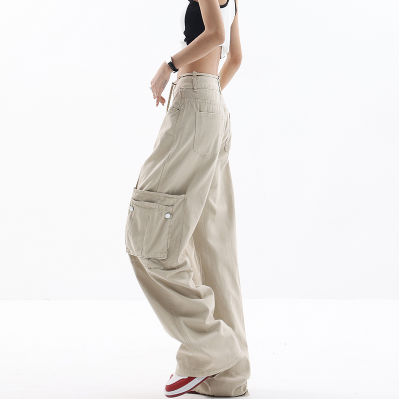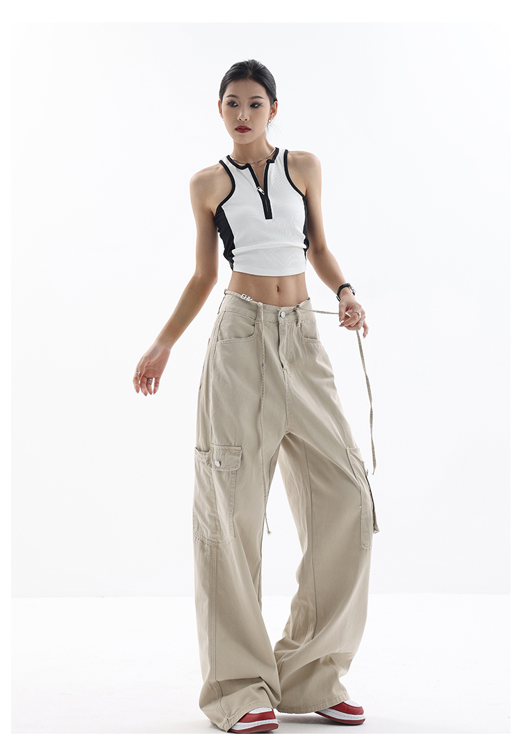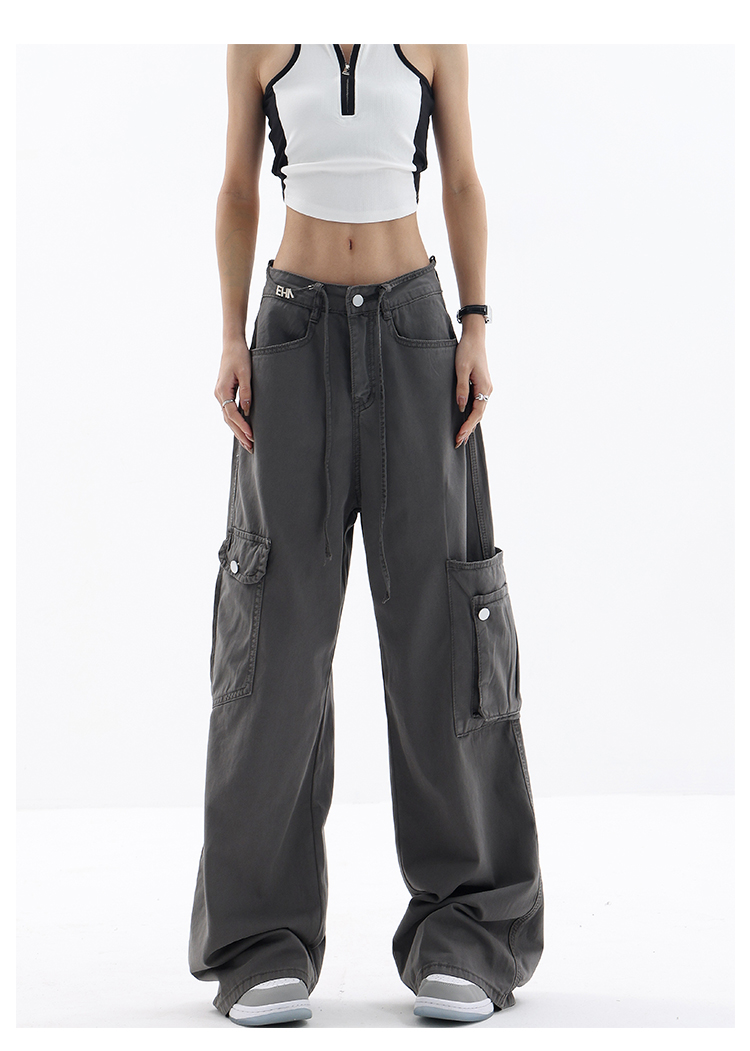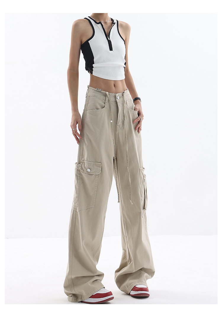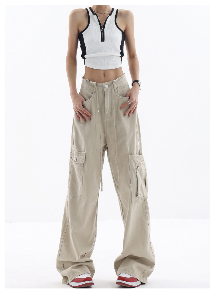 KEN STUDIO美式復古工裝褲女夏季抽繩大口袋設計感寬鬆闊腿褲褲子