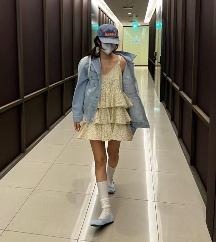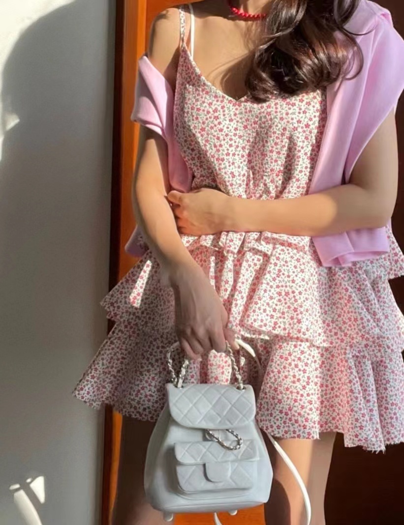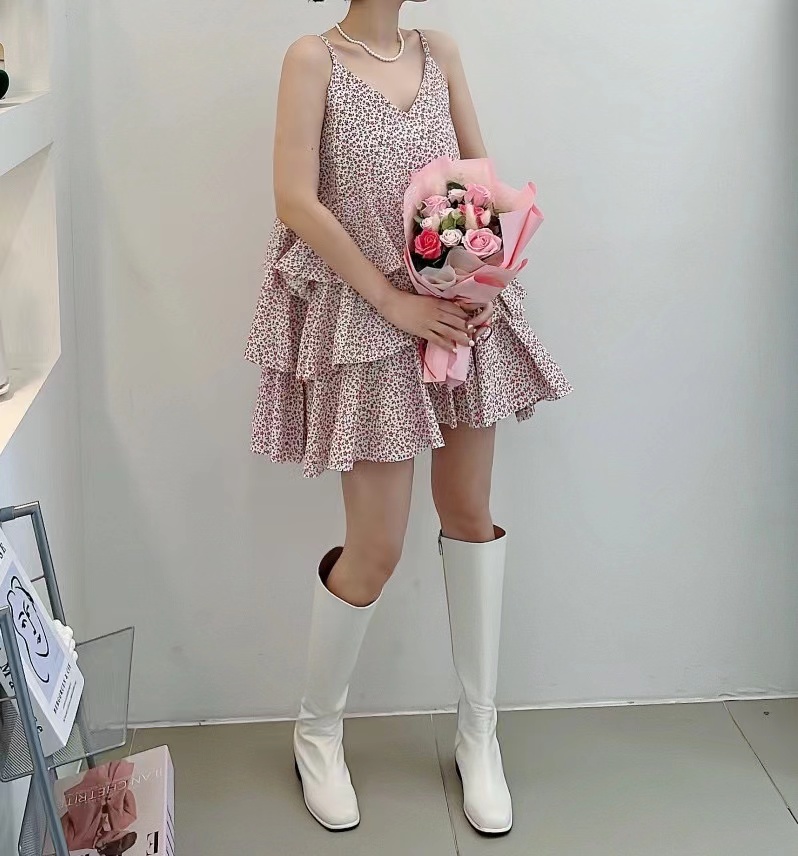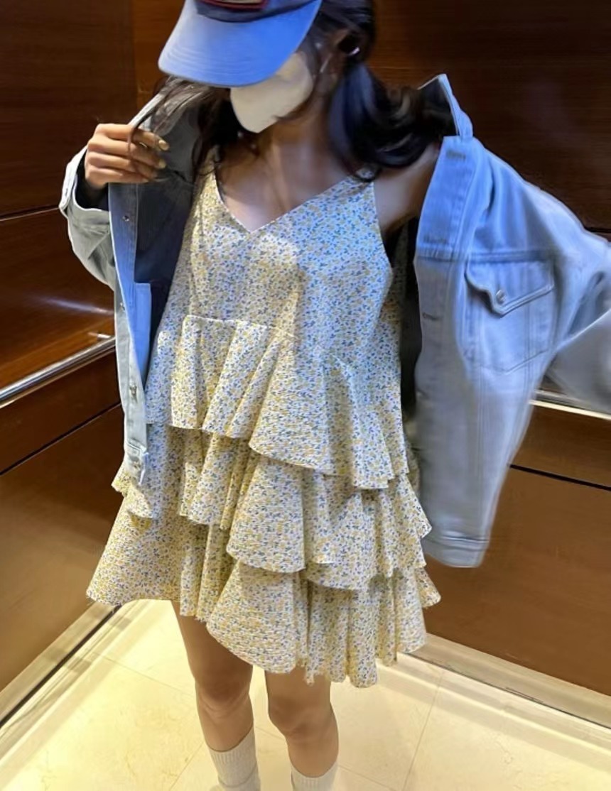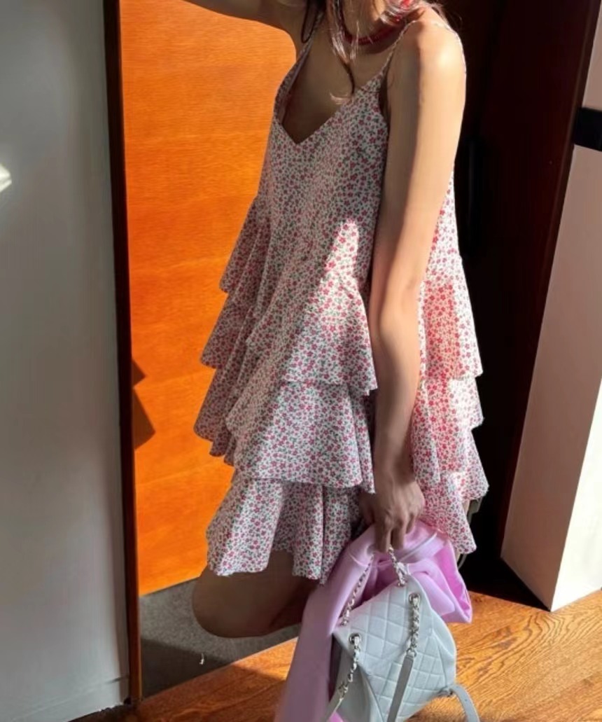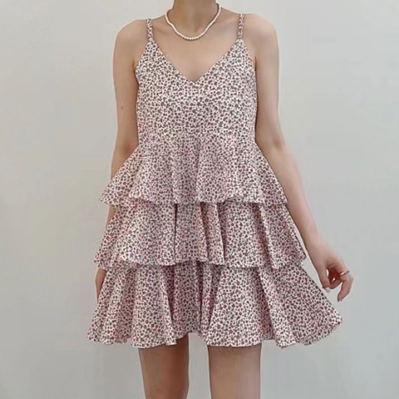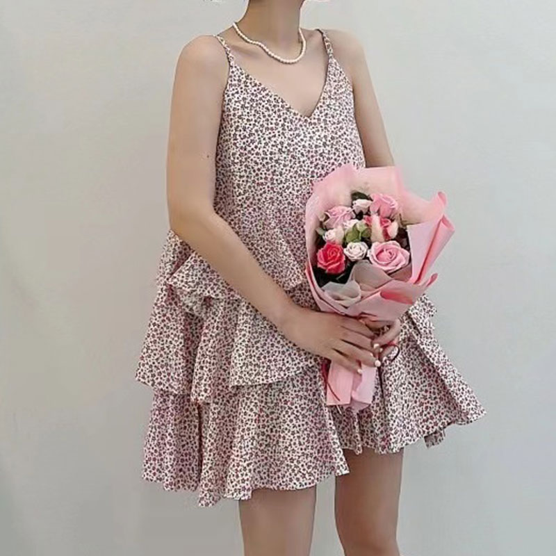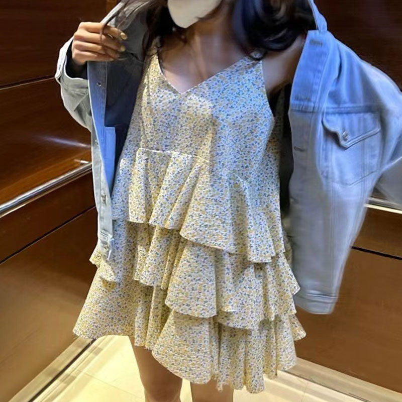 韩国chic夏季温柔气质V领撞色满屏碎花荷叶边层层蛋糕吊带连衣裙