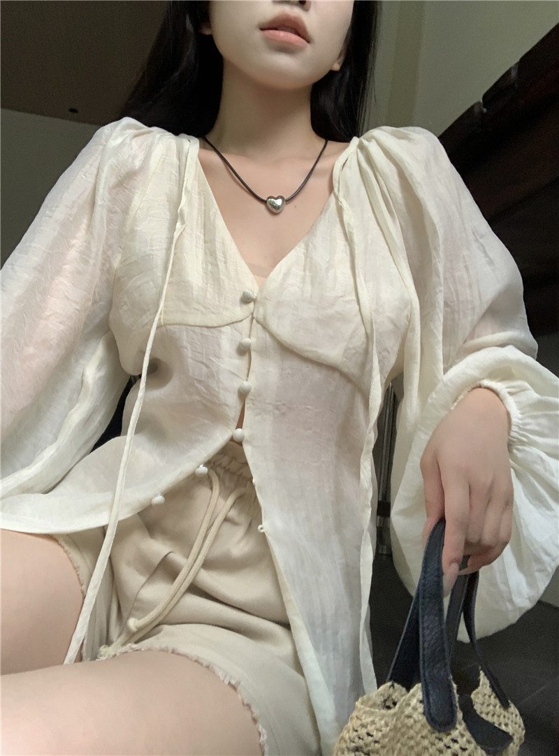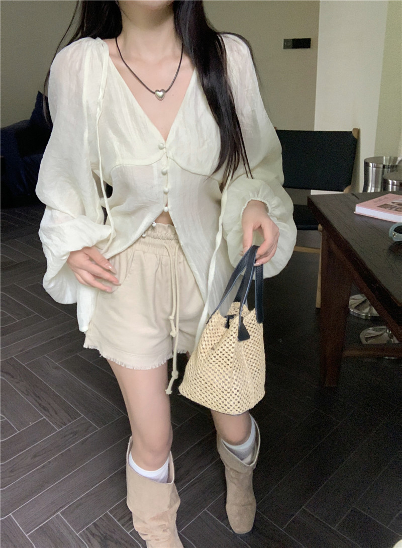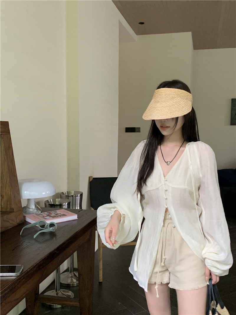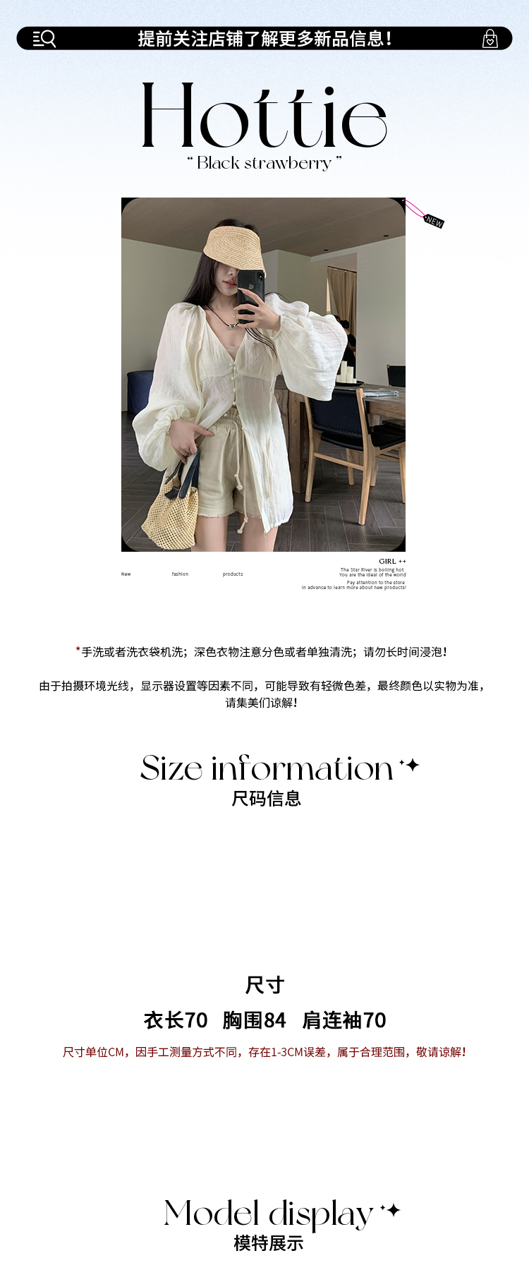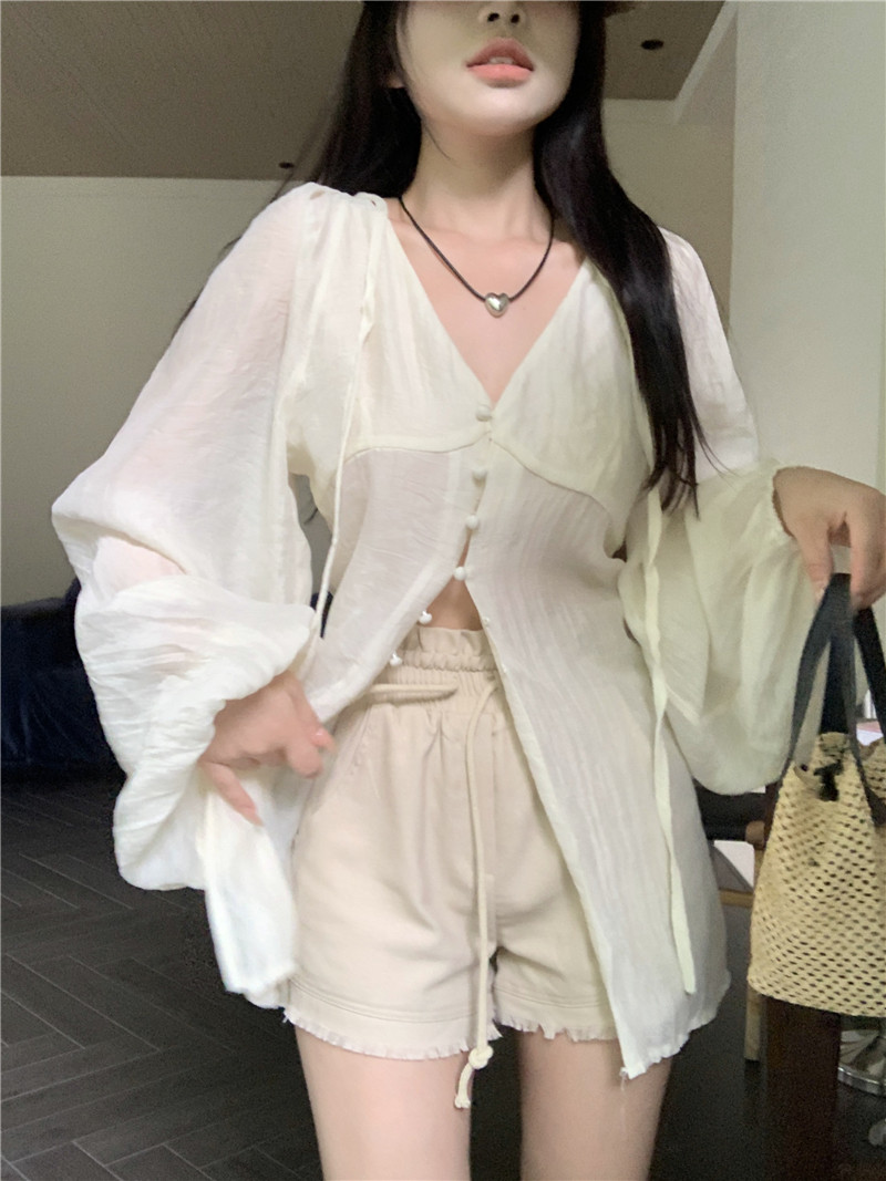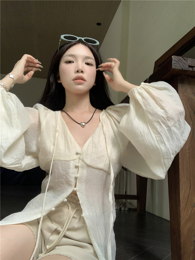 純色長袖雪紡襯衫女裝秋季V領泡泡袖薄款襯衫飄帶中長版防曬上衣
