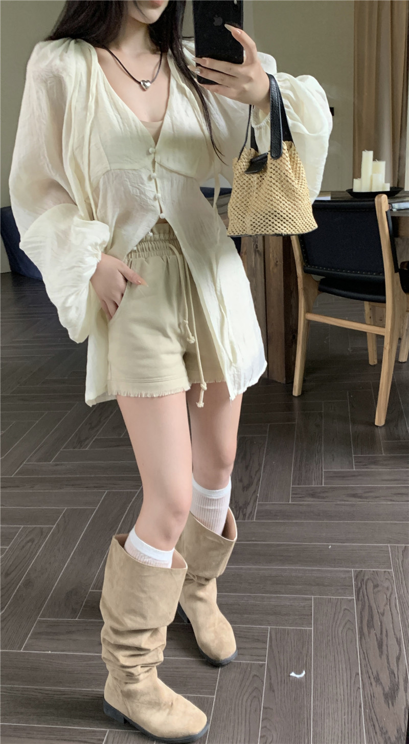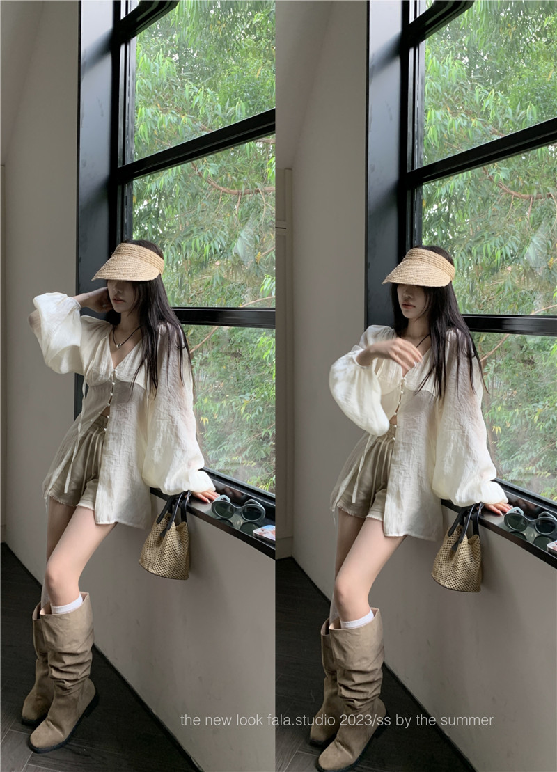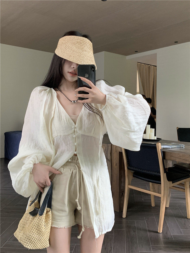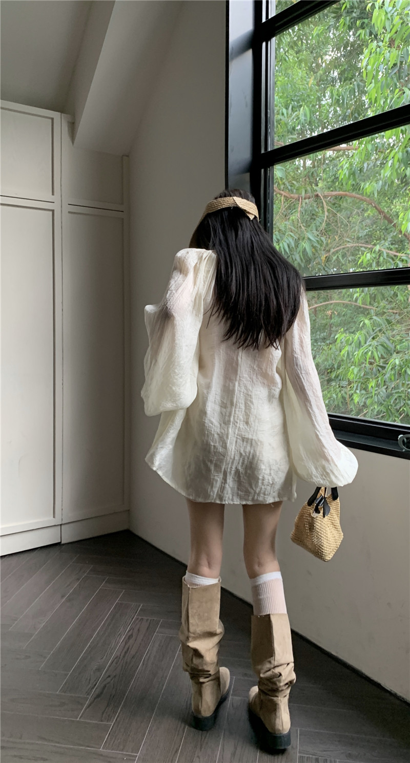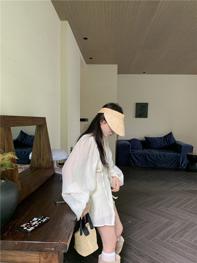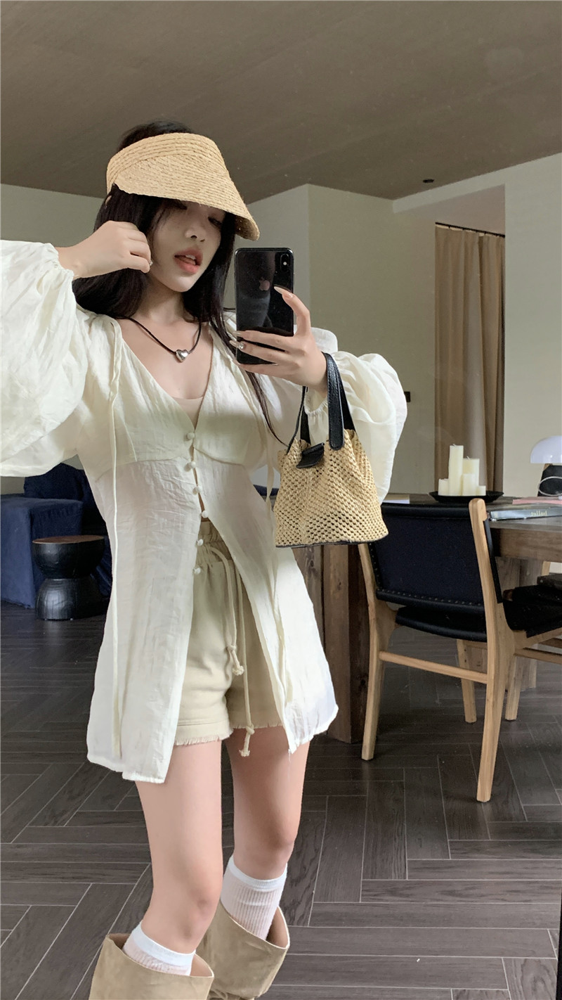 純色長袖雪紡襯衫女裝秋季V領泡泡袖薄款襯衫飄帶中長版防曬上衣