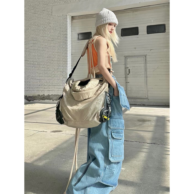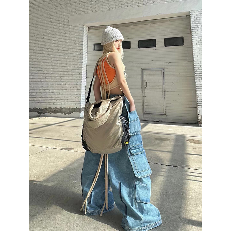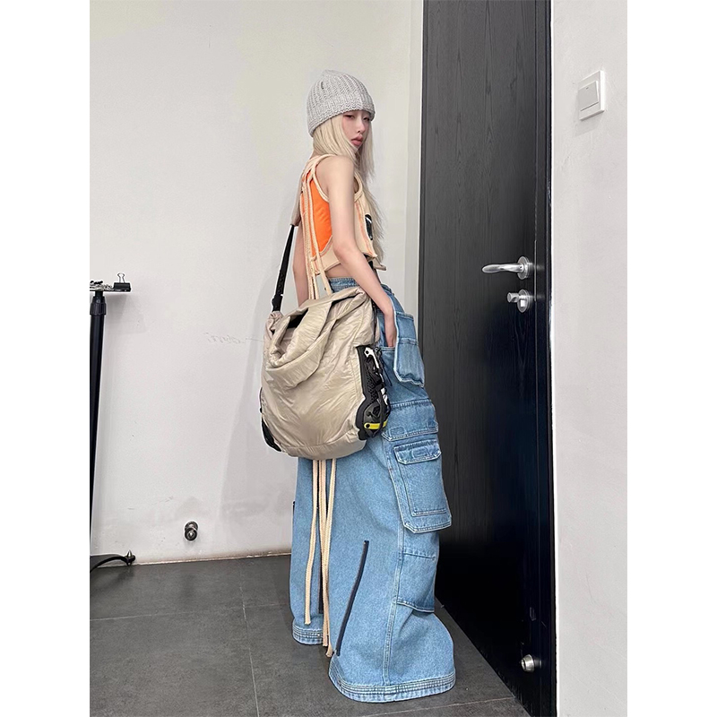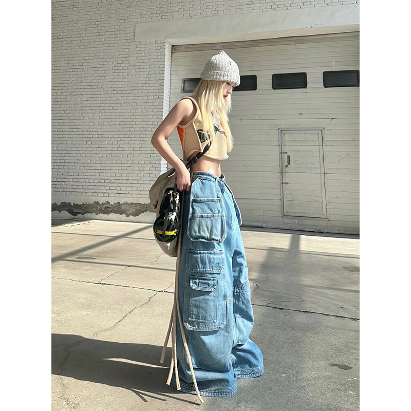 Turn up/陳腿兒 美式復古多口袋拼接牛仔褲女拉鍊寬鬆重工長褲ins