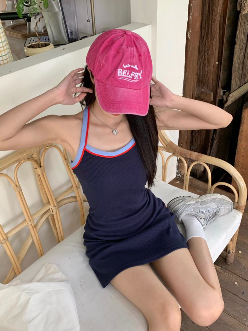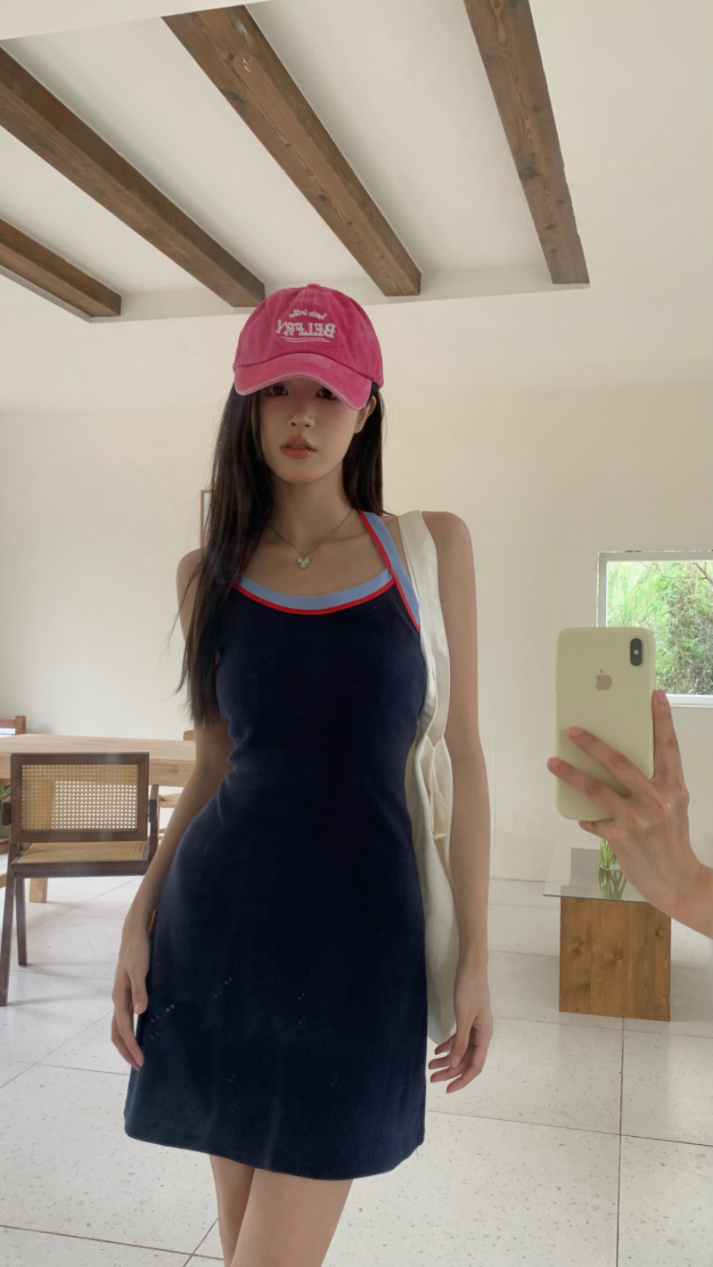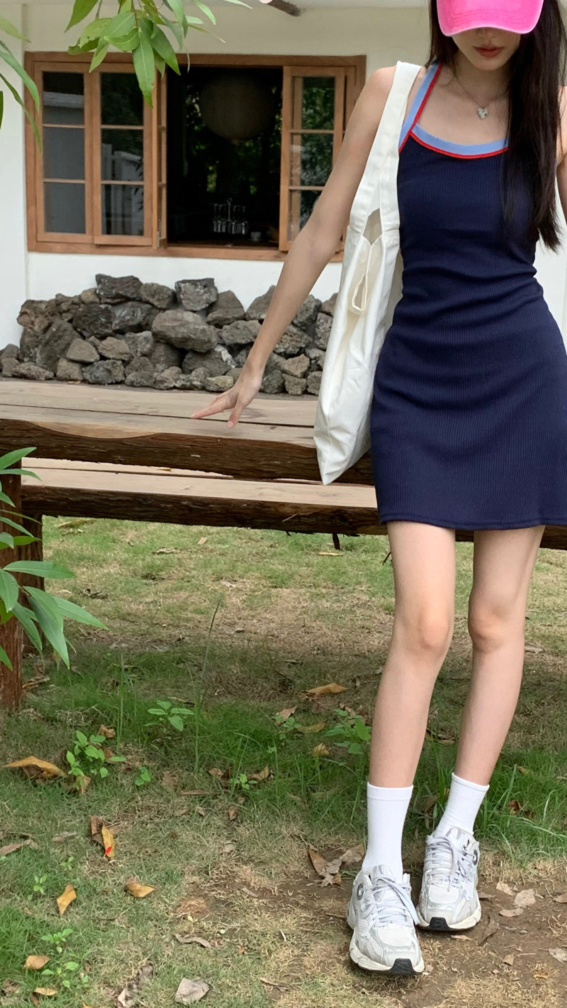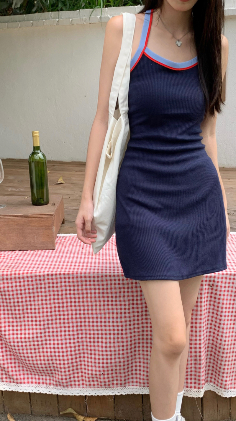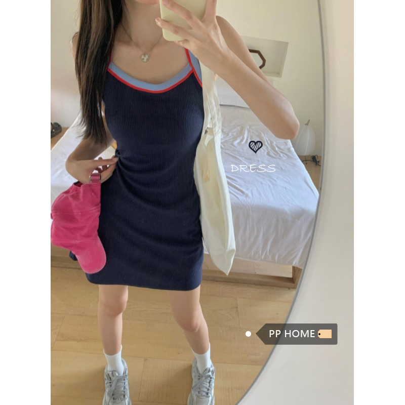 PPHOME甜喪酷妹~小清新百搭風洋裝撞色復古彈力吊帶吊帶裙