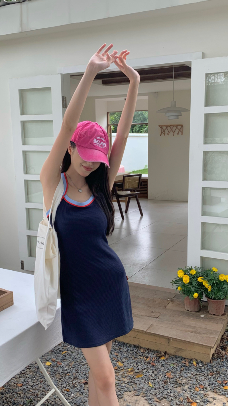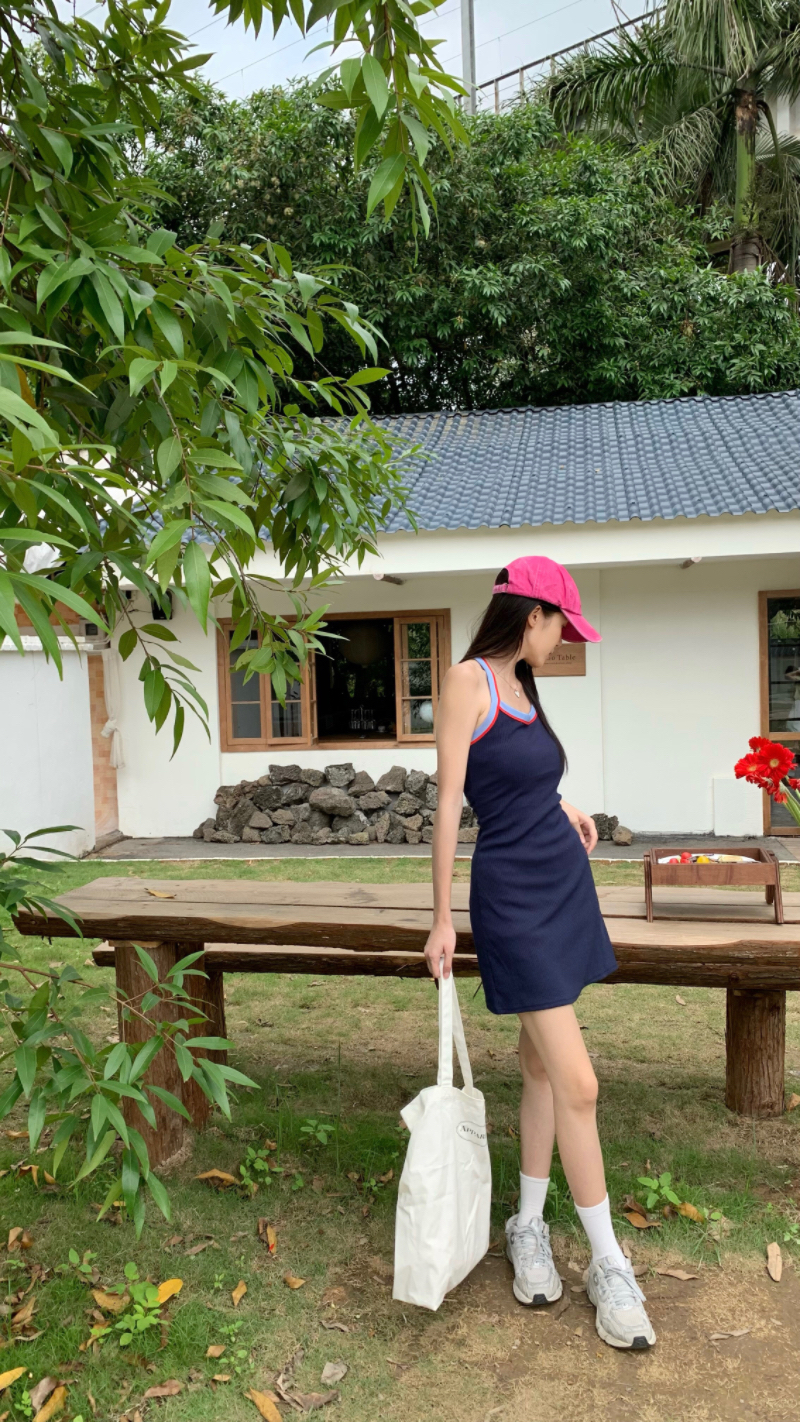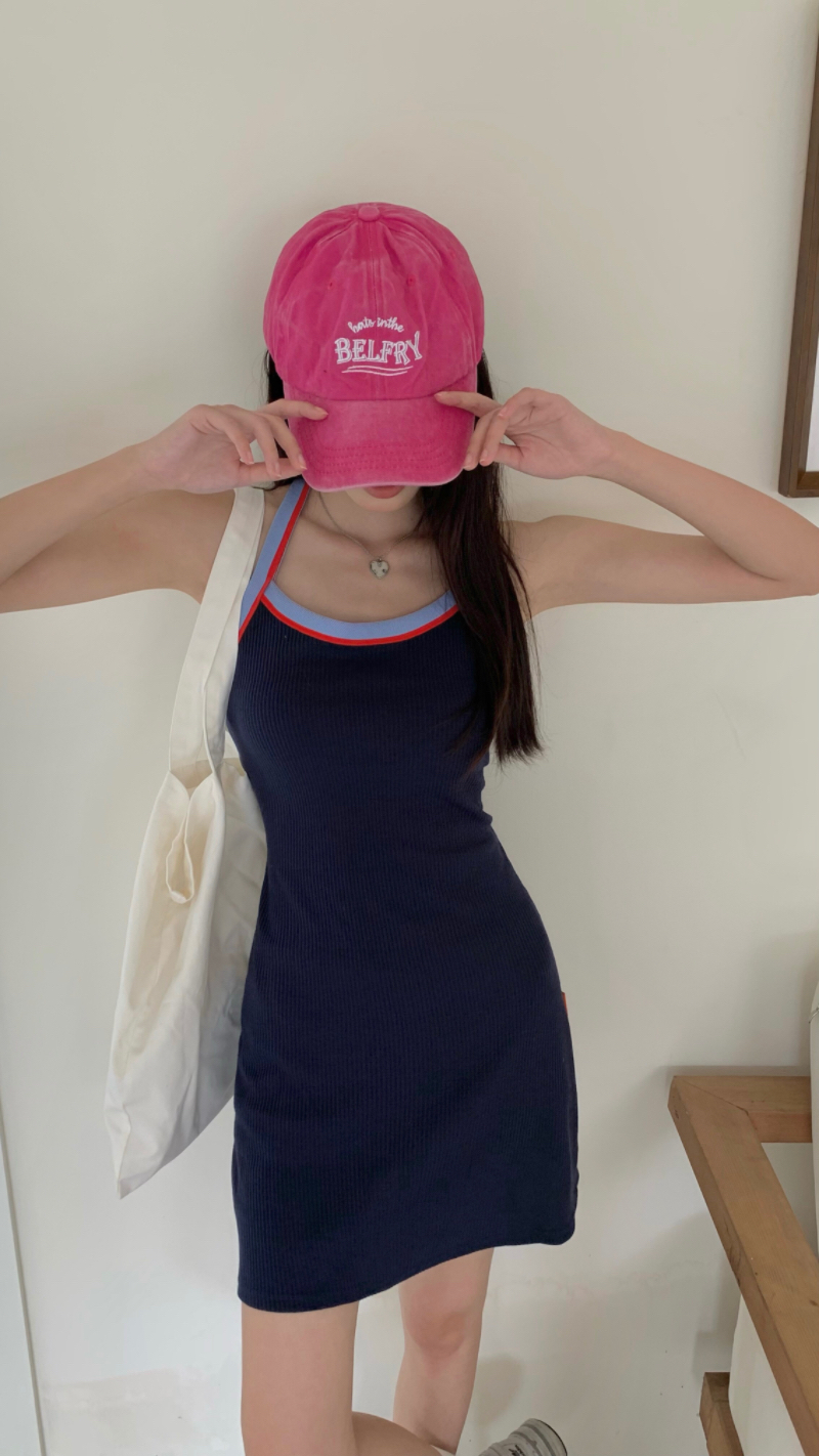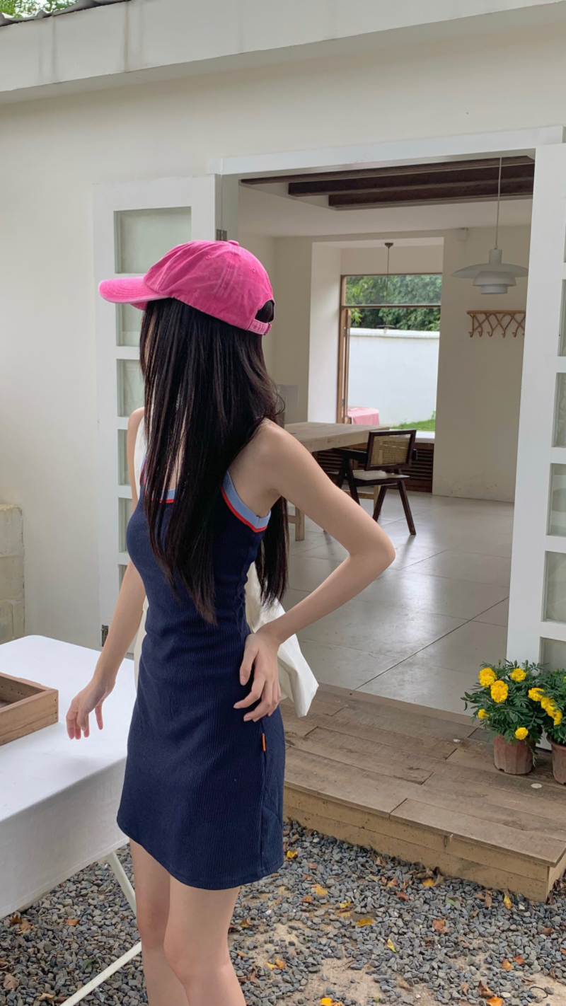 PPHOME甜喪酷妹~小清新百搭風洋裝撞色復古彈力吊帶吊帶裙