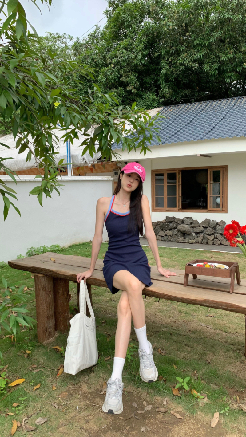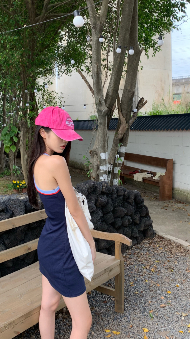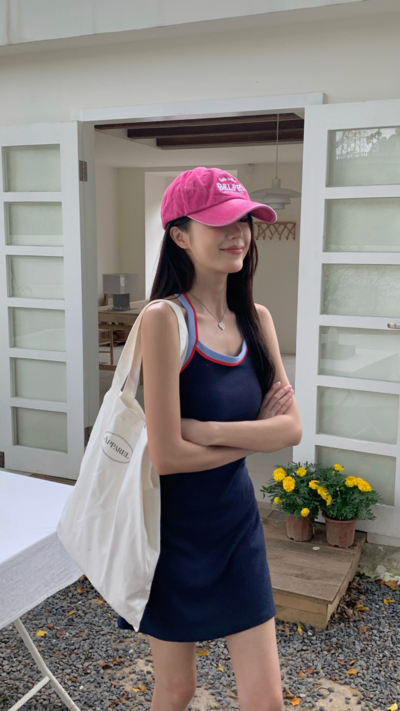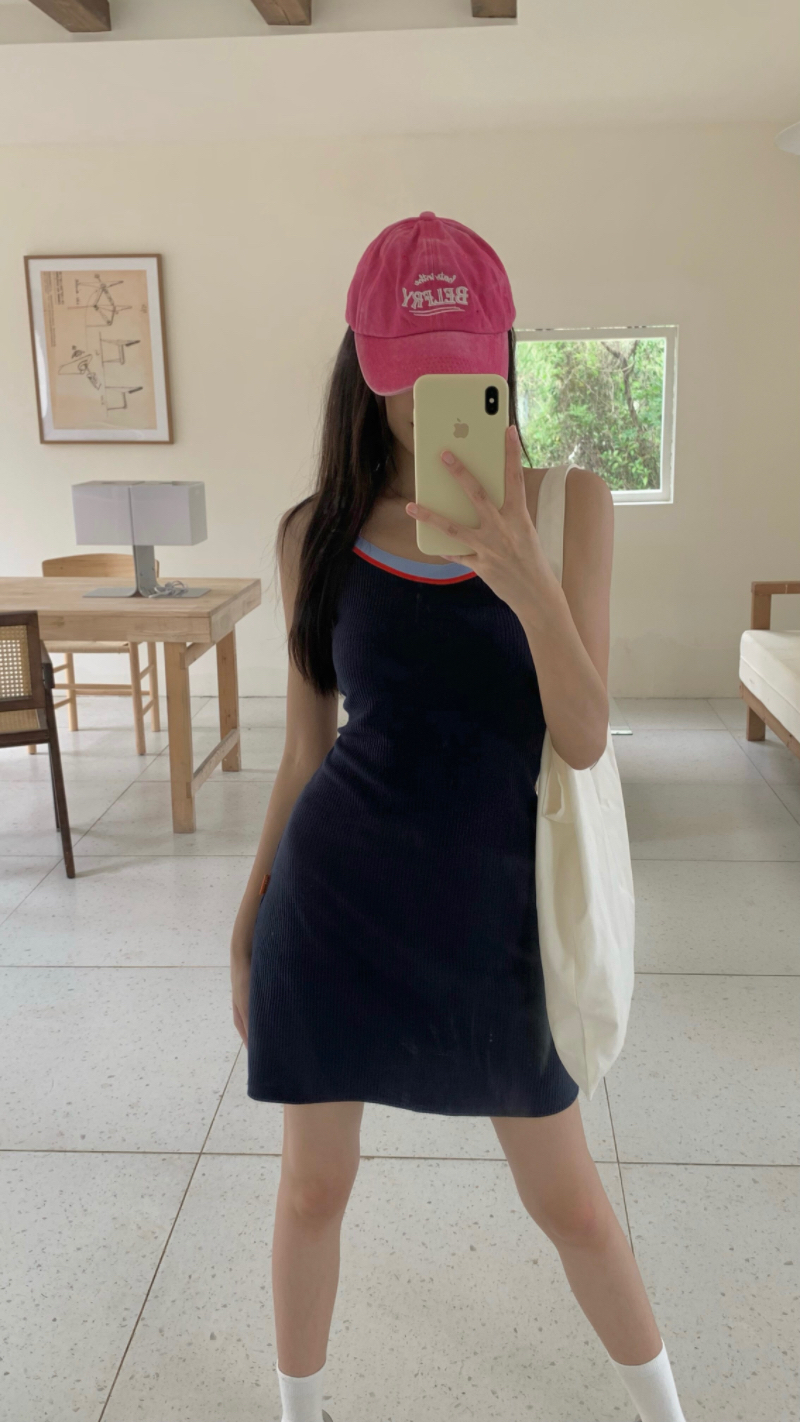 PPHOME甜喪酷妹~小清新百搭風洋裝撞色復古彈力吊帶吊帶裙