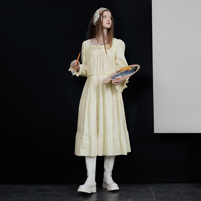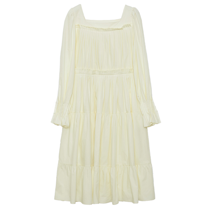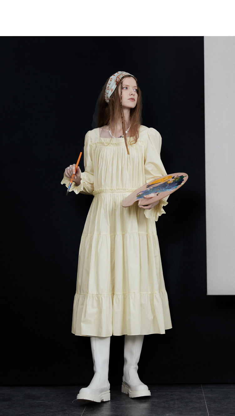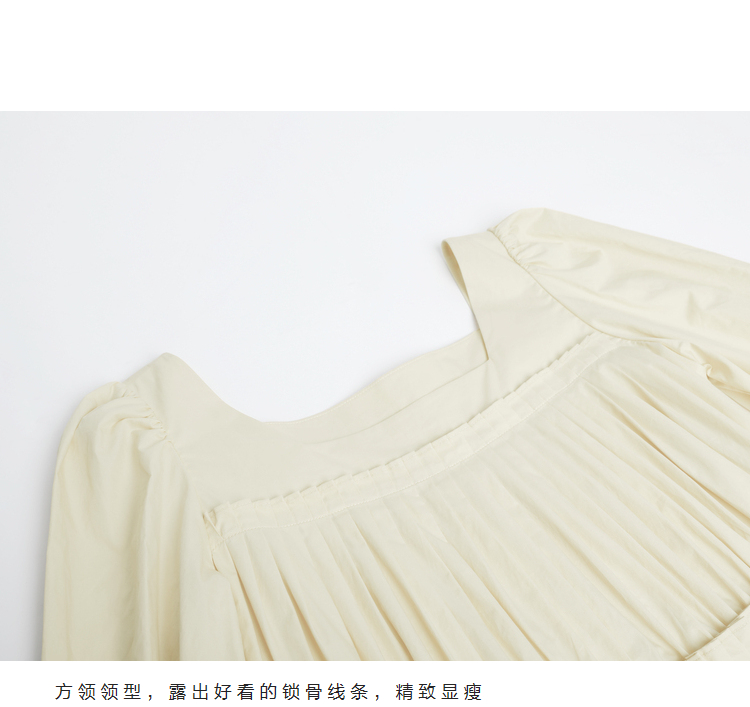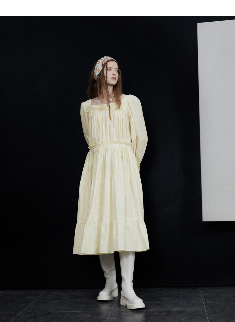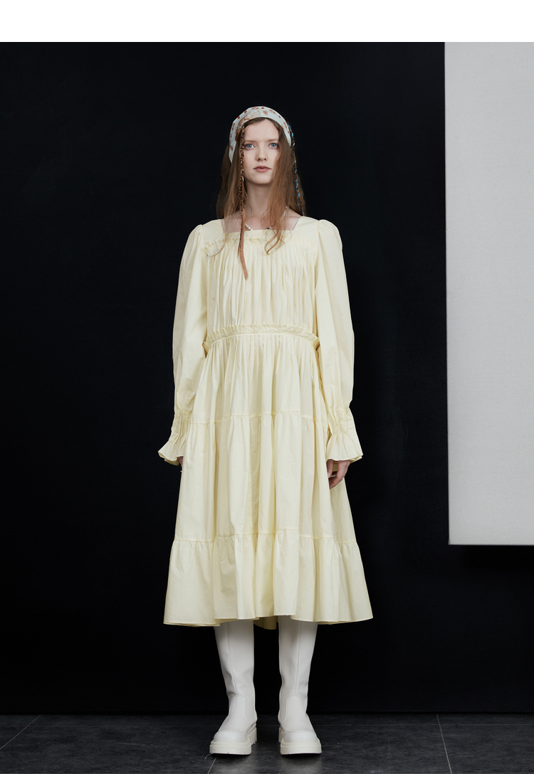 半圓原創設計2023春秋季新款泡泡袖裙子壓褶簡約長版洋裝小眾女