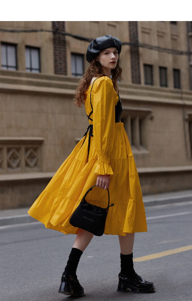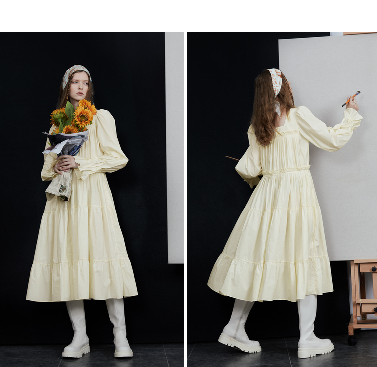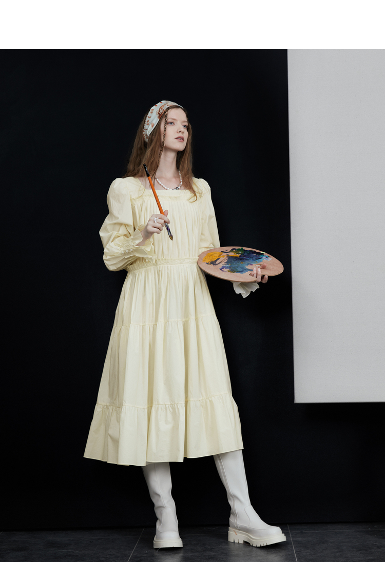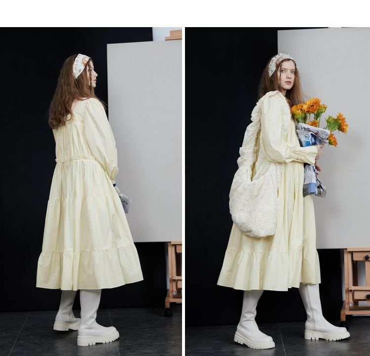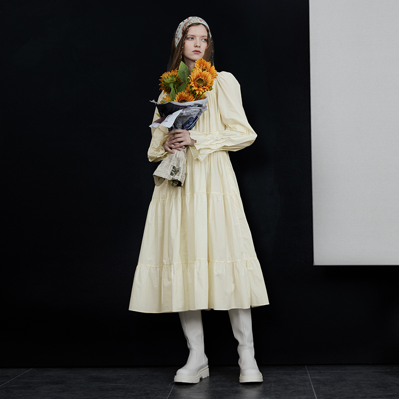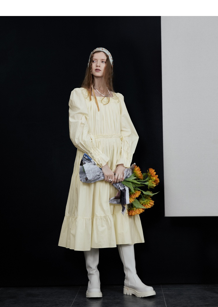 半圓原創設計2023春秋季新款泡泡袖裙子壓褶簡約長版洋裝小眾女