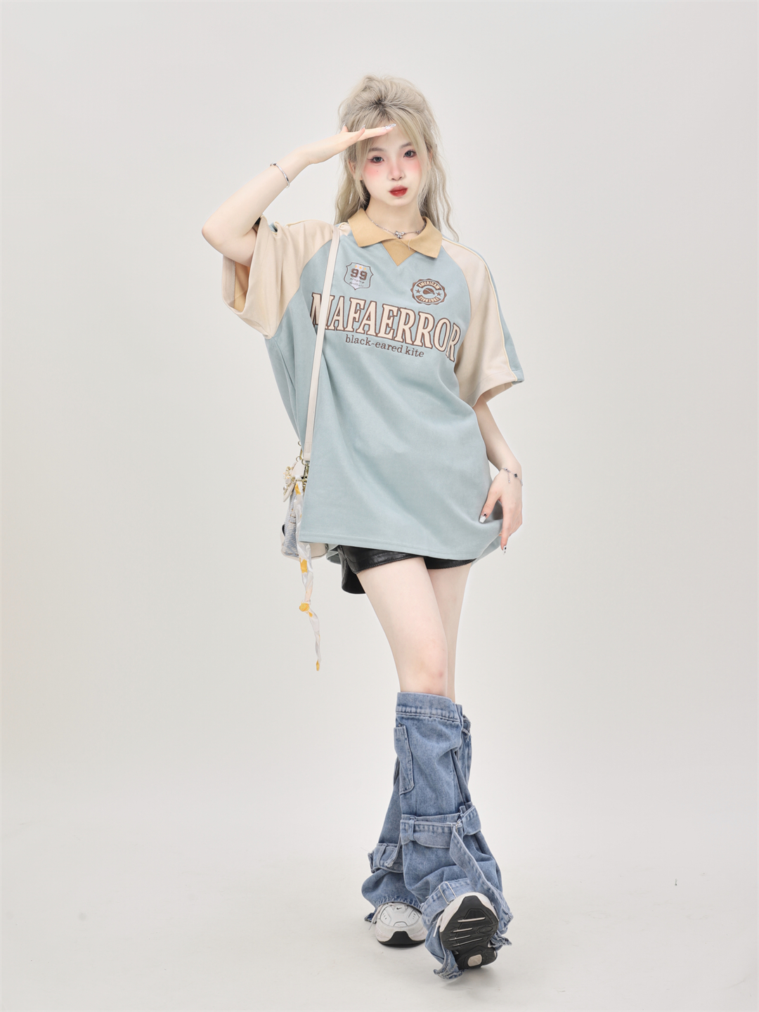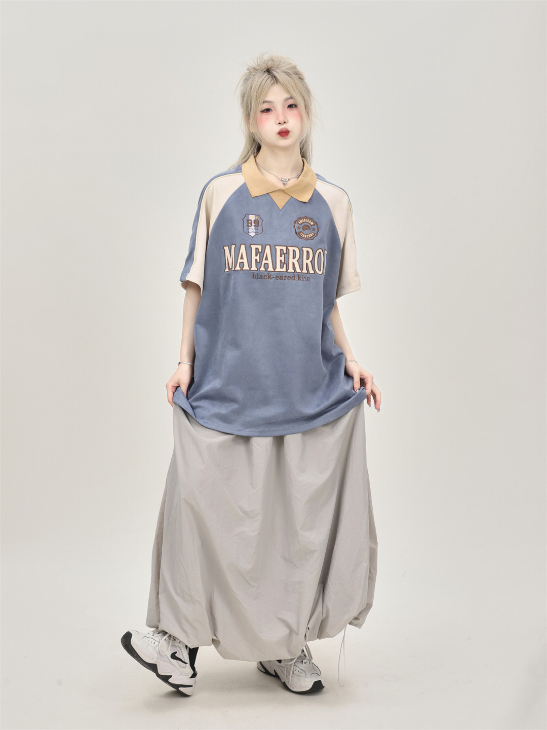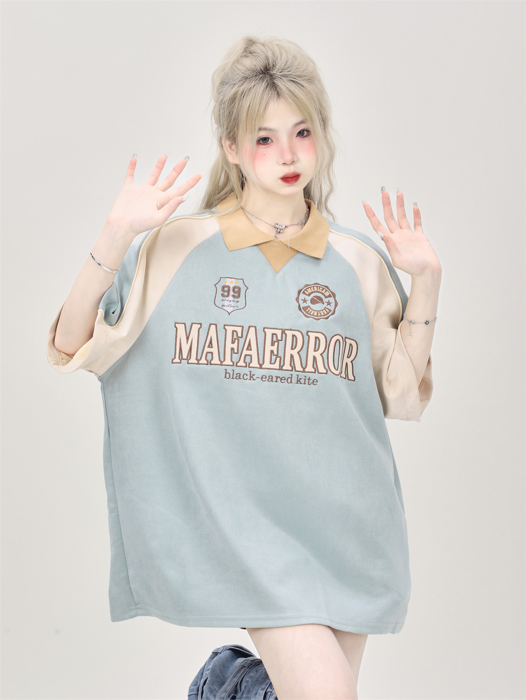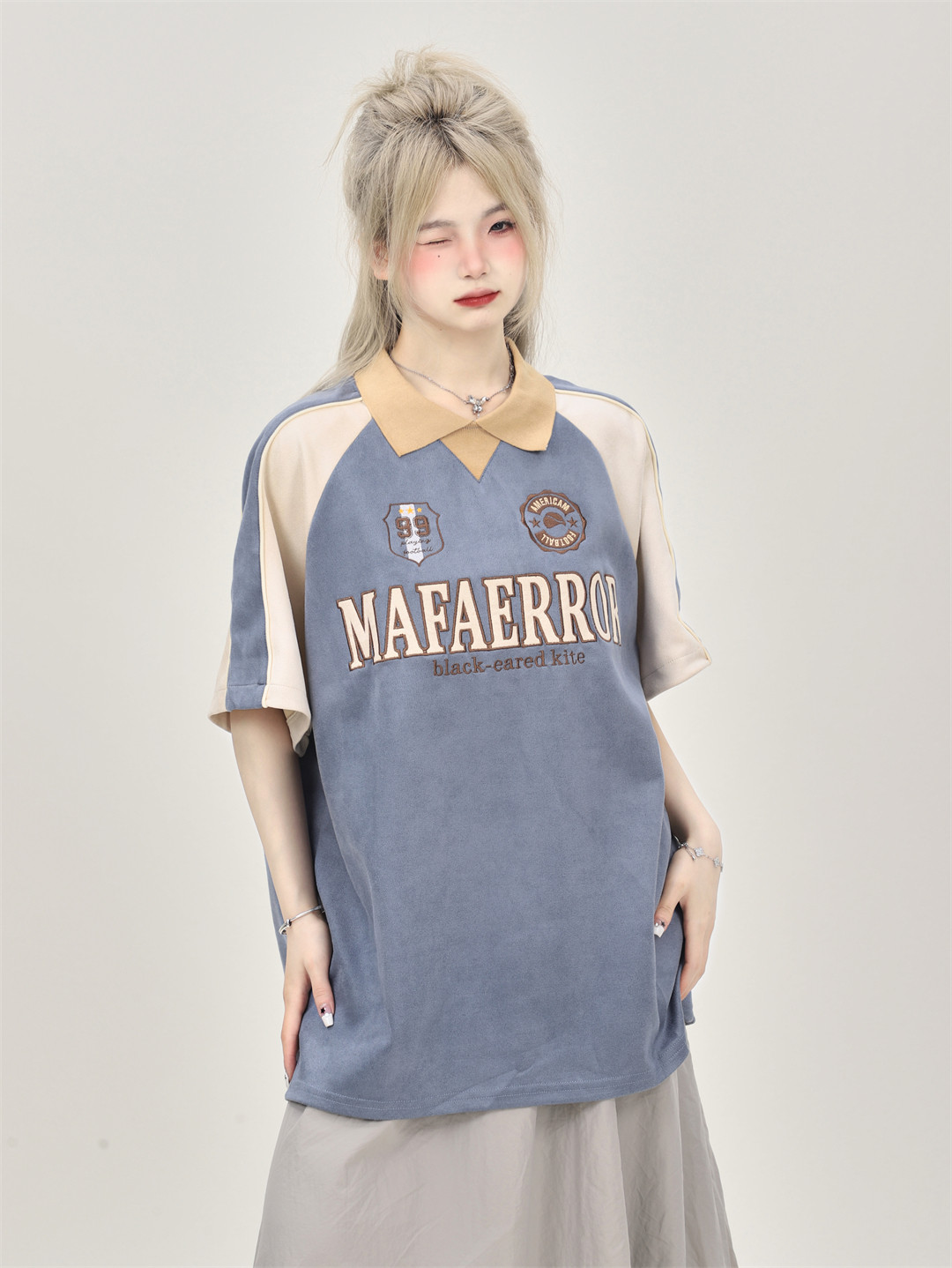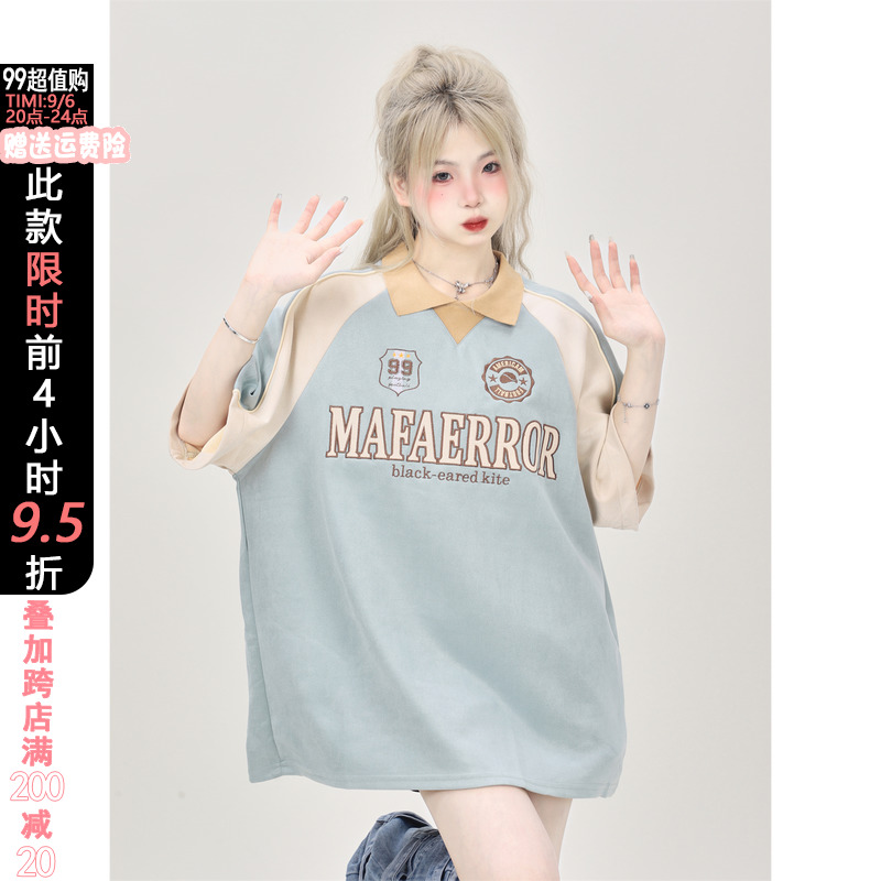 原創設計感小眾美式復古拼接撞色麂皮絨翻領polo領短袖T恤女寬鬆