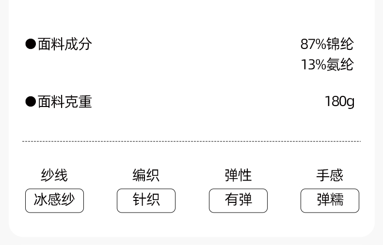 材質成分 聚酰胺纖維(尼龍)87% 聚氨酯彈性纖維(氨綸)13%