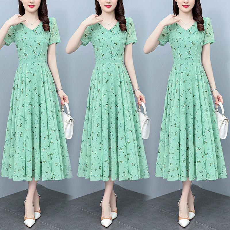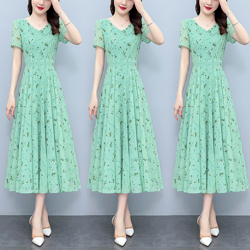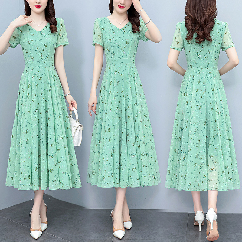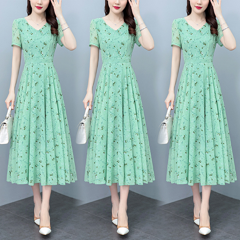 2023夏季新款V领碎花雪纺连衣裙长款大码胖mm收腰显瘦遮肚子长裙