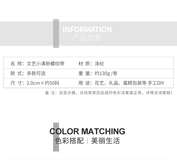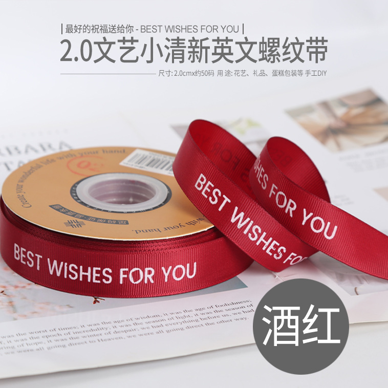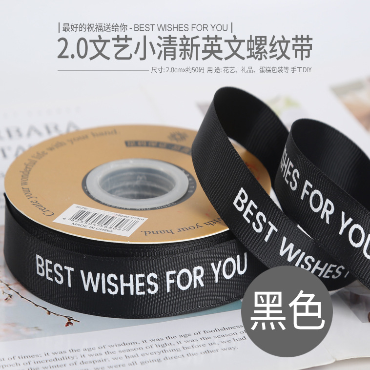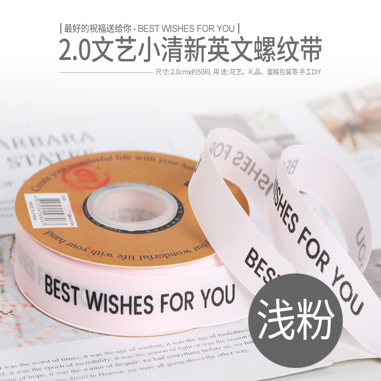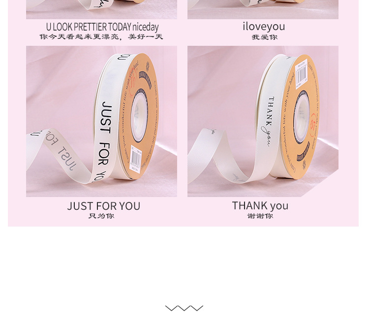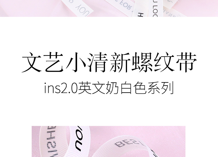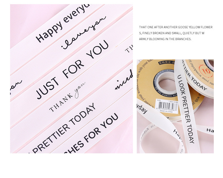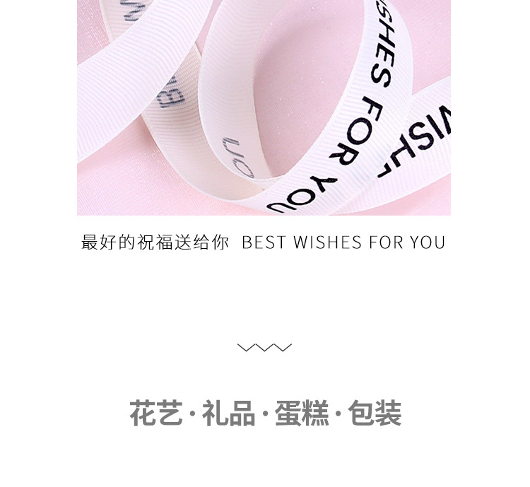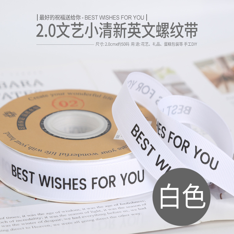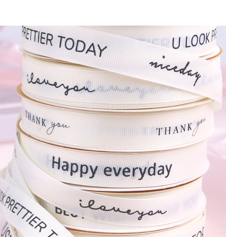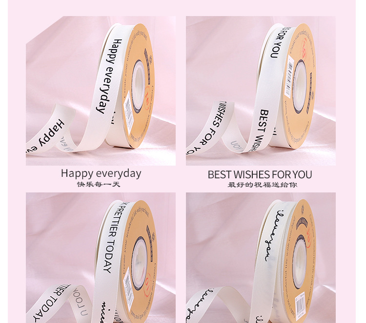颜色 1# 【Happy everyday-开心每一天】2.0cm宽*50码长(约45米),2# 【BEST WISHES FOR YOU-最好的祝福送给你】2.0cm宽*50码长(约45米),3# 【U LOOK PRETTIER TODAY niceday-你今天看起来更漂亮】2.0cm宽,4# 【iloveyou-我爱你】2.0cm宽*50码长(约45米),5# 【JUST FOR YOU-只有你】2.0cm宽*50码长(约45米),6# 【THANK you-谢谢你】2.0cm宽*50码长(约45米),BEST-WISHES-白色2.0cm宽*50码长(约45米),BEST-WISHES-黑色2.0cm宽*50码长(约45米),BEST-WISHES-浅粉2.0cm宽*50码长(约45米),BEST-WISHES-酒红2.0cm宽*50码长(约45米),烫金螺纹带【奶白1.0cm宽*45码长(约41米)】,烫金螺纹带【奶白2.5cm宽*50码长(约45米)】,纯色涤纶带【米白2.5cm宽*50码长(约45米)】,高密涤纶带【米白2.5cm宽*100码(约91米)】,纯色缎带【米黄2.0cm宽*25码长(约22米)】